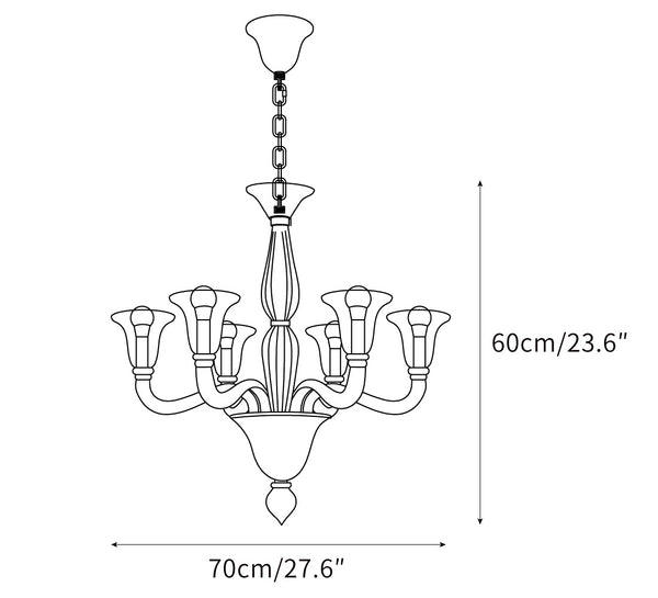 "Agregue un brillo encantador con nuestra lámpara de araña de Murano. Fabricada en hierro negro con elegantes pantallas de cristal, esta lámpara de araña es la combinación perfecta de lo clásico y lo contemporáneo. Ilumine cualquier habitación y cree una atmósfera acogedora con esta pieza única y elegante".