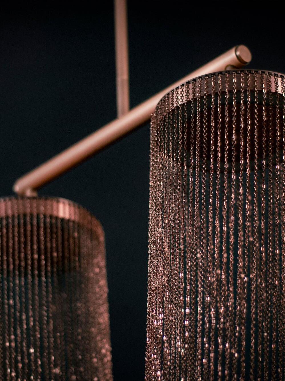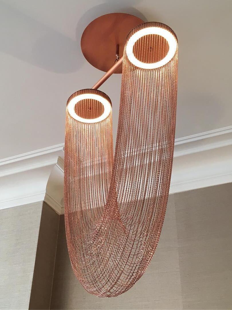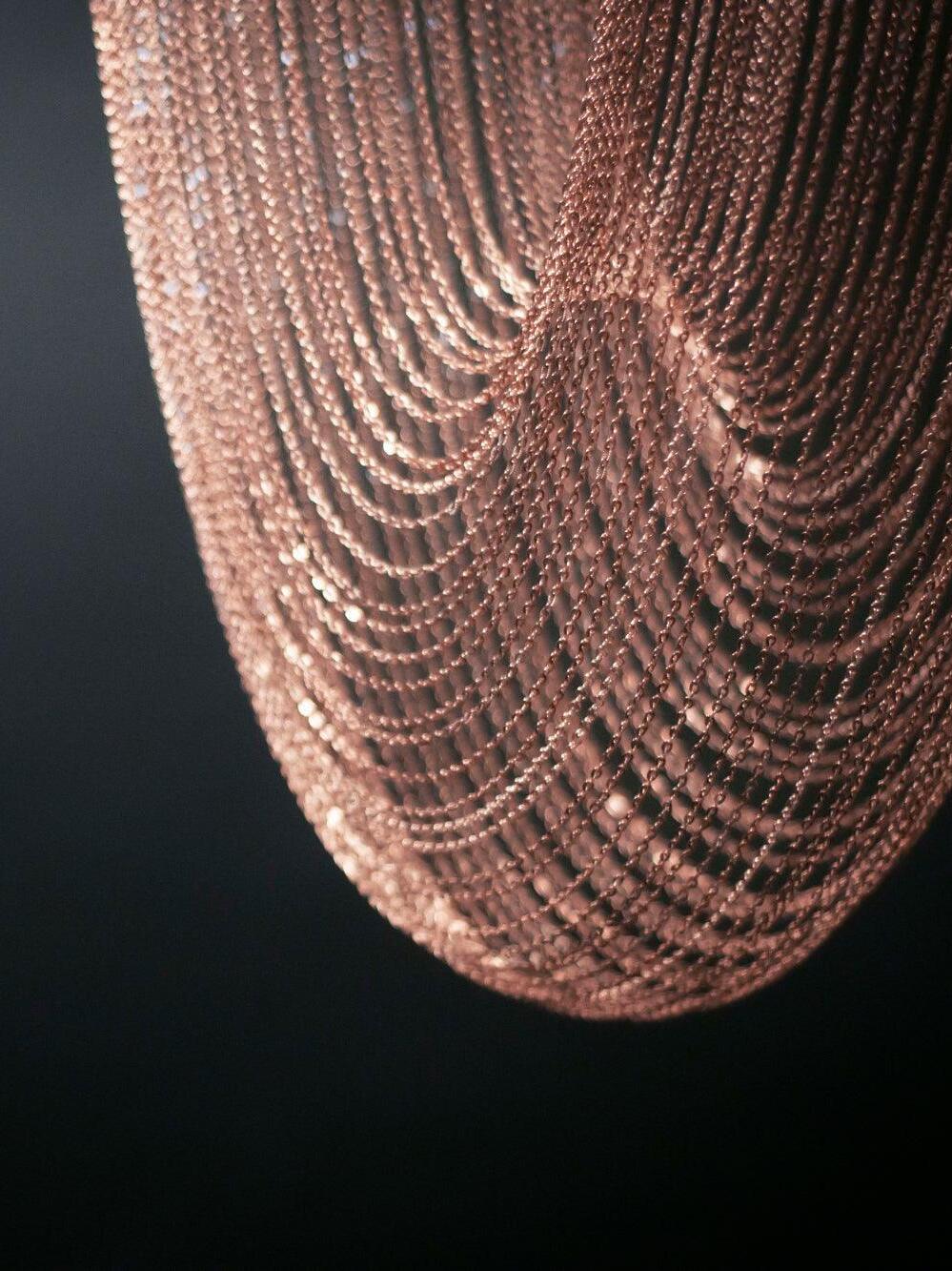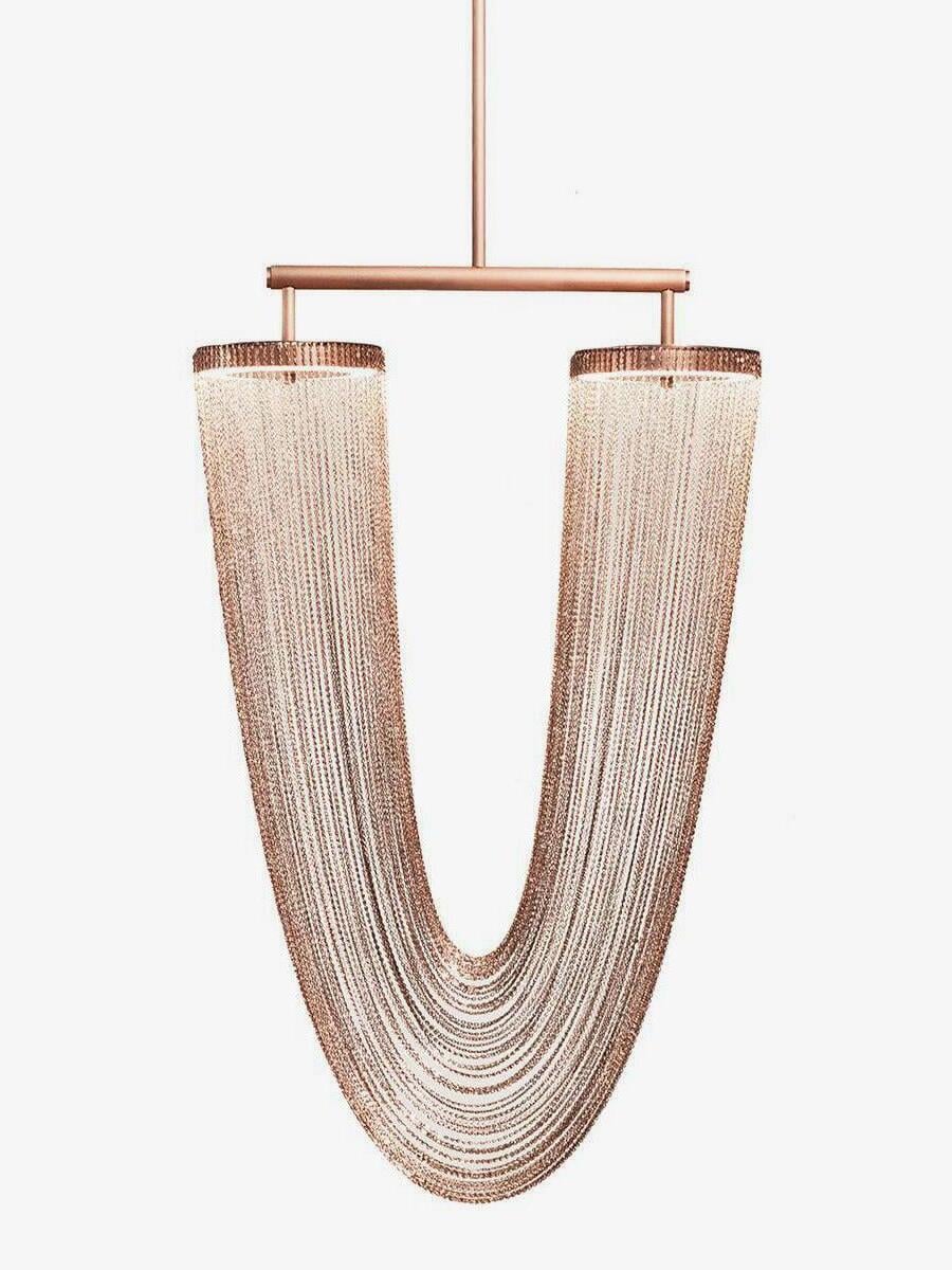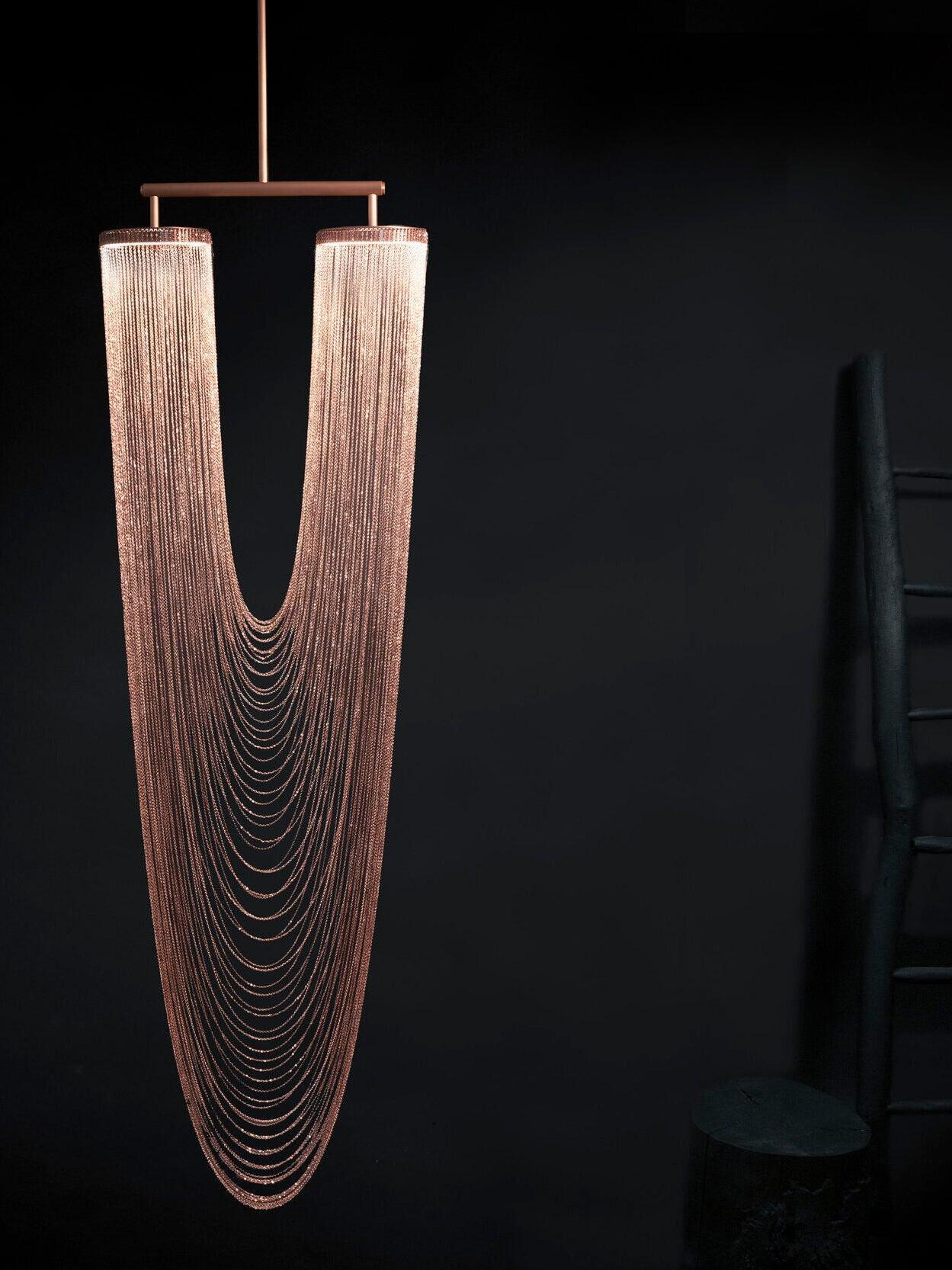 Es con una belleza poética capturada en este lujoso accesorio de iluminación de alta gama que ha sido recubierto con calidez y elegancia, que infectará su vida diaria. Esta lámpara escultural está hecha a mano con delicadas cadenas de cobre para crear una forma curva única y elegante inspirada en el romántico mundo de la joyería. La luz proviene de dos anillos de cobre y atraviesa las cadenas para crear una atmósfera mágica.