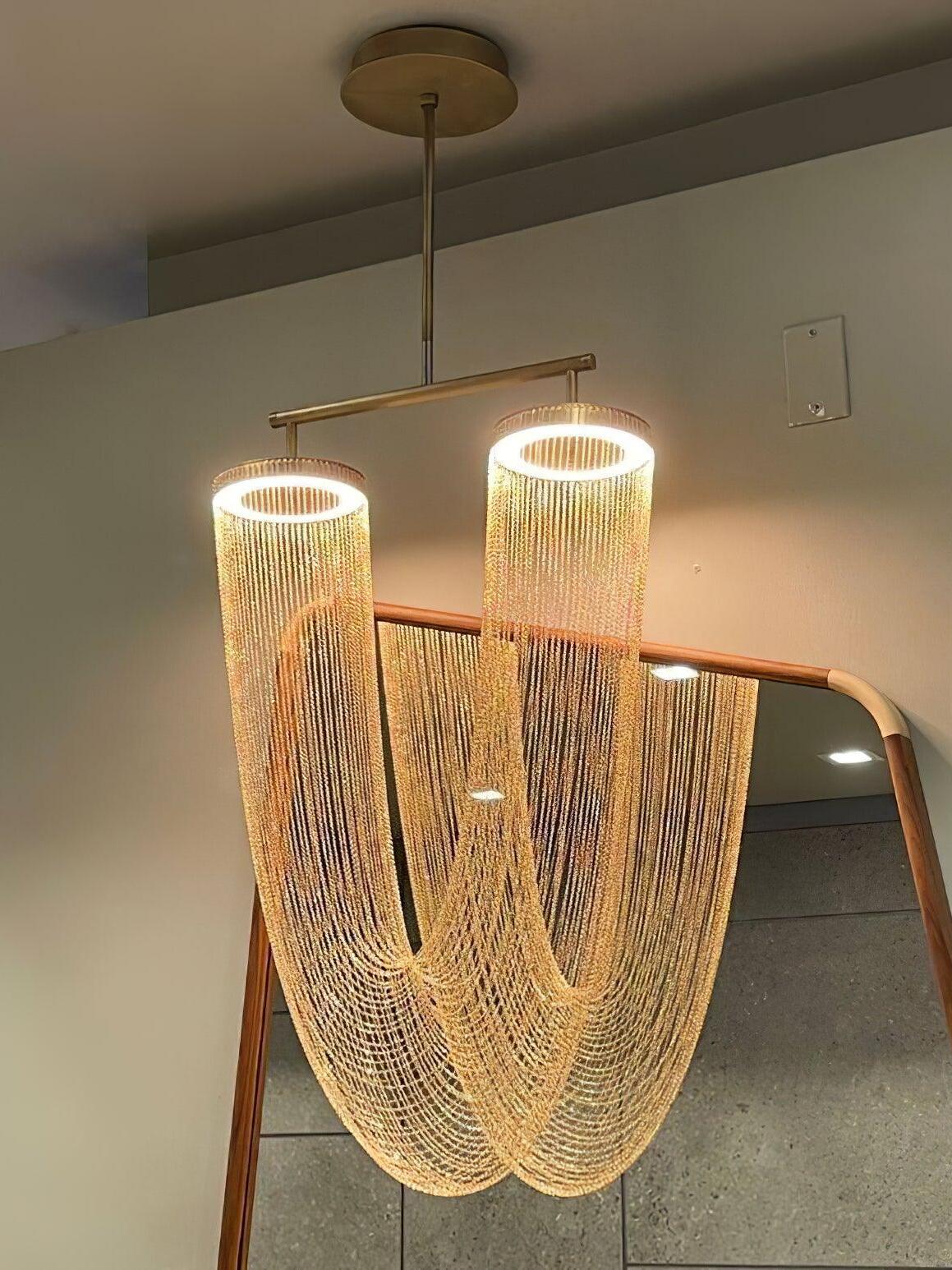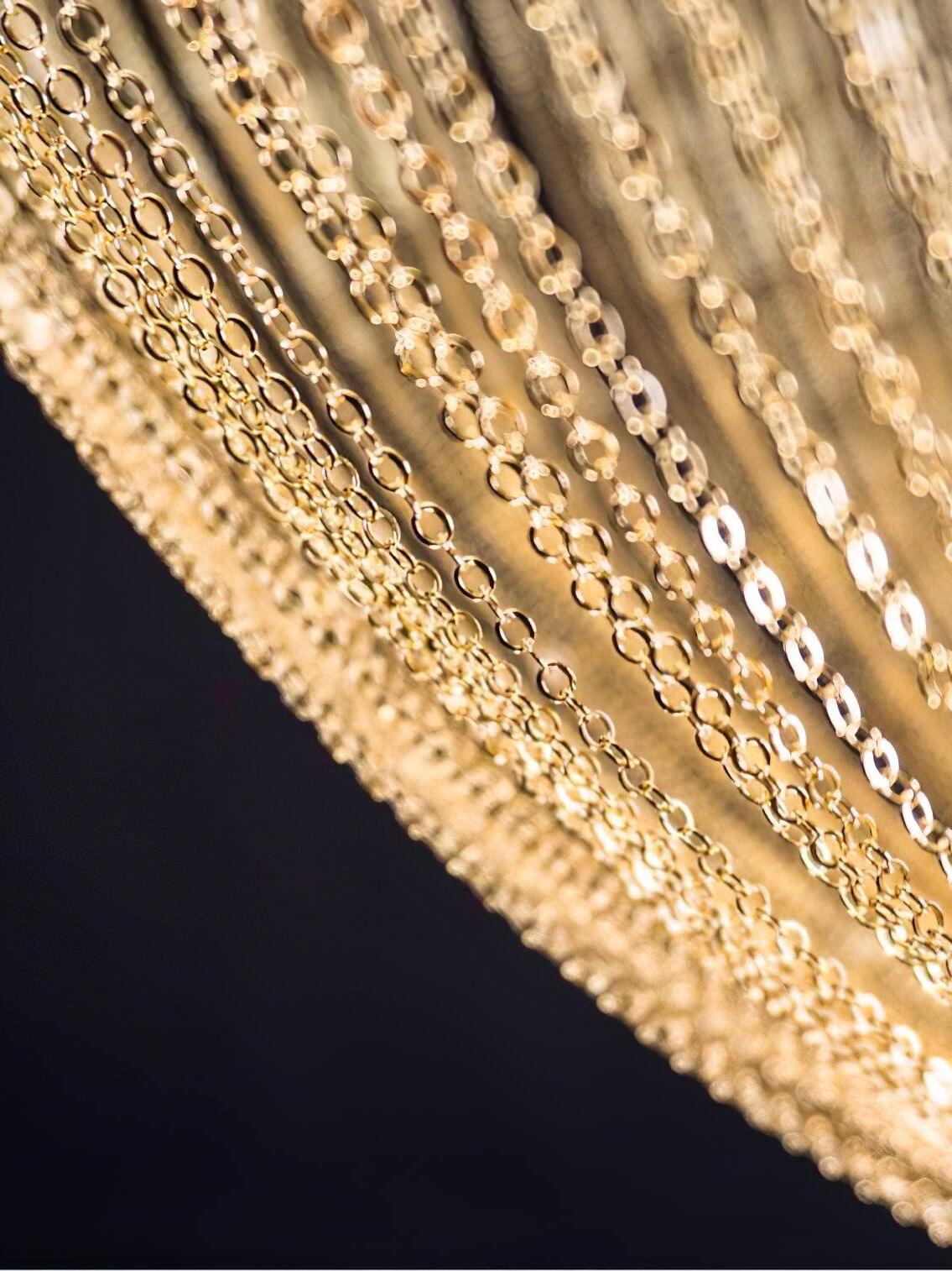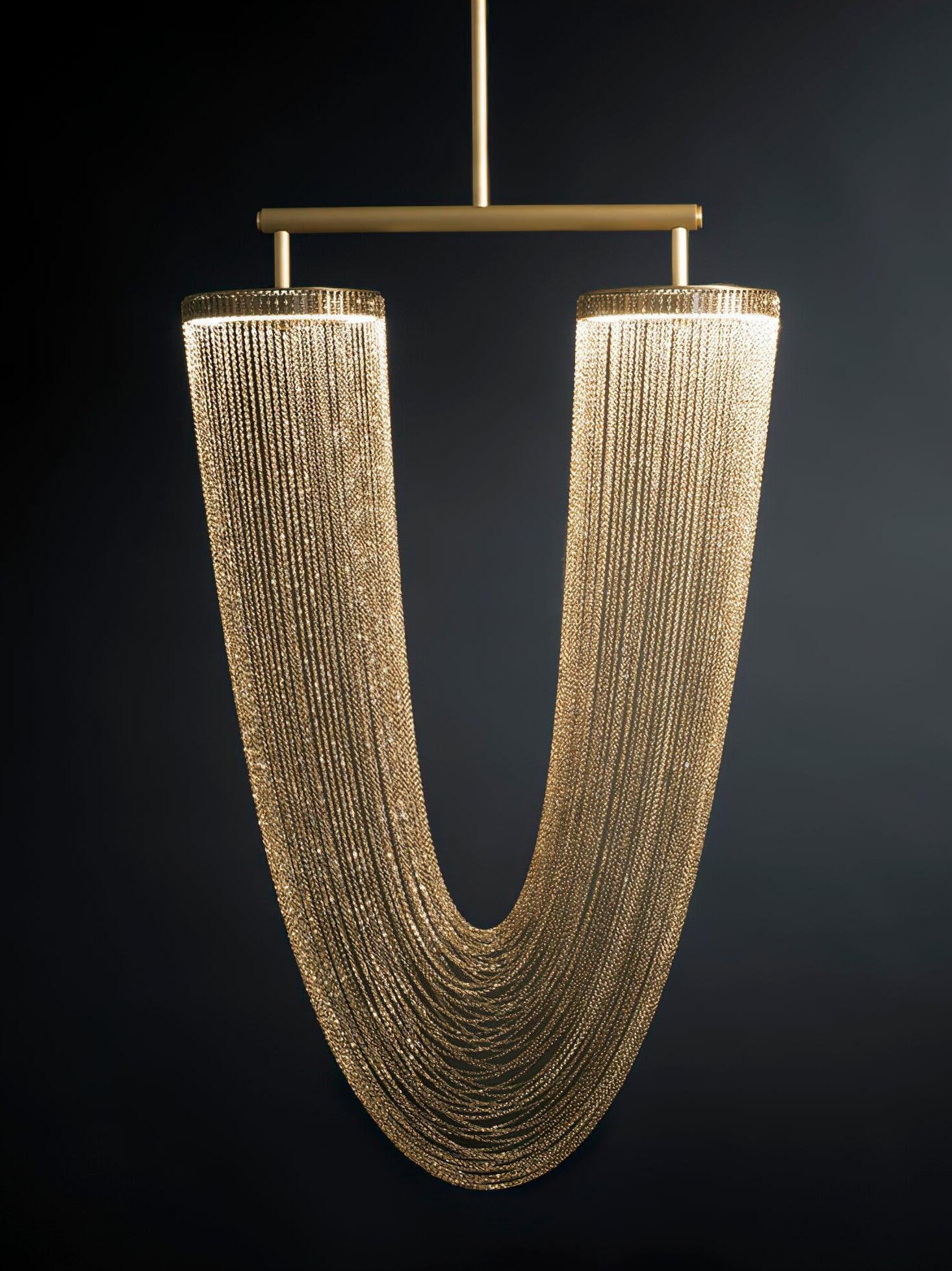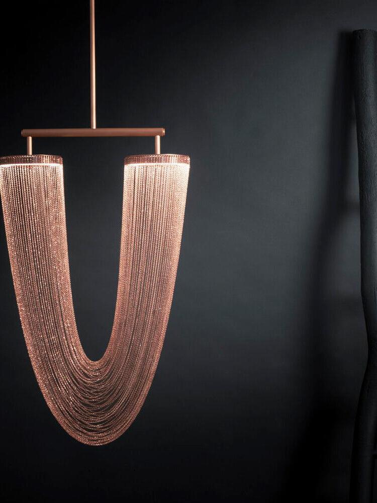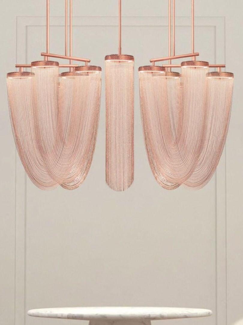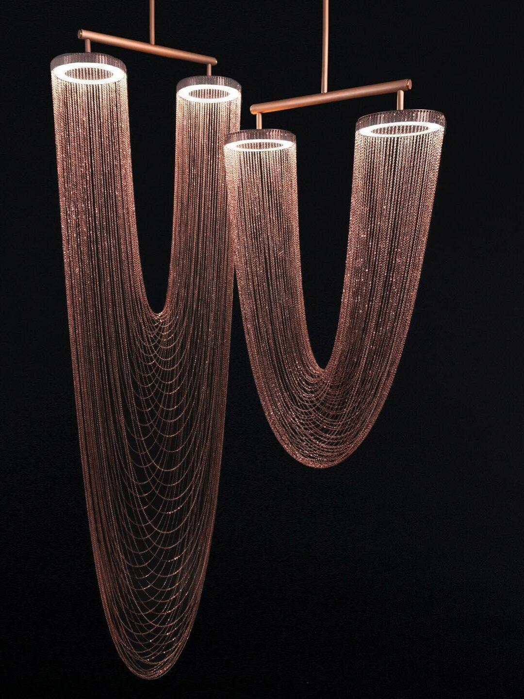 Es con una belleza poética capturada en este lujoso accesorio de iluminación de alta gama que ha sido recubierto con calidez y elegancia, que infectará su vida diaria. Esta lámpara escultural está hecha a mano con delicadas cadenas de cobre para crear una forma curva única y elegante inspirada en el romántico mundo de la joyería. La luz proviene de dos anillos de cobre y atraviesa las cadenas para crear una atmósfera mágica.