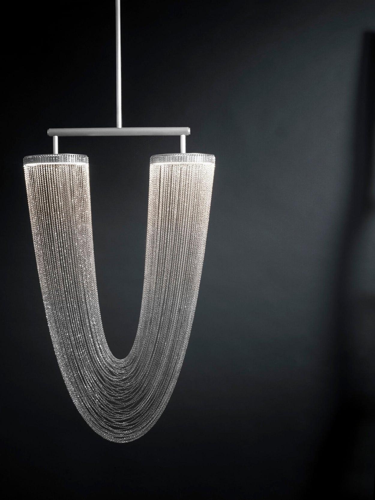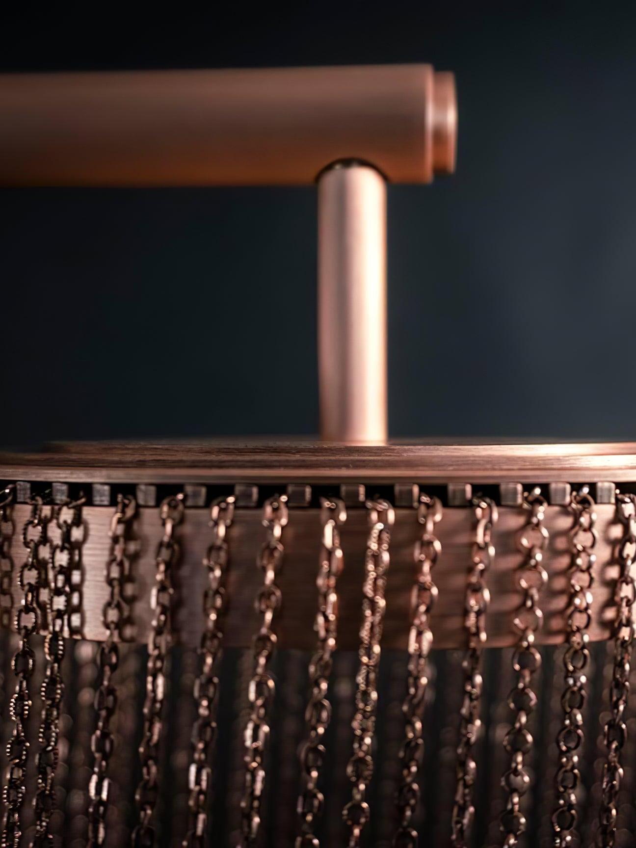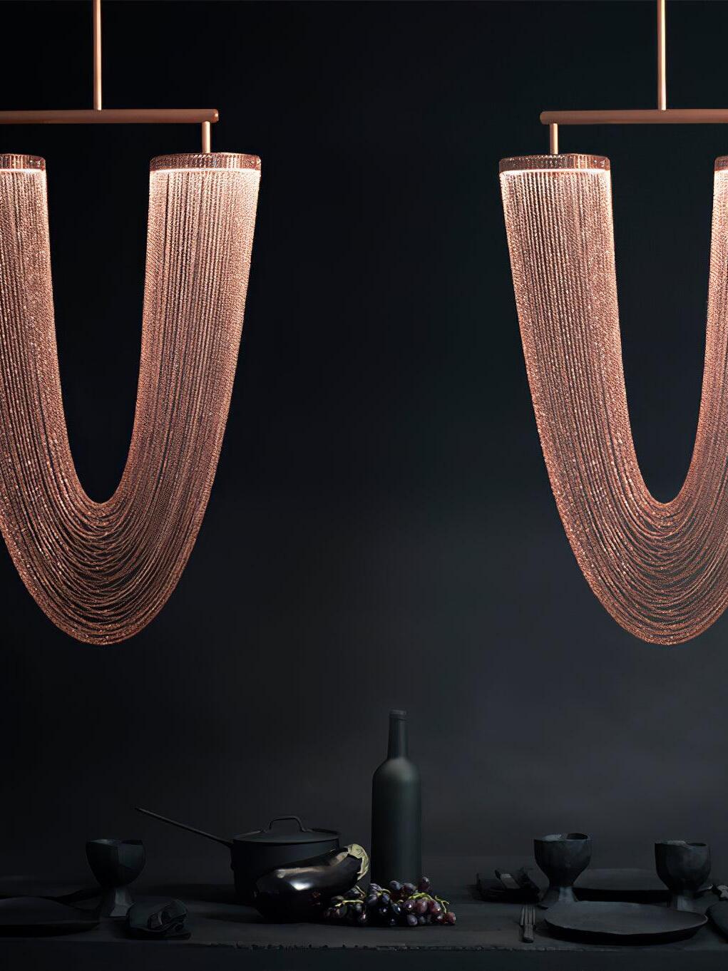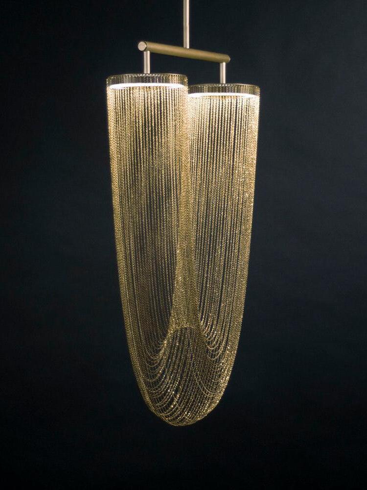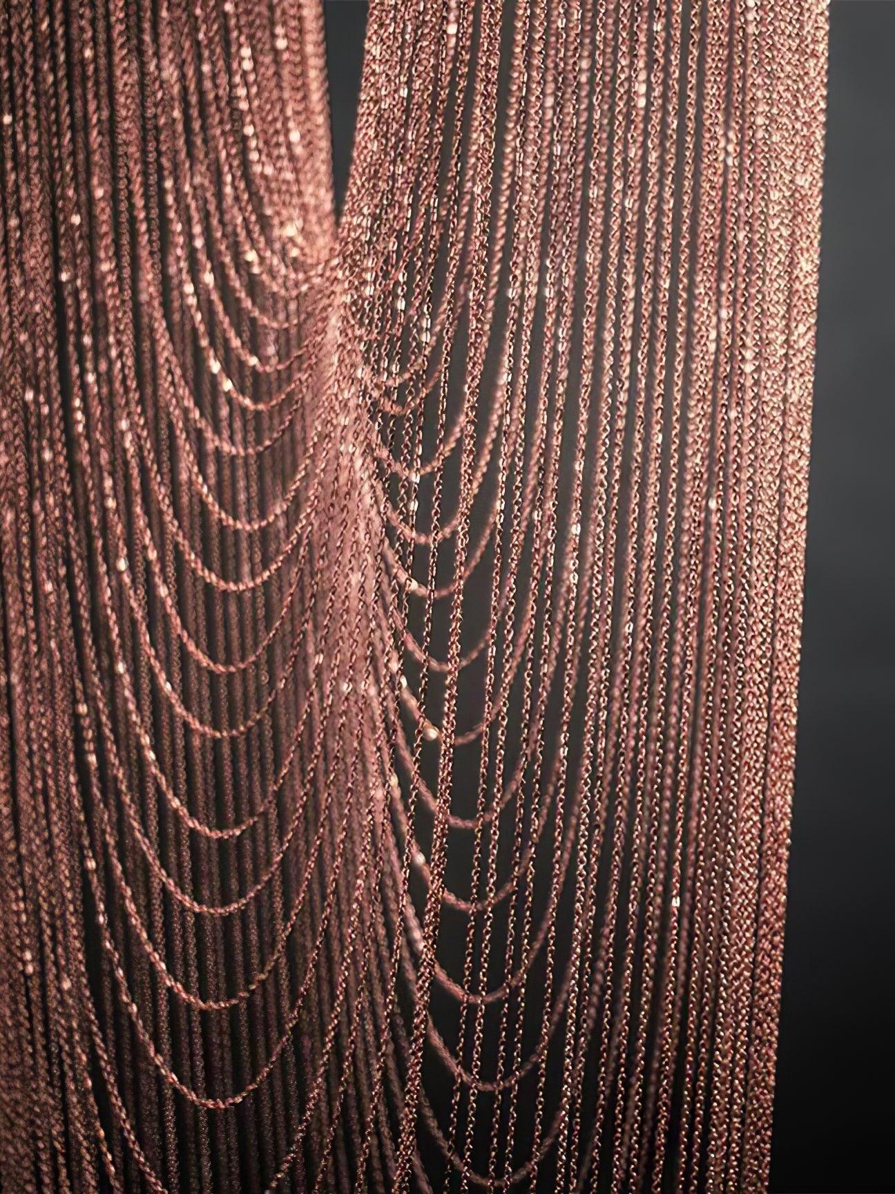 Es con una belleza poética capturada en este lujoso accesorio de iluminación de alta gama que ha sido recubierto con calidez y elegancia, que infectará su vida diaria. Esta lámpara escultural está hecha a mano con delicadas cadenas de cobre para crear una forma curva única y elegante inspirada en el romántico mundo de la joyería. La luz proviene de dos anillos de cobre y atraviesa las cadenas para crear una atmósfera mágica.