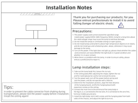 | Tenga en cuenta que puede haber un error de 1 a 3 cm en el tamaño debido a la medición manual. Las imágenes pueden tener un ligero cromatismo debido a la luz y al monitor. Agradecemos de antemano su comprensión. Se recomienda que la instalación de la lámpara la realice un electricista profesional. | |