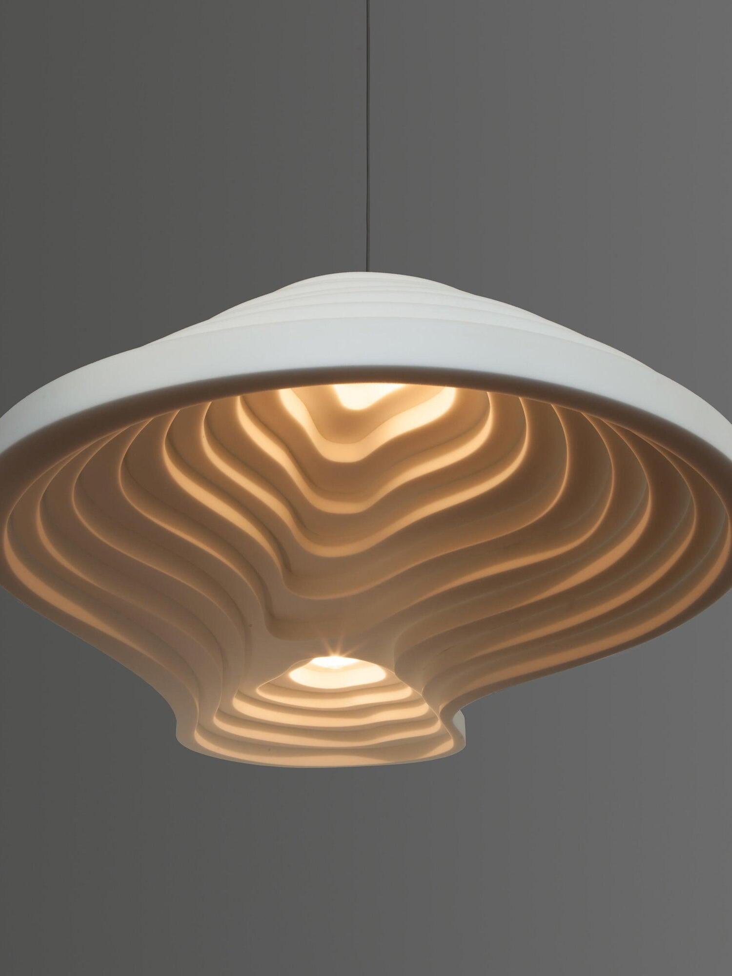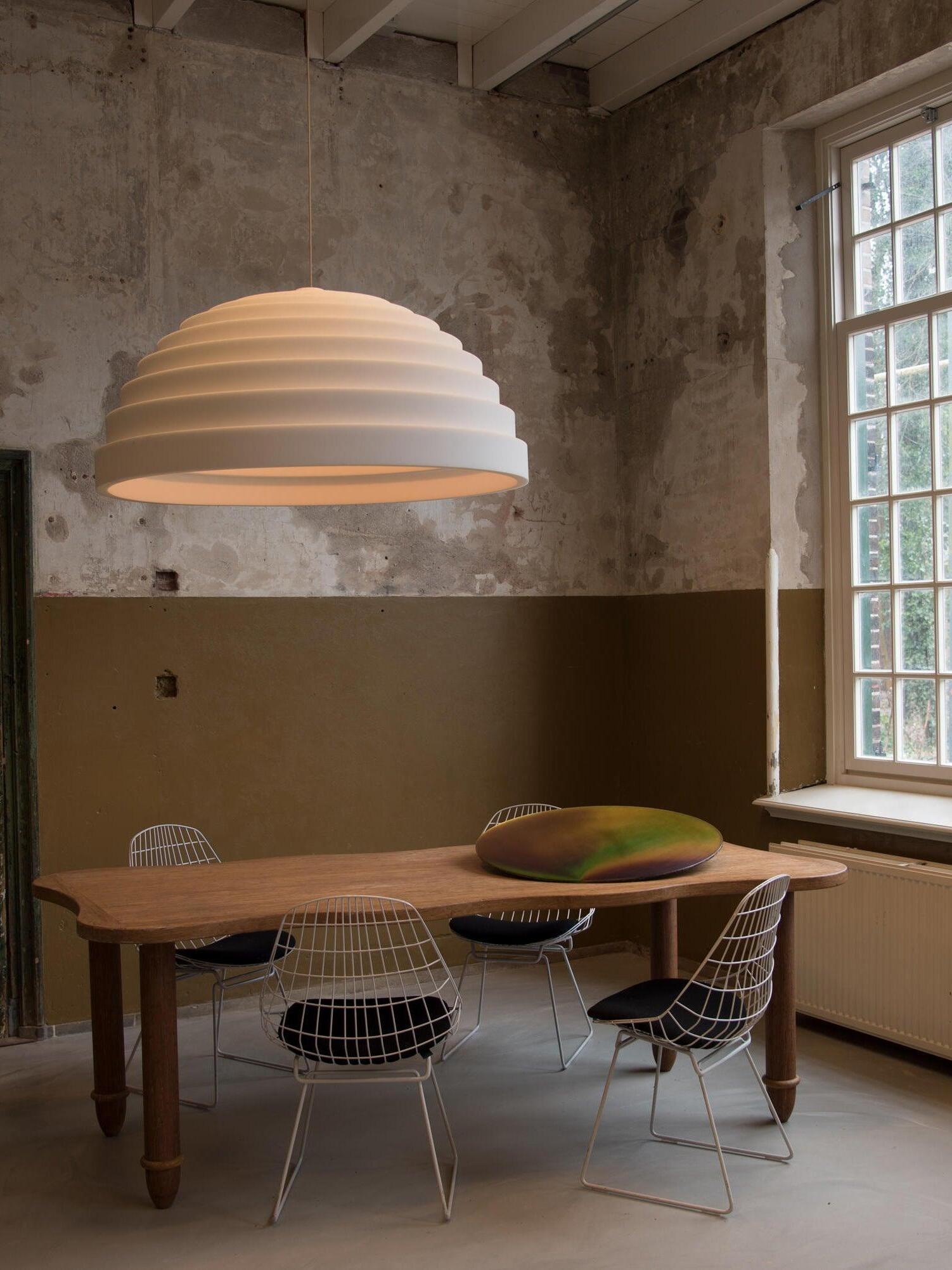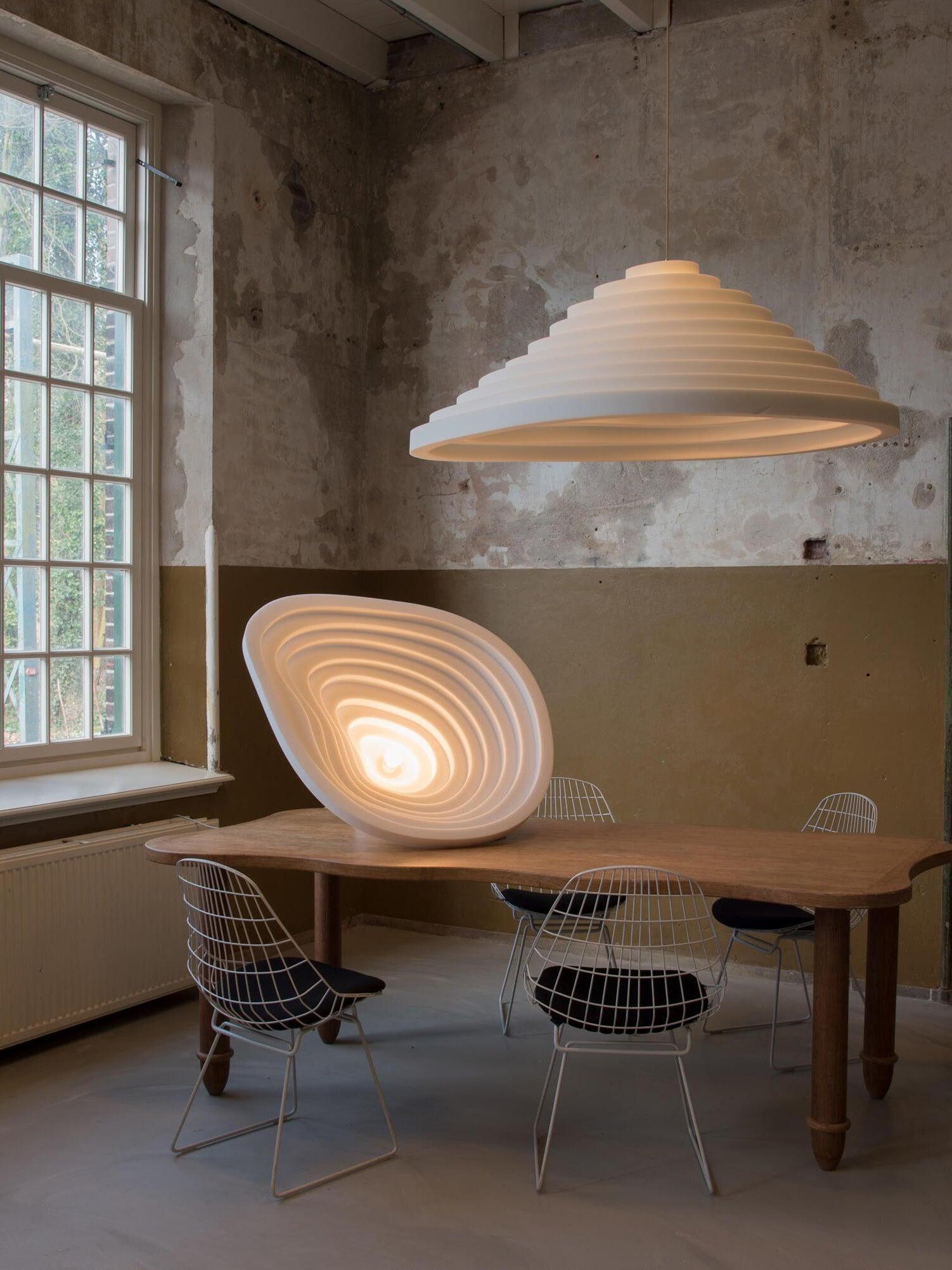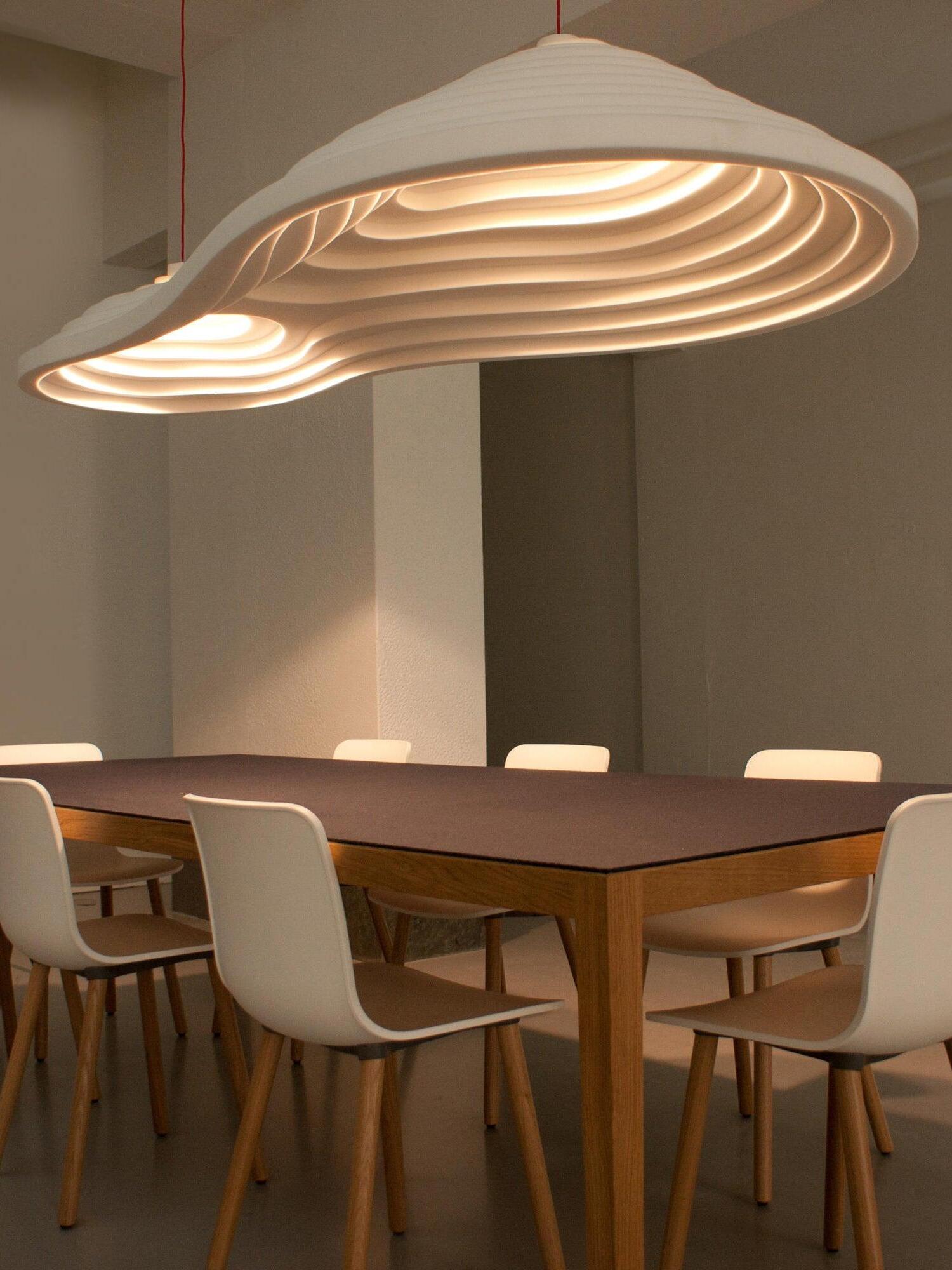 La serie de iluminación acústica Rice Field forma parte de la colección Acoustic Design Solutions. La absorción acústica y el diseño se combinan en uno. La serie de iluminación acústica 'Rice Field' está inspirada en la forma similar de los campos de arroz y se basa en la importancia de la acústica y la luz en el diseño de interiores. Estas lámparas acústicas se crean utilizando resina, una resina de celda abierta con excelentes propiedades acústicas. La forma combina perfectamente con las propiedades acústicas de la resina. Al agregar extrusión a la superficie plana se realza el volumen de la forma, mejorando su efectividad. Esto, en combinación con la iluminación E27 de alta calidad, da como resultado un sistema ingenioso que controla tanto la luz como el sonido.