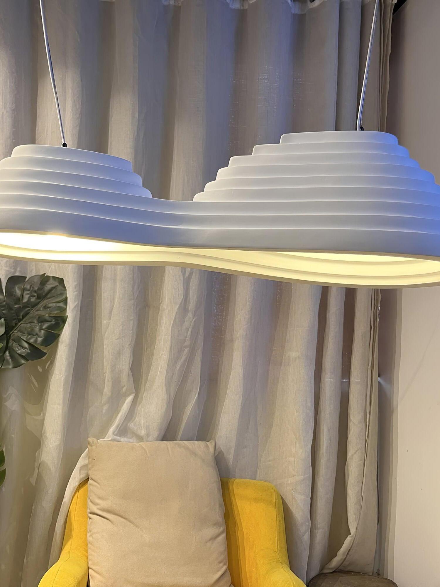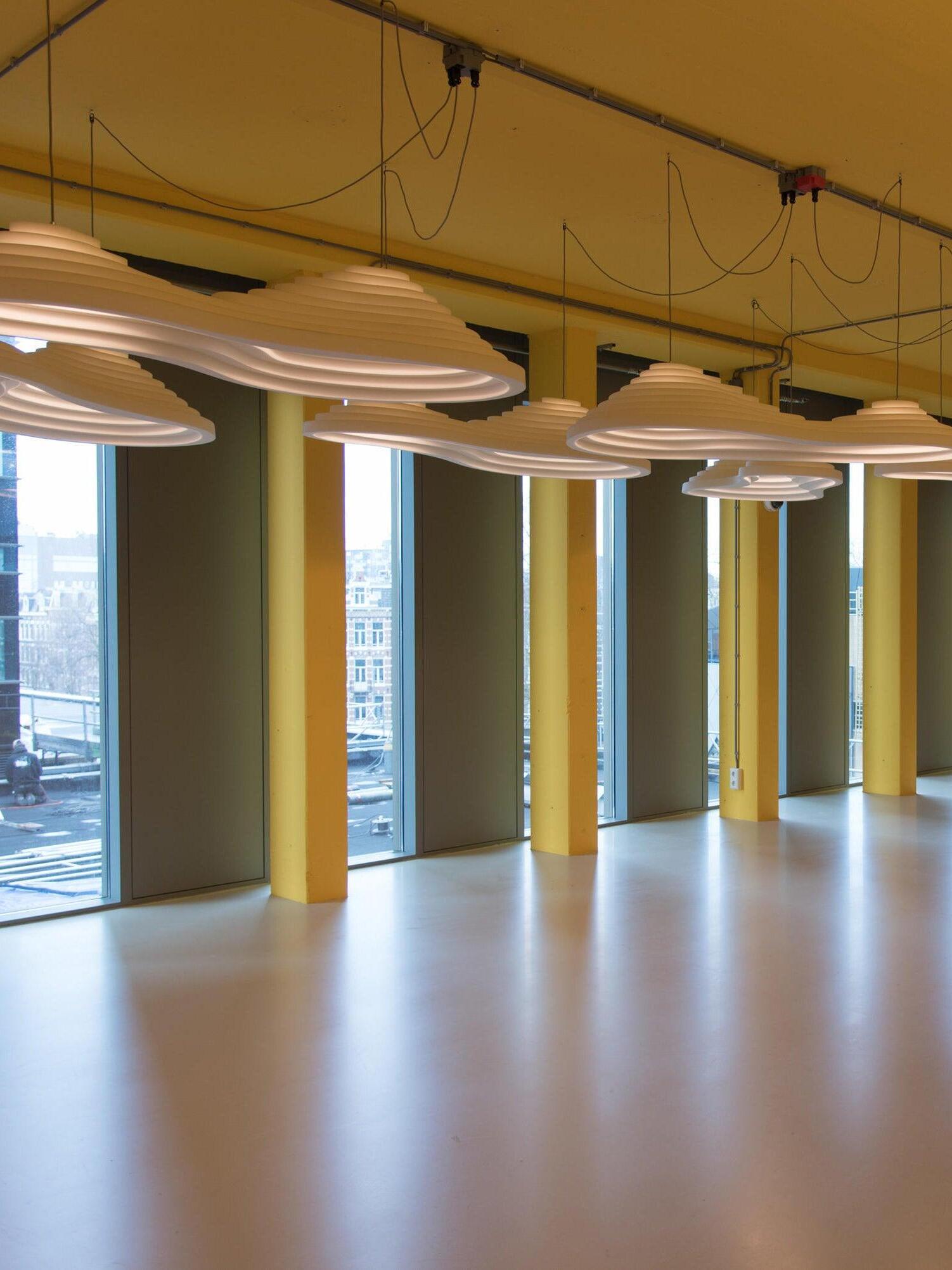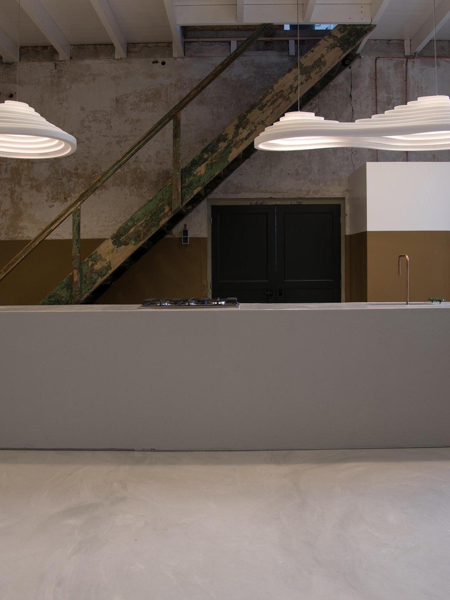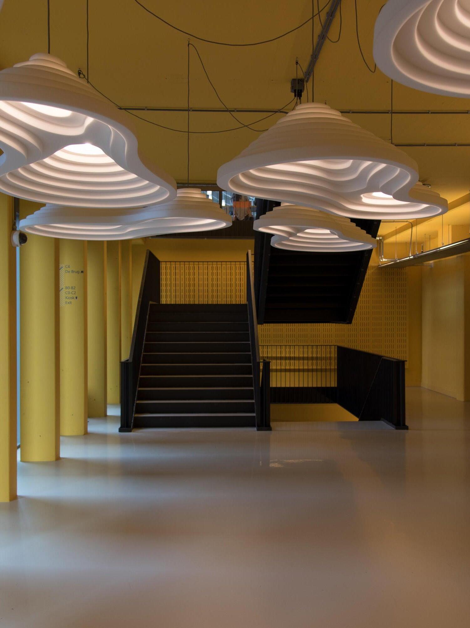 La serie de iluminación acústica Rice Field forma parte de la colección Acoustic Design Solutions. La absorción acústica y el diseño se combinan en uno. La serie de iluminación acústica 'Rice Field' está inspirada en la forma similar de los campos de arroz y se basa en la importancia de la acústica y la luz en el diseño de interiores. Estas lámparas acústicas se crean utilizando resina, una resina de celda abierta con excelentes propiedades acústicas. La forma combina perfectamente con las propiedades acústicas de la resina. Al agregar extrusión a la superficie plana se realza el volumen de la forma, mejorando su efectividad. Esto, en combinación con la iluminación E27 de alta calidad, da como resultado un sistema ingenioso que controla tanto la luz como el sonido.