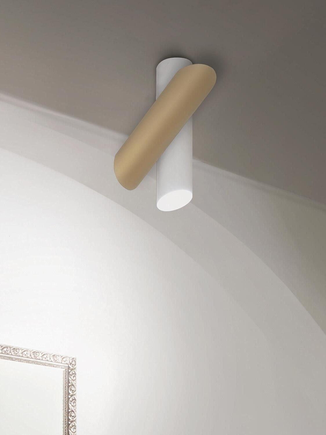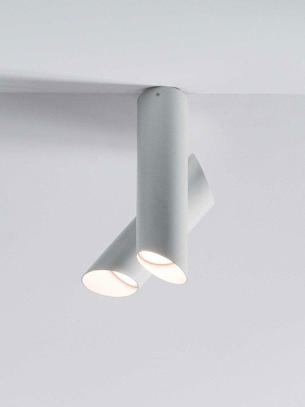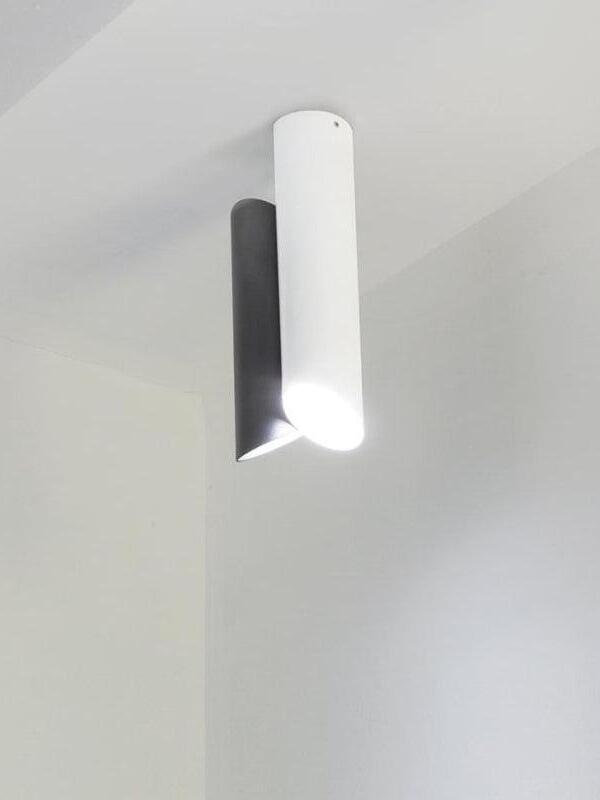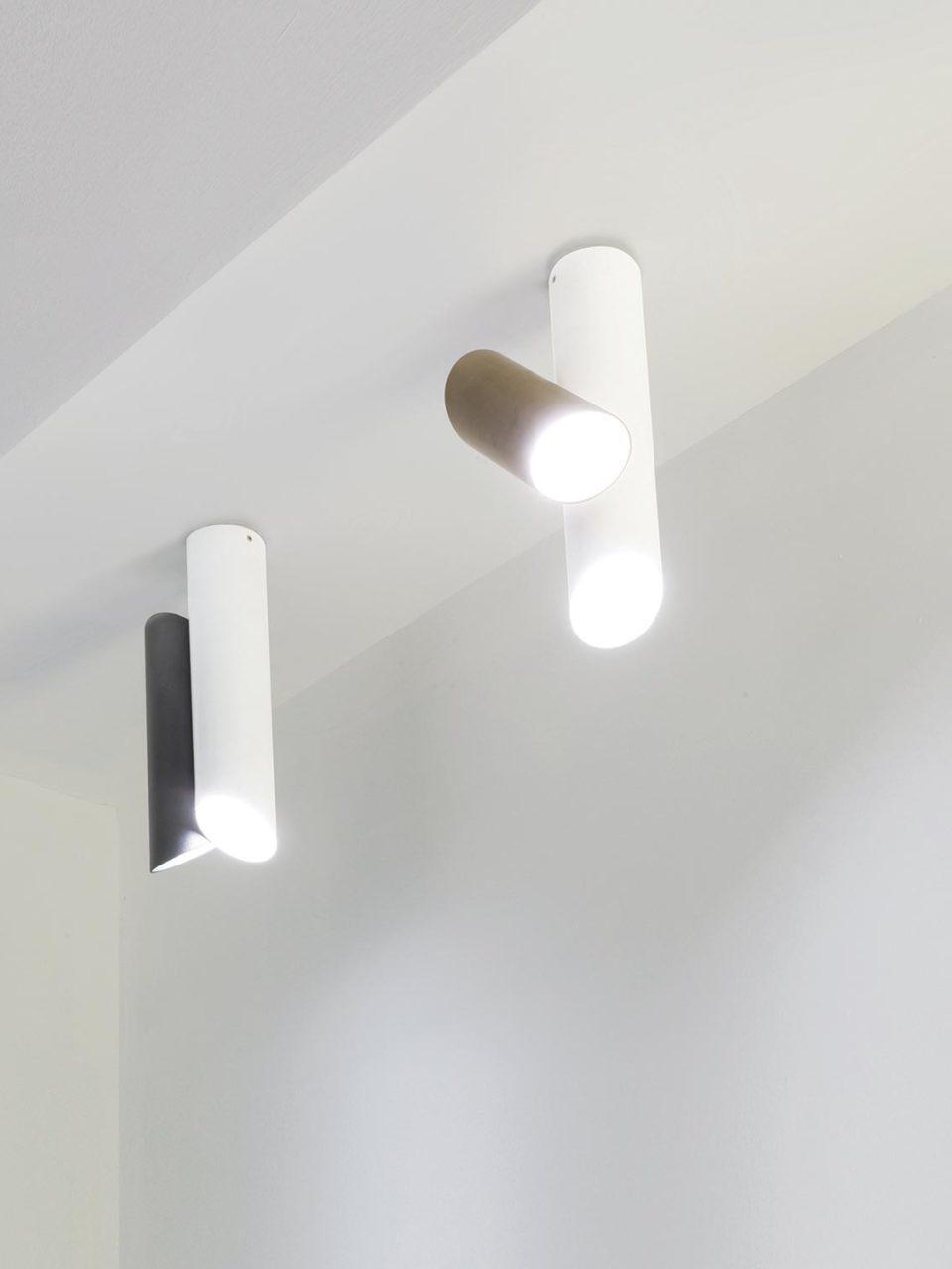 Familia de lámparas de suspensión, pared y techo, realizadas con elementos tubulares para objetos con un diseño fuerte y esencial que se expresa a través de formas puras. En la versión de techo el elemento de techo gira 340°, mientras que el otro cilindro se puede girar 90°.