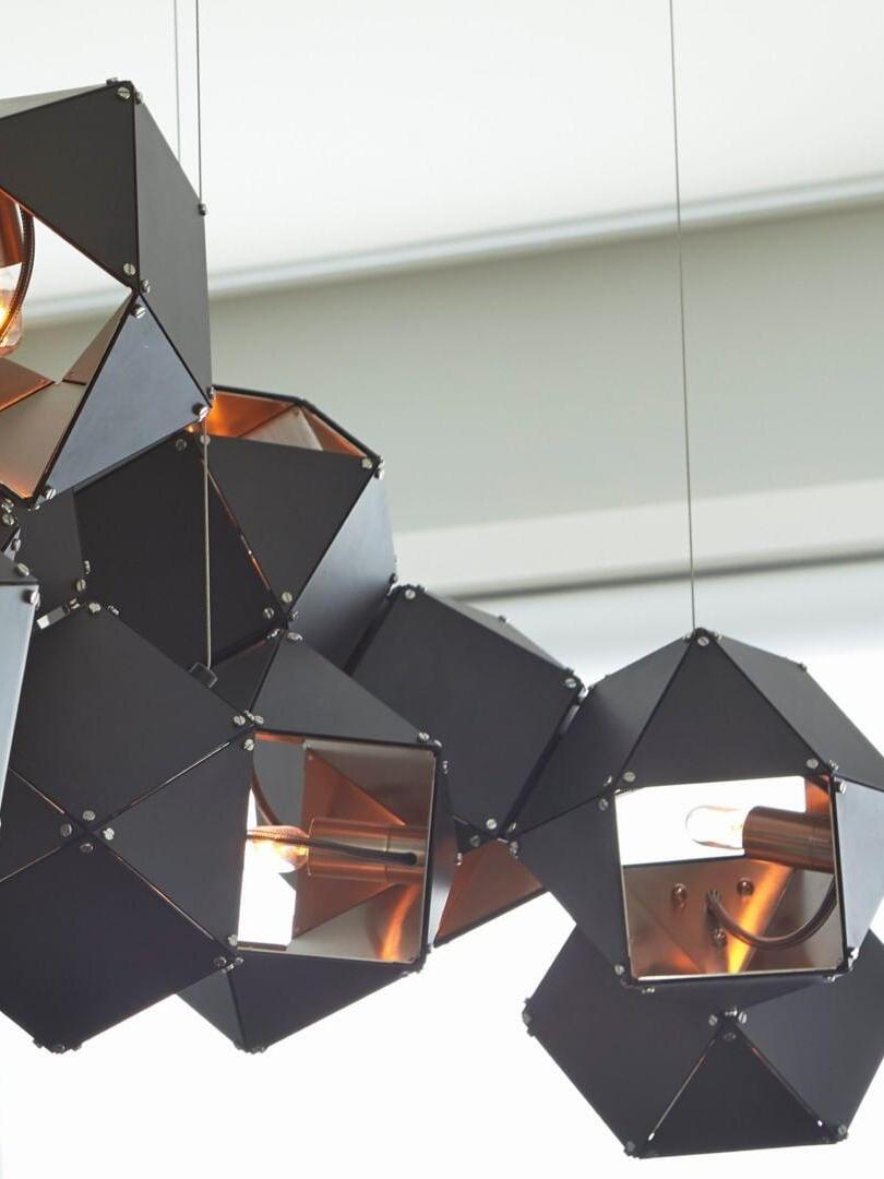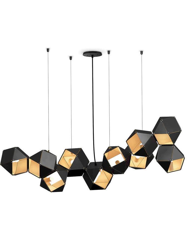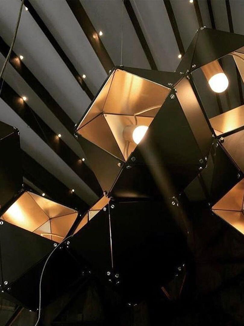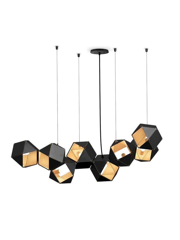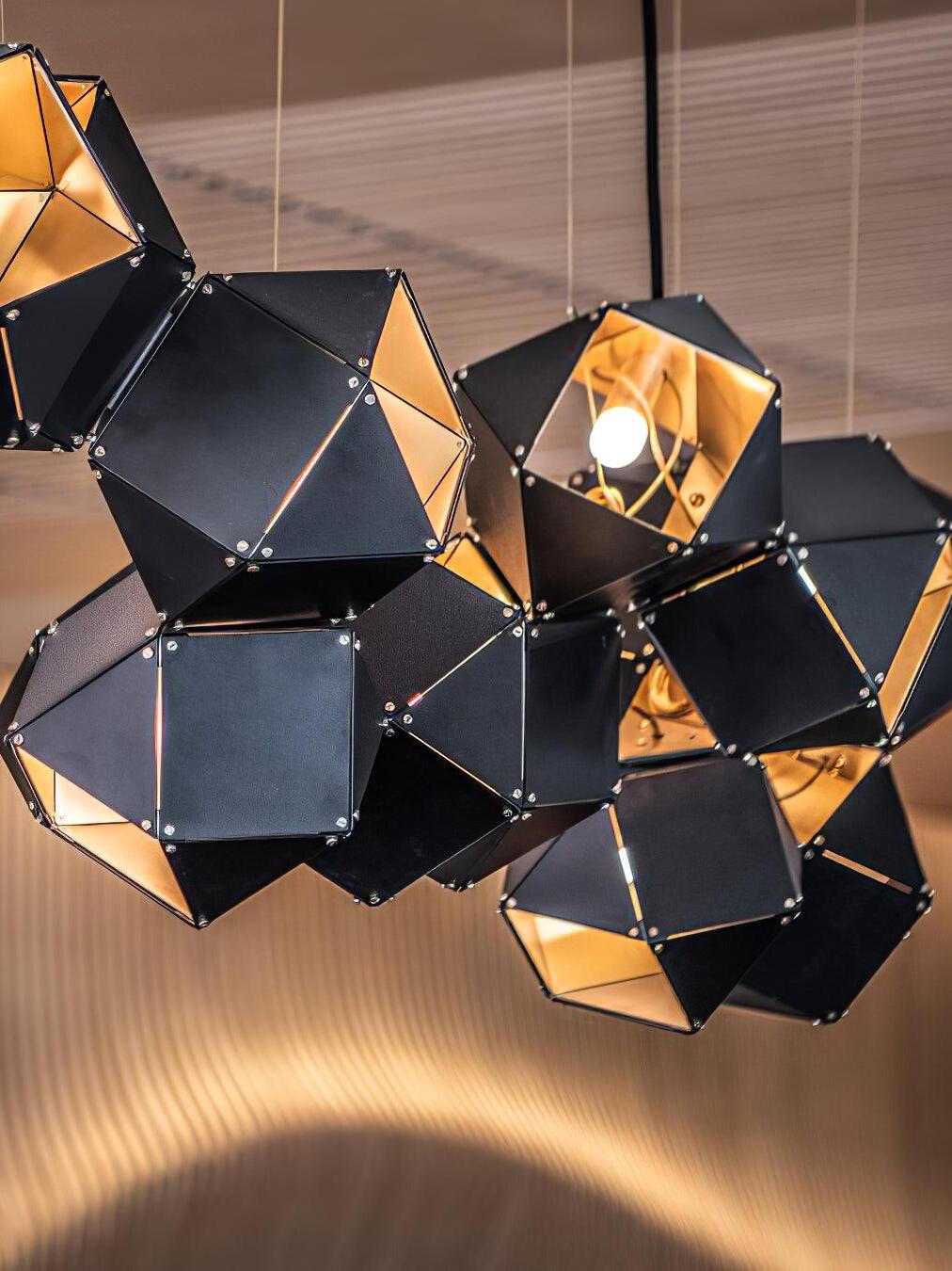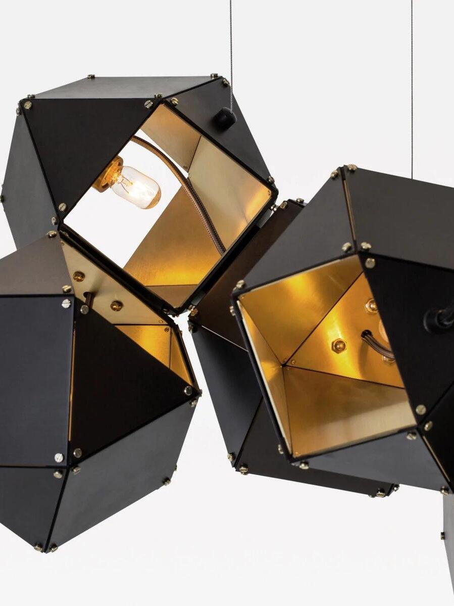 Un accesorio de proporciones metálicas, la firma WELLES es una pieza moderna que muestra el arte experto. Los polígonos metálicos huecos se ramifican en un sistema modular de configuraciones interconectadas para una ilusión óptica impresionante. Con sus infinitas posibilidades, WELLES flota en el aire emitiendo una nube de luz suave a través de su silueta multifacética y escultóricamente innovadora.