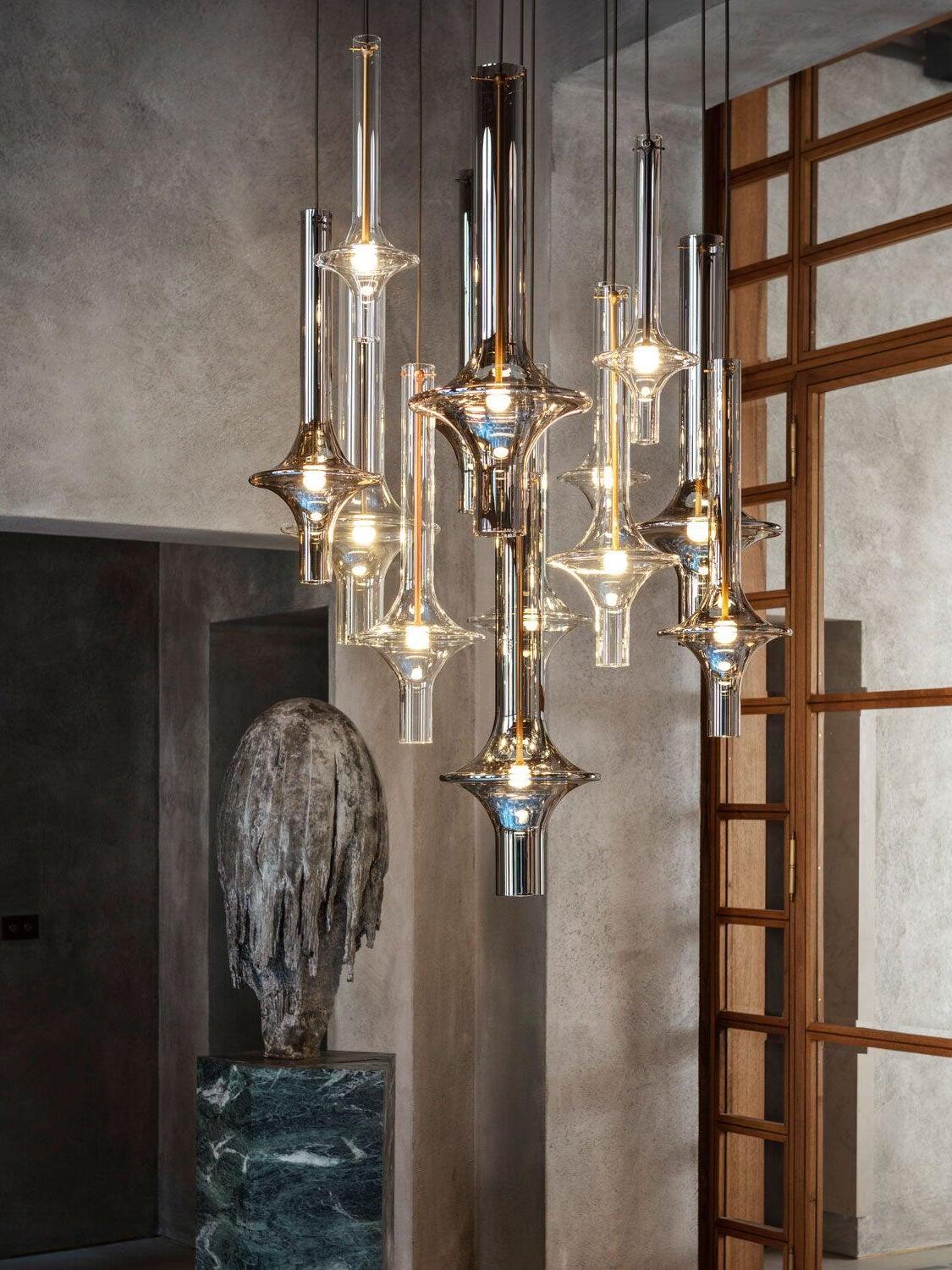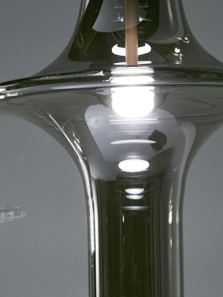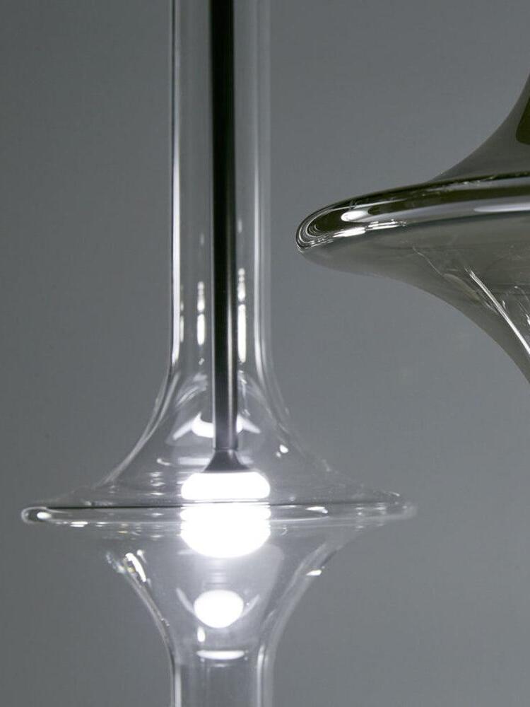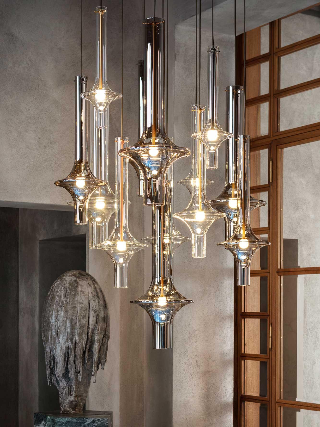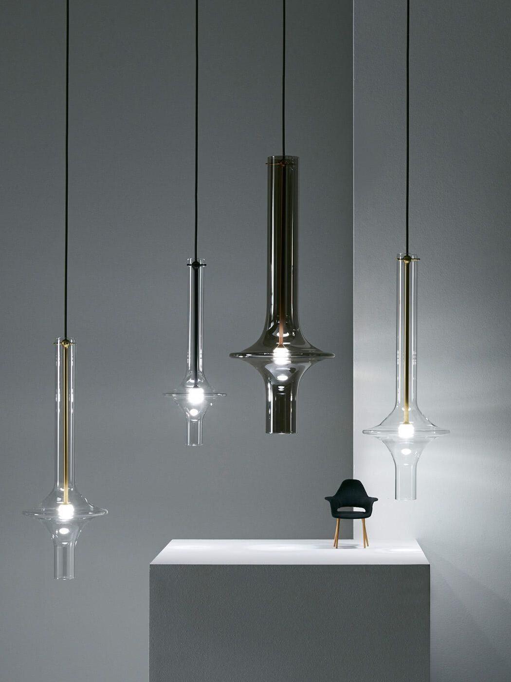 Combinar más lámparas Wonder en diferentes dimensiones, acabados y alturas sorprende como la belleza luminosa del vidrio de borosilicato con el que está fabricado cada varilla, en acabado transparente o fumé.