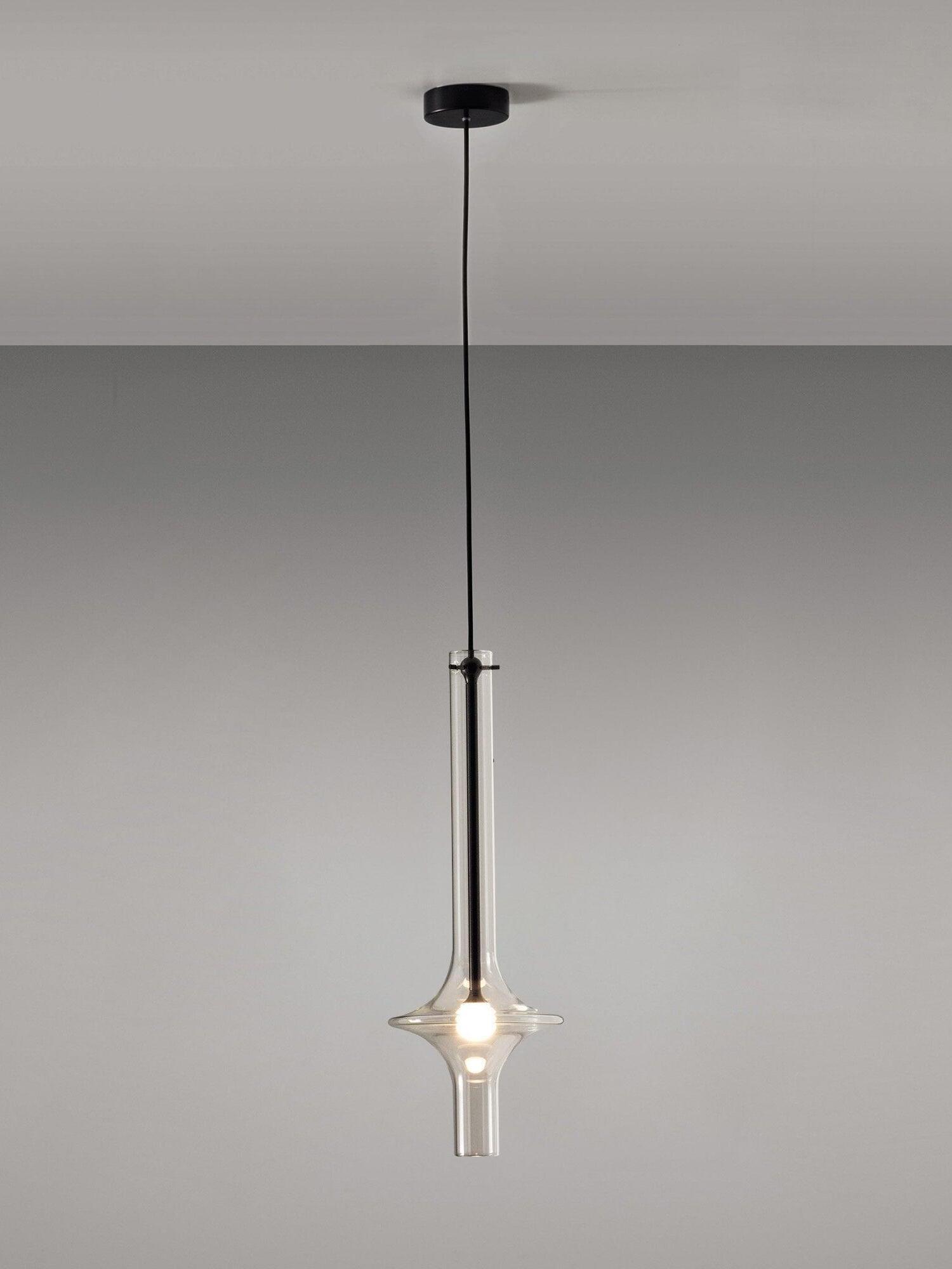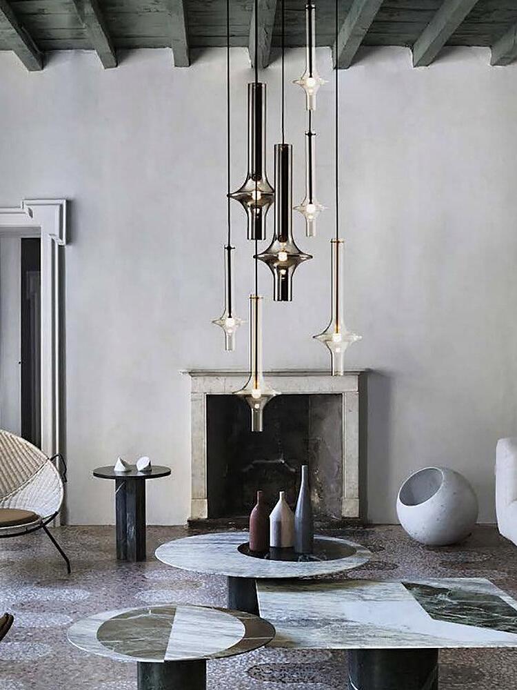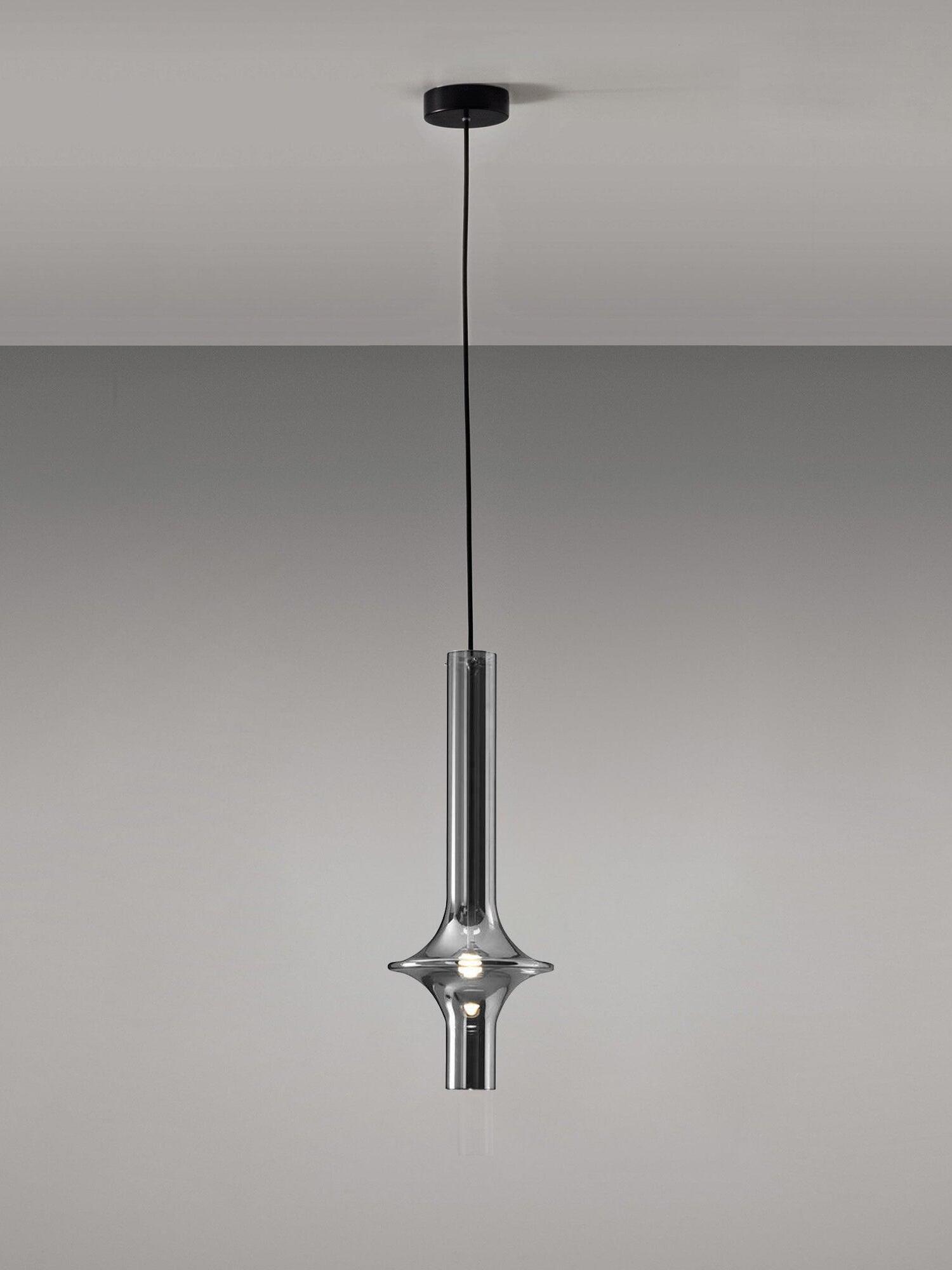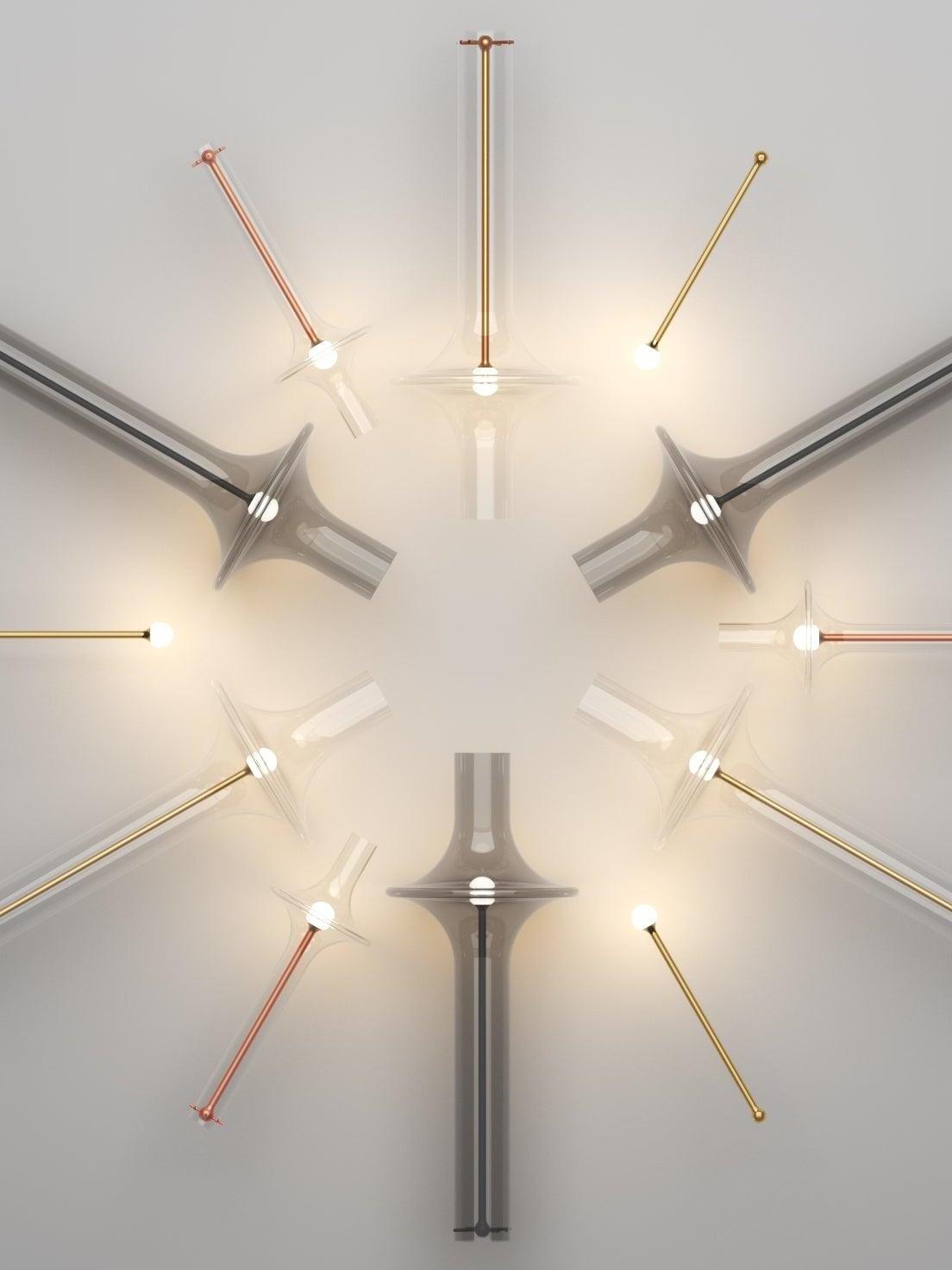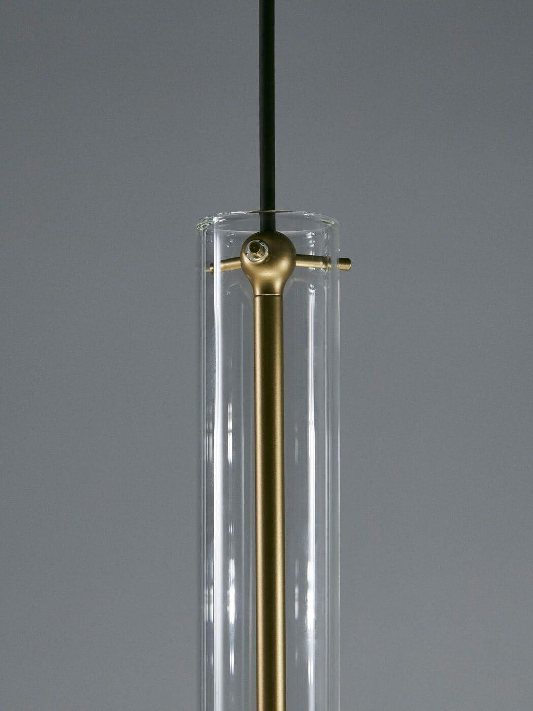 Combinar más lámparas Wonder en diferentes dimensiones, acabados y alturas sorprende como la belleza luminosa del vidrio de borosilicato con el que está fabricado cada varilla, en acabado transparente o fumé.