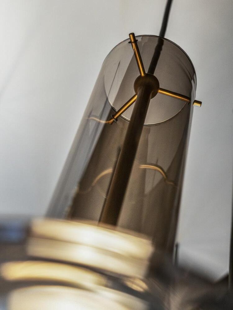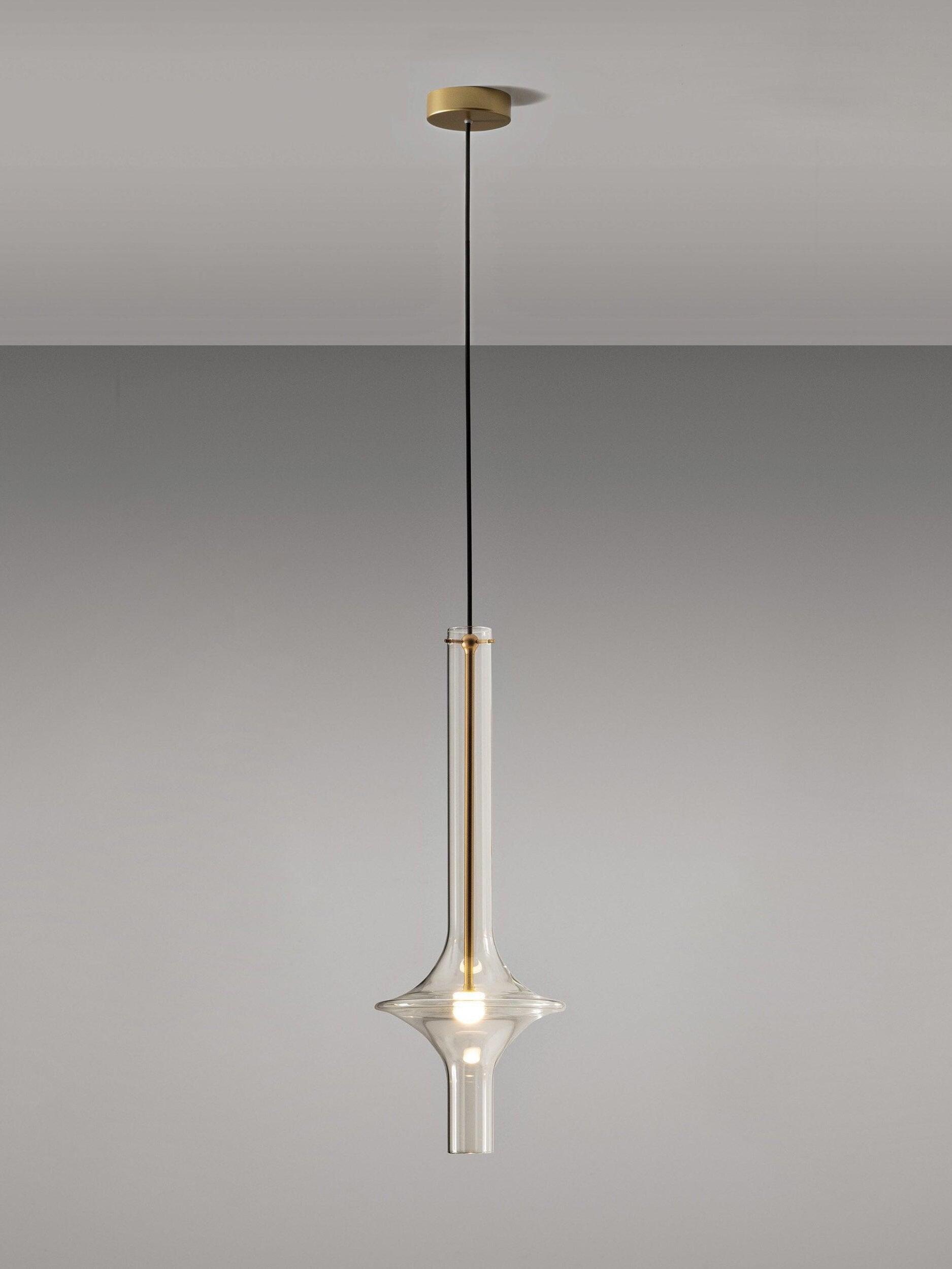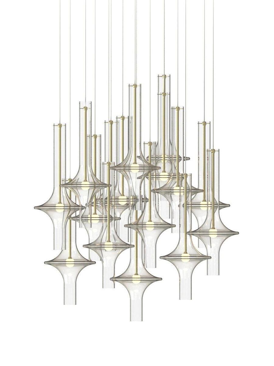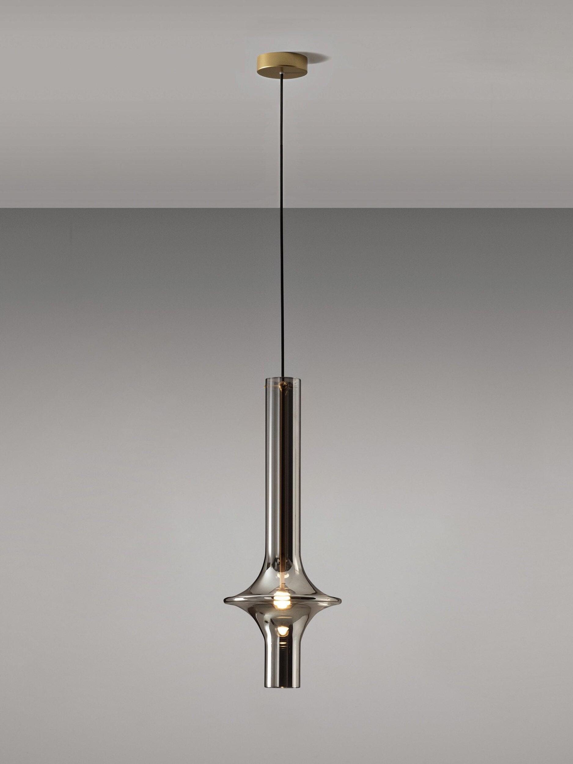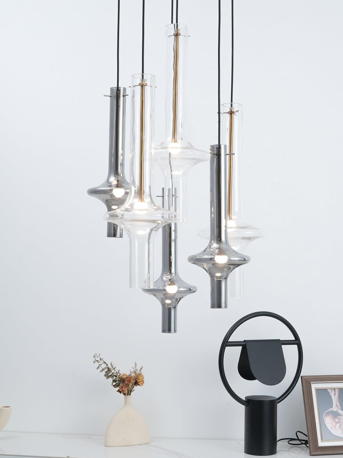 Combinar más lámparas Wonder en diferentes dimensiones, acabados y alturas sorprende como la belleza luminosa del vidrio de borosilicato con el que está fabricado cada varilla, en acabado transparente o fumé.