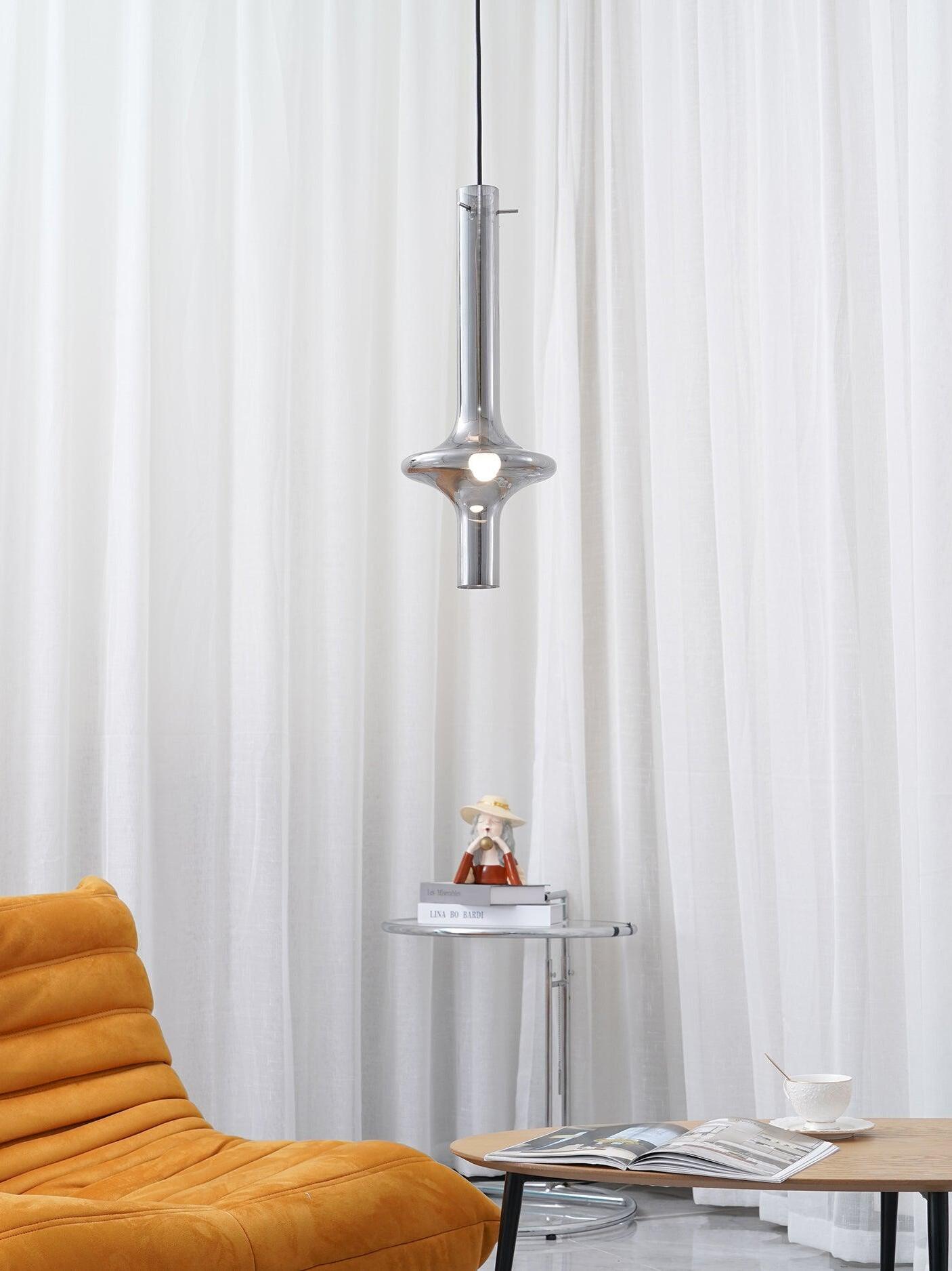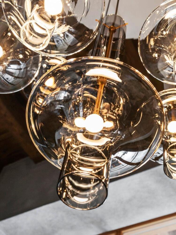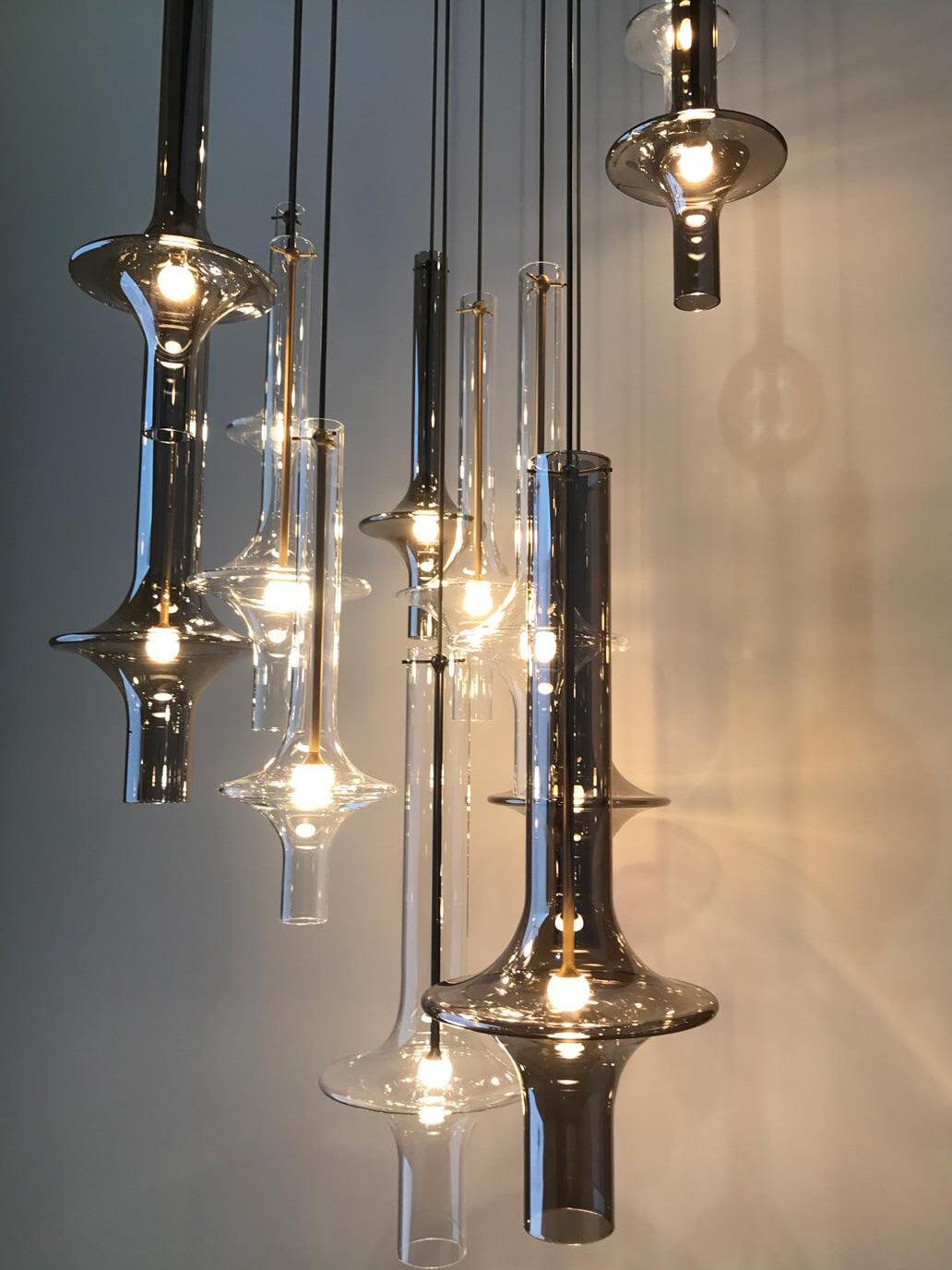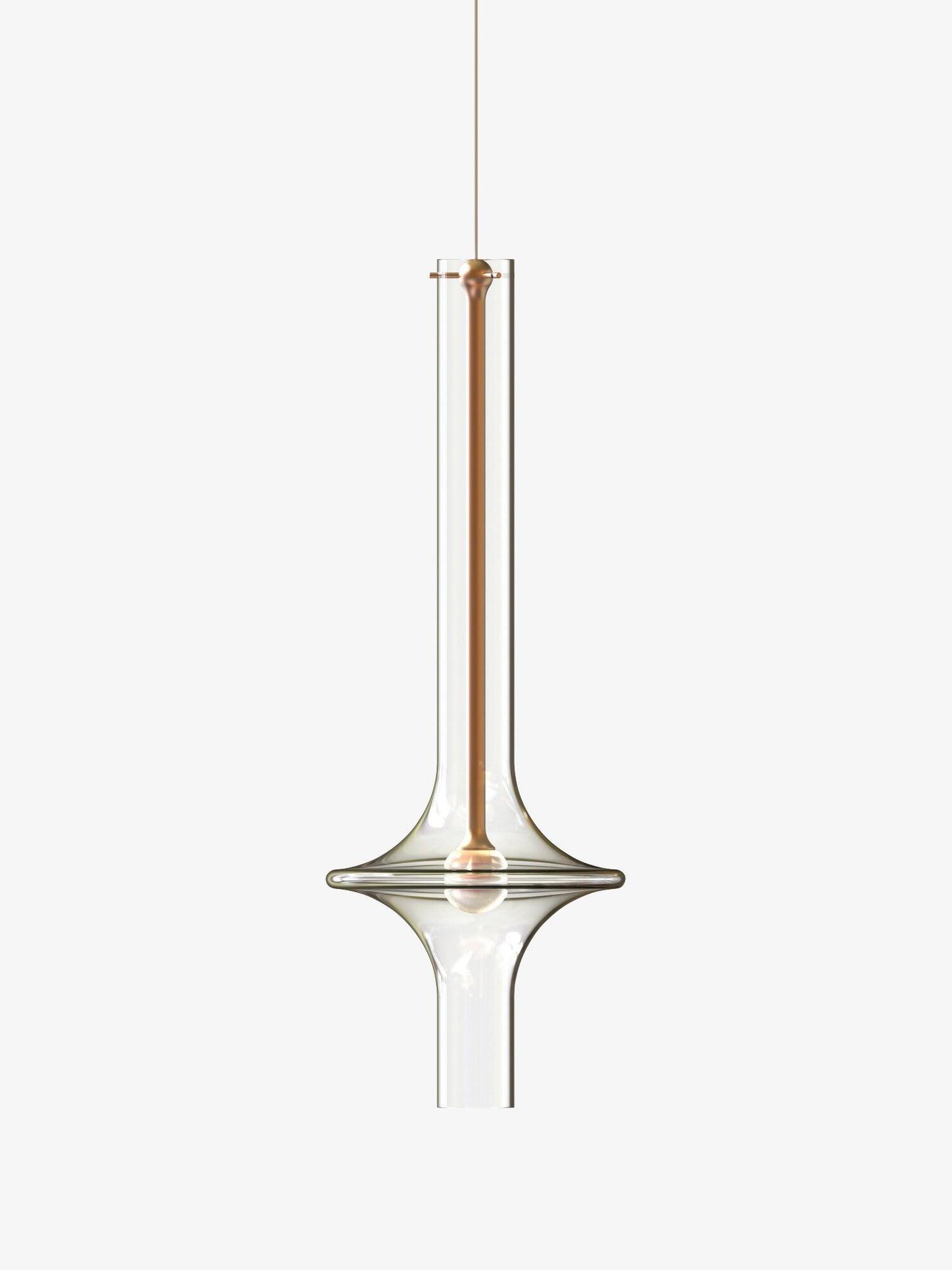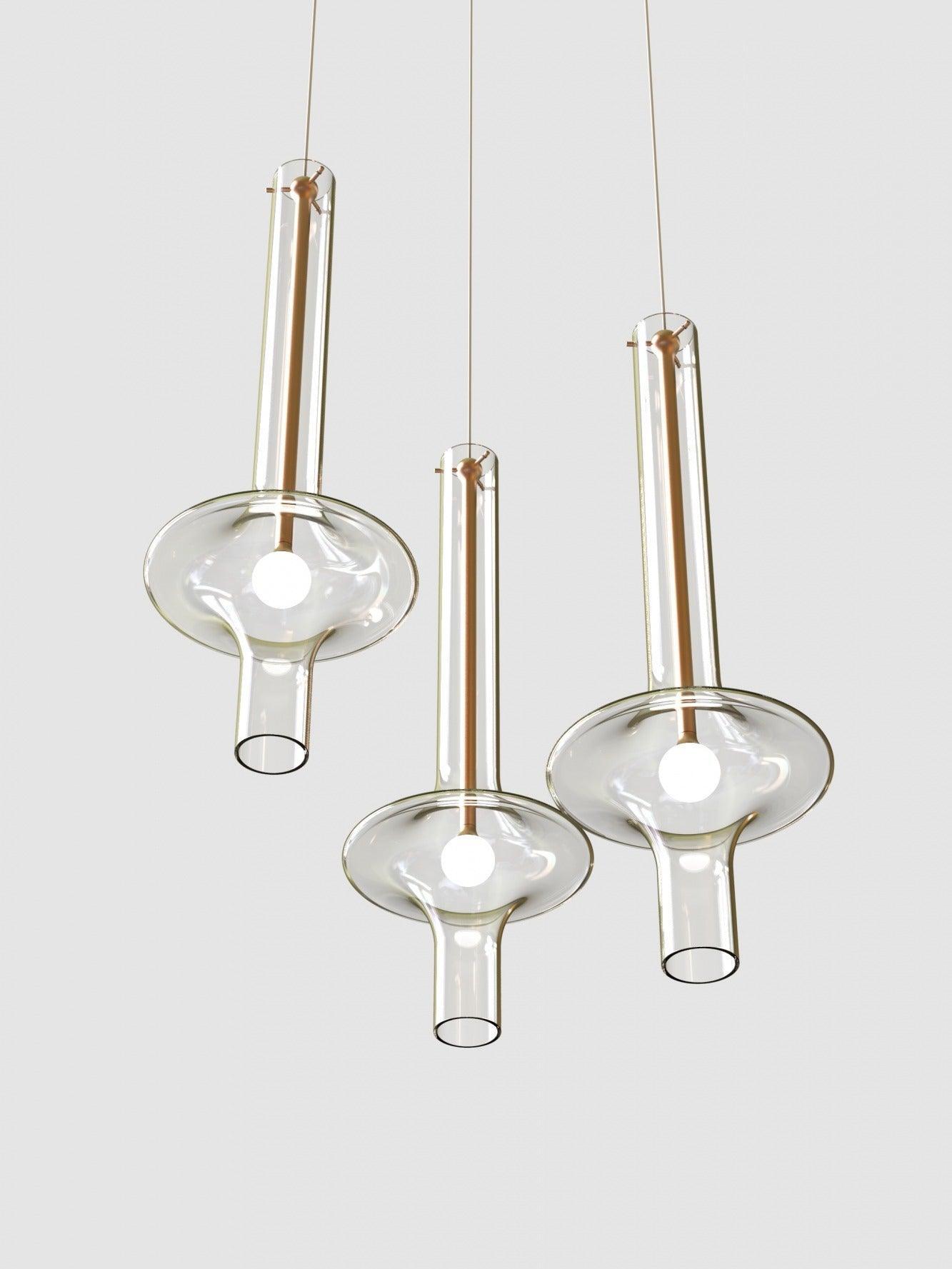 Combinar más lámparas Wonder en diferentes dimensiones, acabados y alturas sorprende como la belleza luminosa del vidrio de borosilicato con el que está fabricado cada varilla, en acabado transparente o fumé.