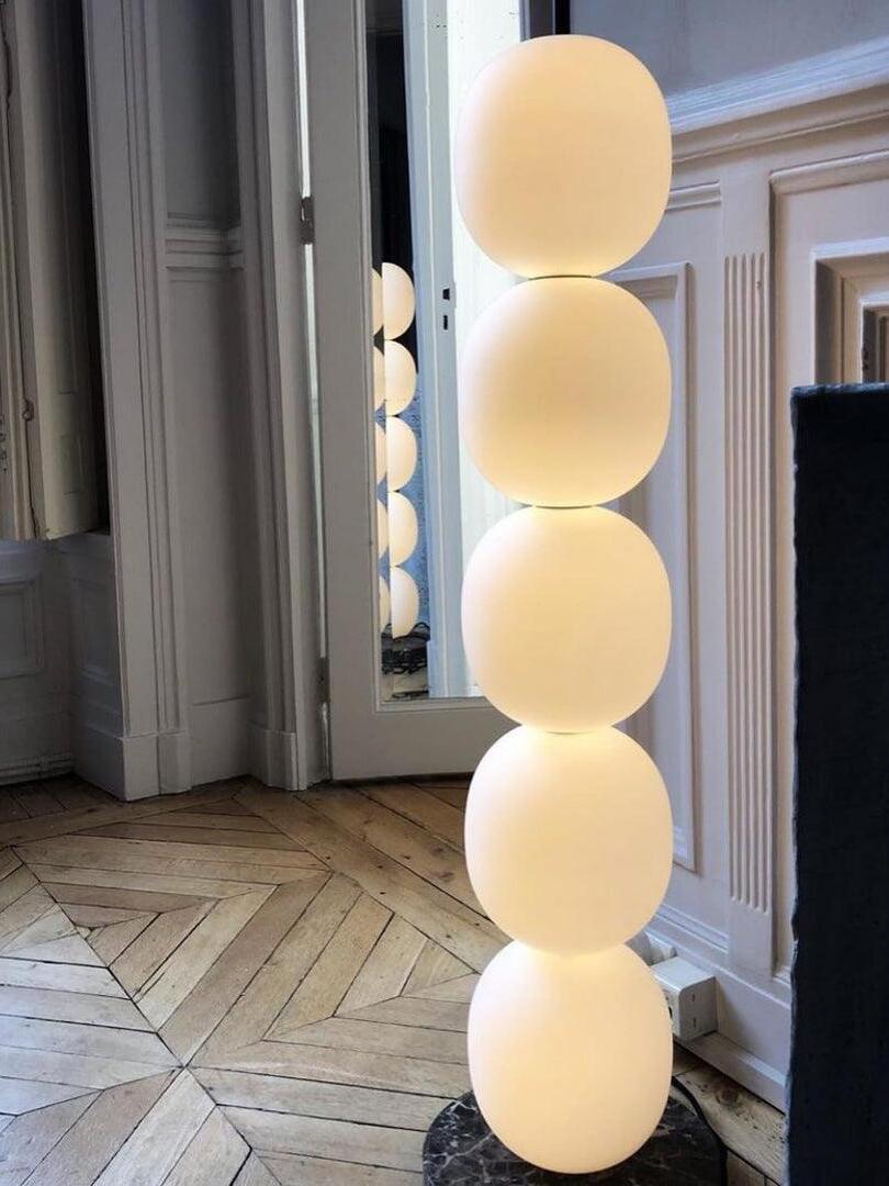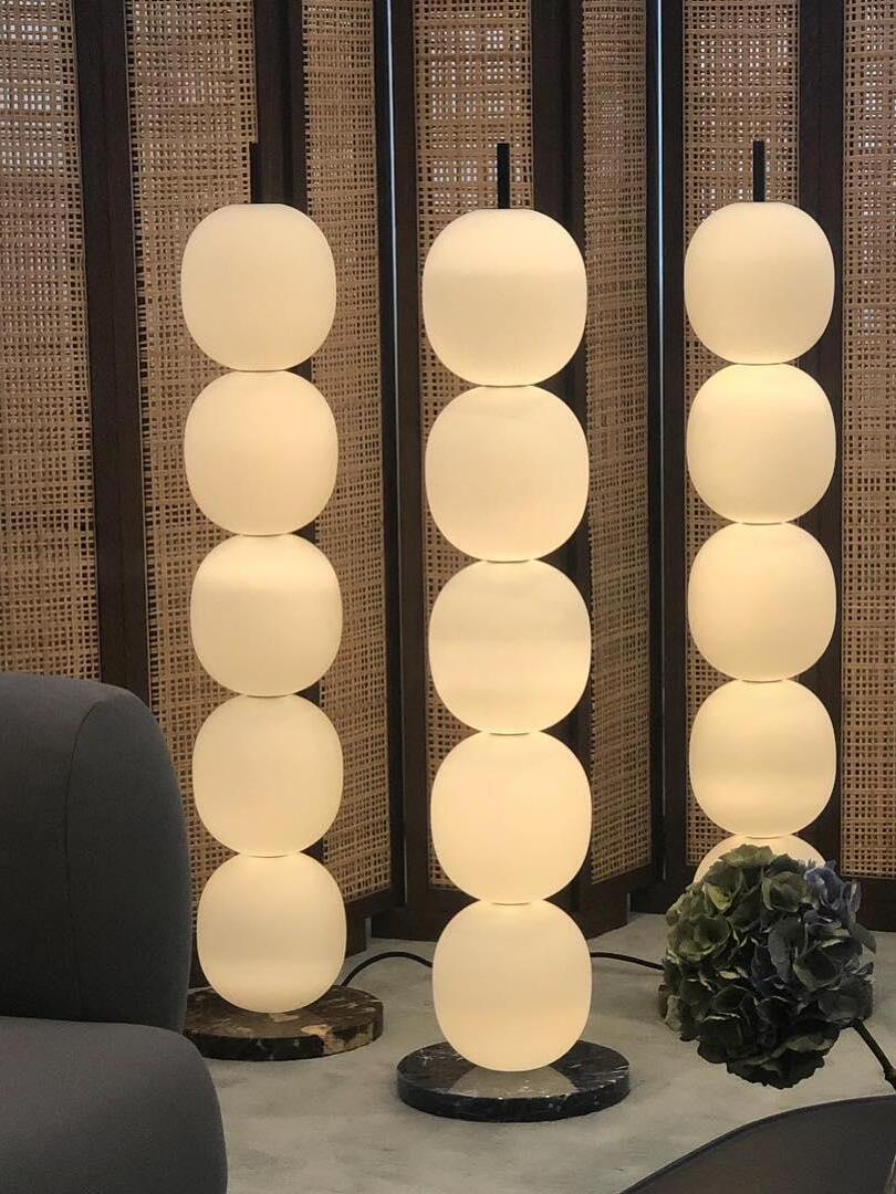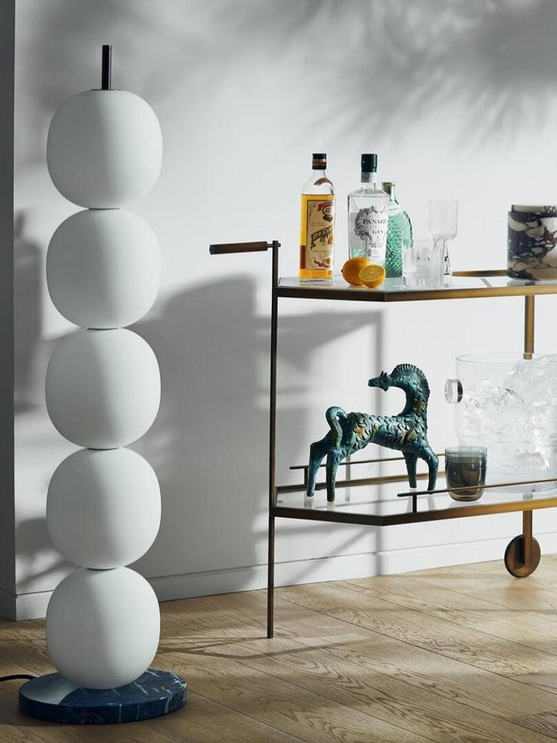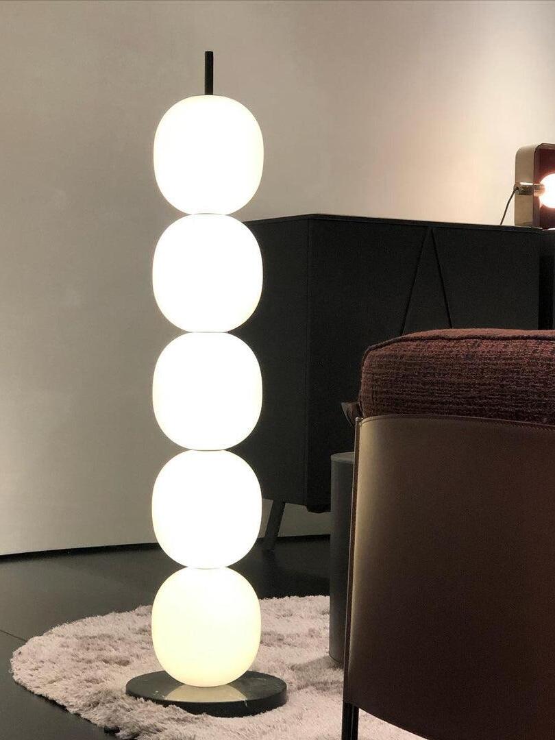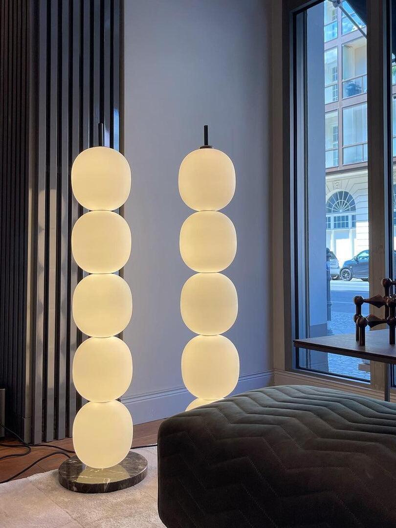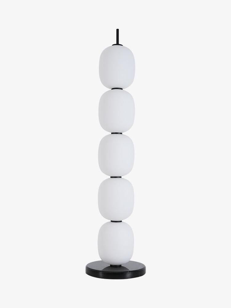 Gli originali globi di vetro soffiato a mano ricordano i galleggianti e le boe che decorano il fiume. Il pulsante della lampada integrato sullo stelo superiore attenua l'abbagliamento della luce. La base è disponibile in marmo.