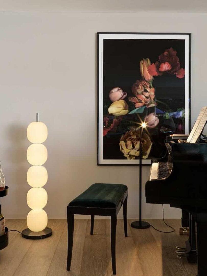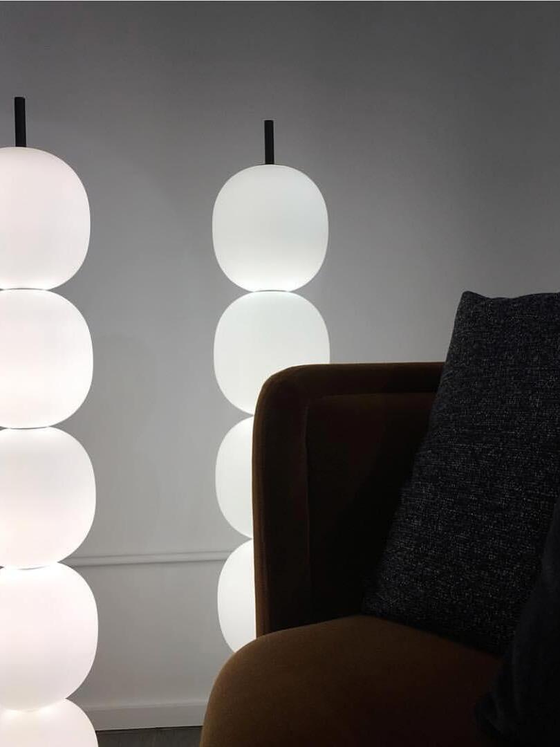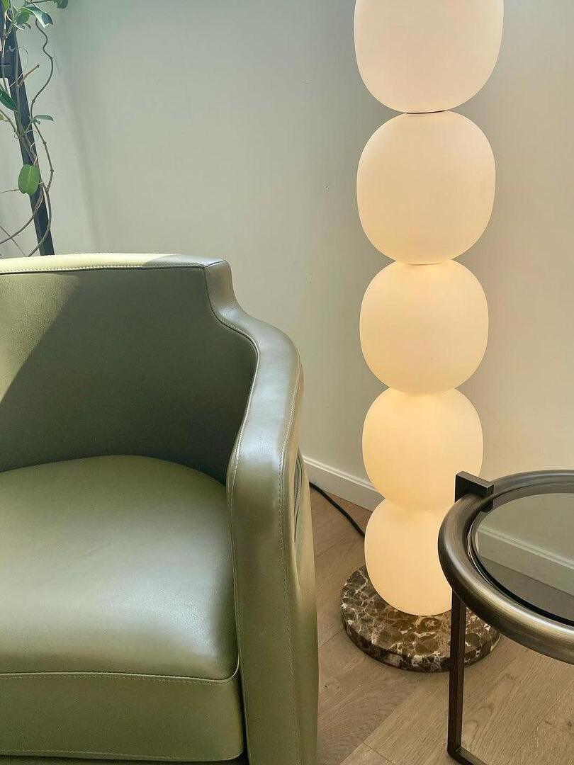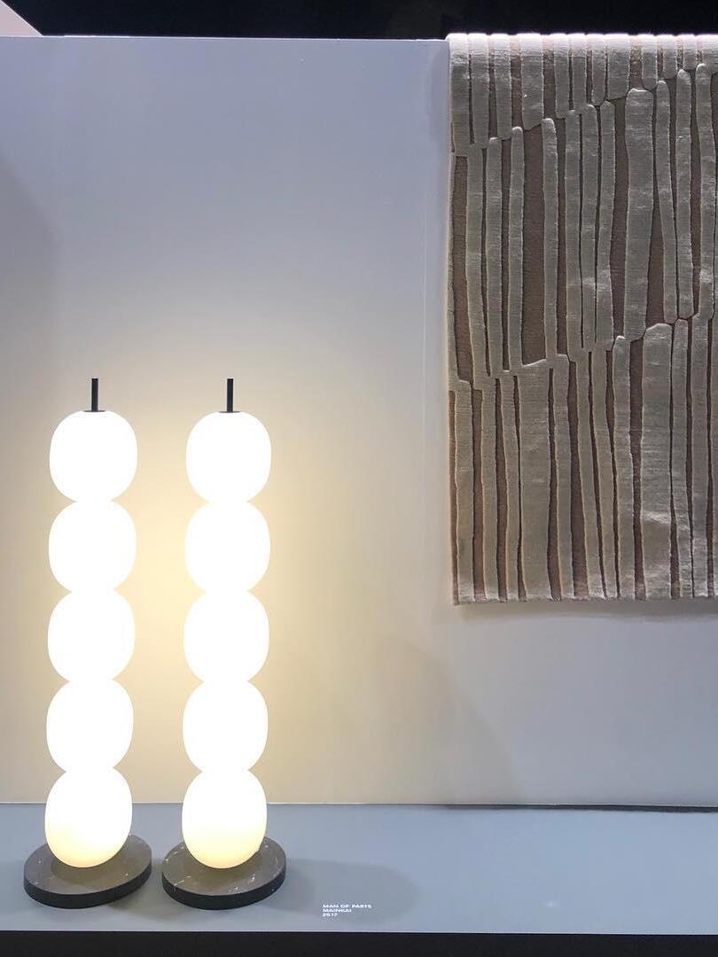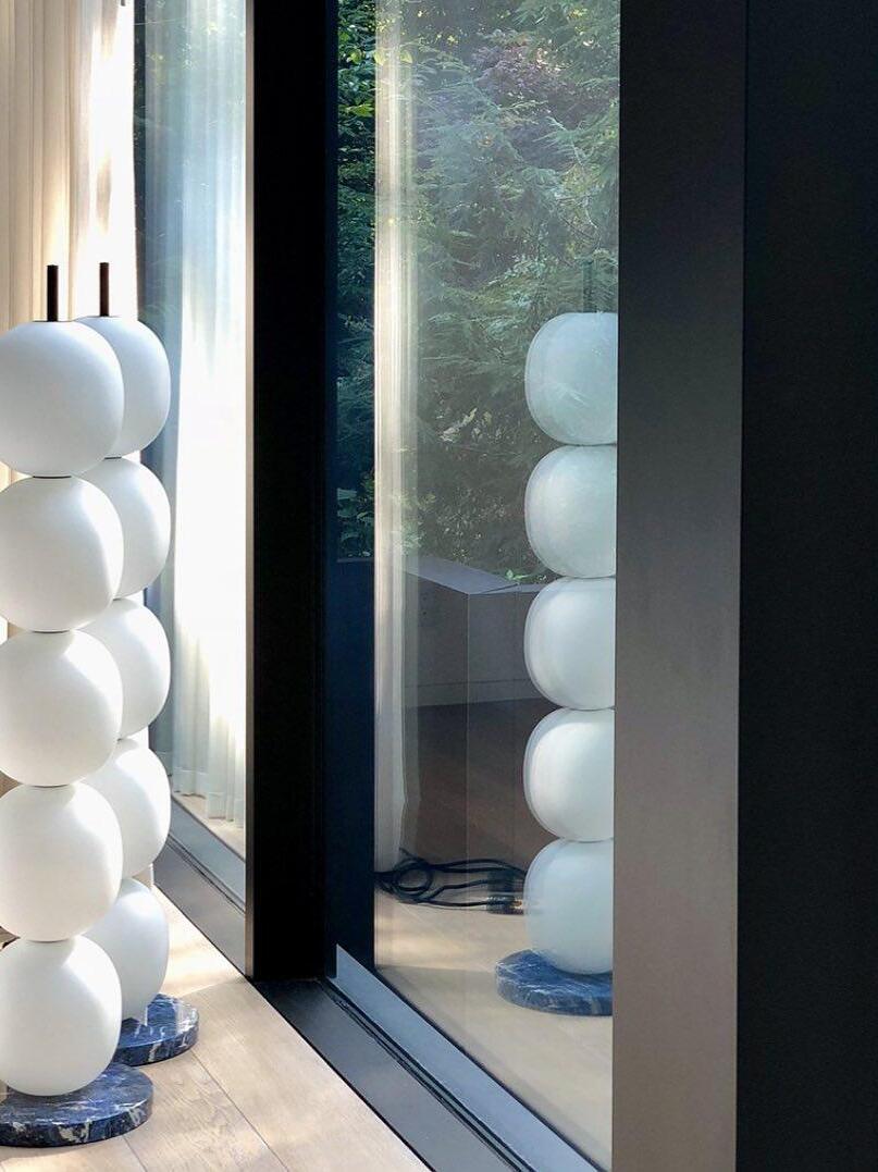 Gli originali globi di vetro soffiato a mano ricordano i galleggianti e le boe che decorano il fiume. Il pulsante della lampada integrato sullo stelo superiore attenua l'abbagliamento della luce. La base è disponibile in marmo.