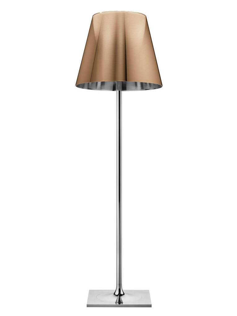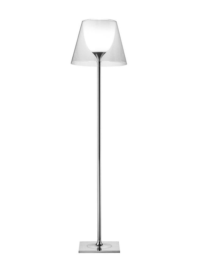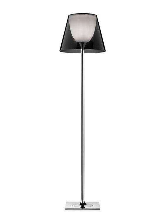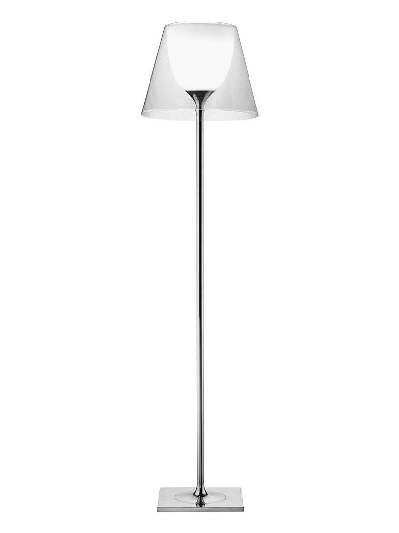 Lampada da terra a luce diffusa. Base, supporto asta e supporto diffusore in lega di Zama pressofusa, lucidata e cromata. Copribase in acciaio zincato P04. Diffusore interno opale e supporto portalampada in PC (policarbonato) stampato ad iniezione. Diffusori esterni in PMMA (polimetilmetacrilato) trasparente o fumèe, argento o bronzo sulla superficie interna, mediante rivestimento in alluminio sottovuoto. Anello superiore in PC (policarbonato) stampato ad iniezione, completamente trasparente o diffusore trasparente e diffusore argento) o marrone trasparente per il diffusore esterno bronzo.