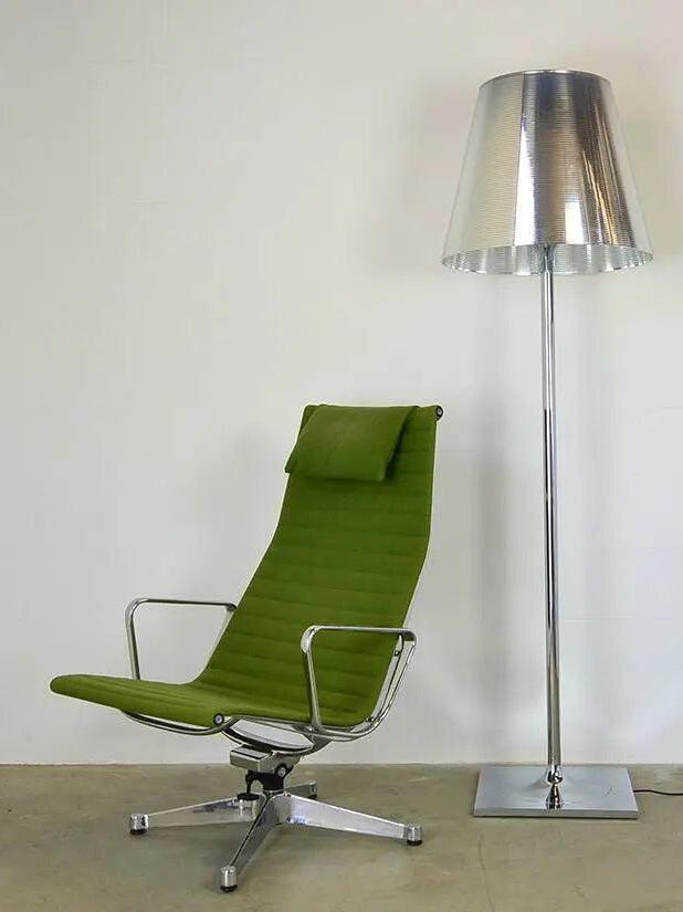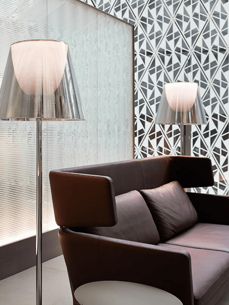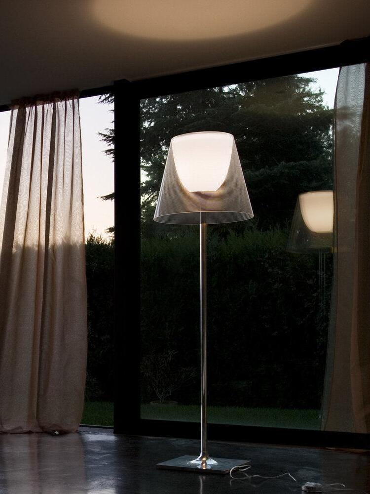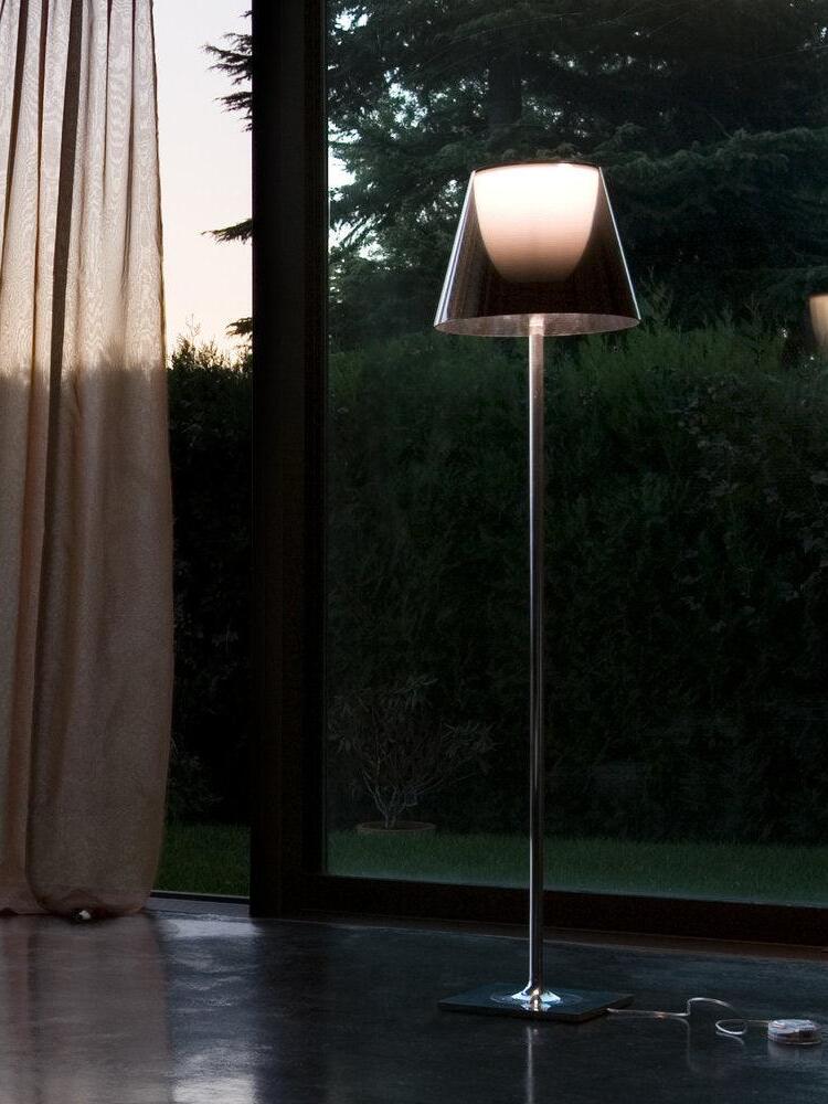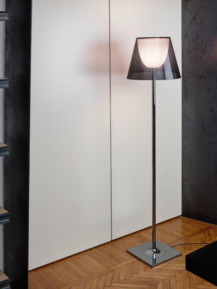 Lampada da terra a luce diffusa. Base, supporto asta e supporto diffusore in lega di Zama pressofusa, lucidata e cromata. Copribase in acciaio zincato P04. Diffusore interno opale e supporto portalampada in PC (policarbonato) stampato ad iniezione. Diffusori esterni in PMMA (polimetilmetacrilato) trasparente o fumèe, argento o bronzo sulla superficie interna, mediante rivestimento in alluminio sottovuoto. Anello superiore in PC (policarbonato) stampato ad iniezione, completamente trasparente o diffusore trasparente e diffusore argento) o marrone trasparente per il diffusore esterno bronzo.