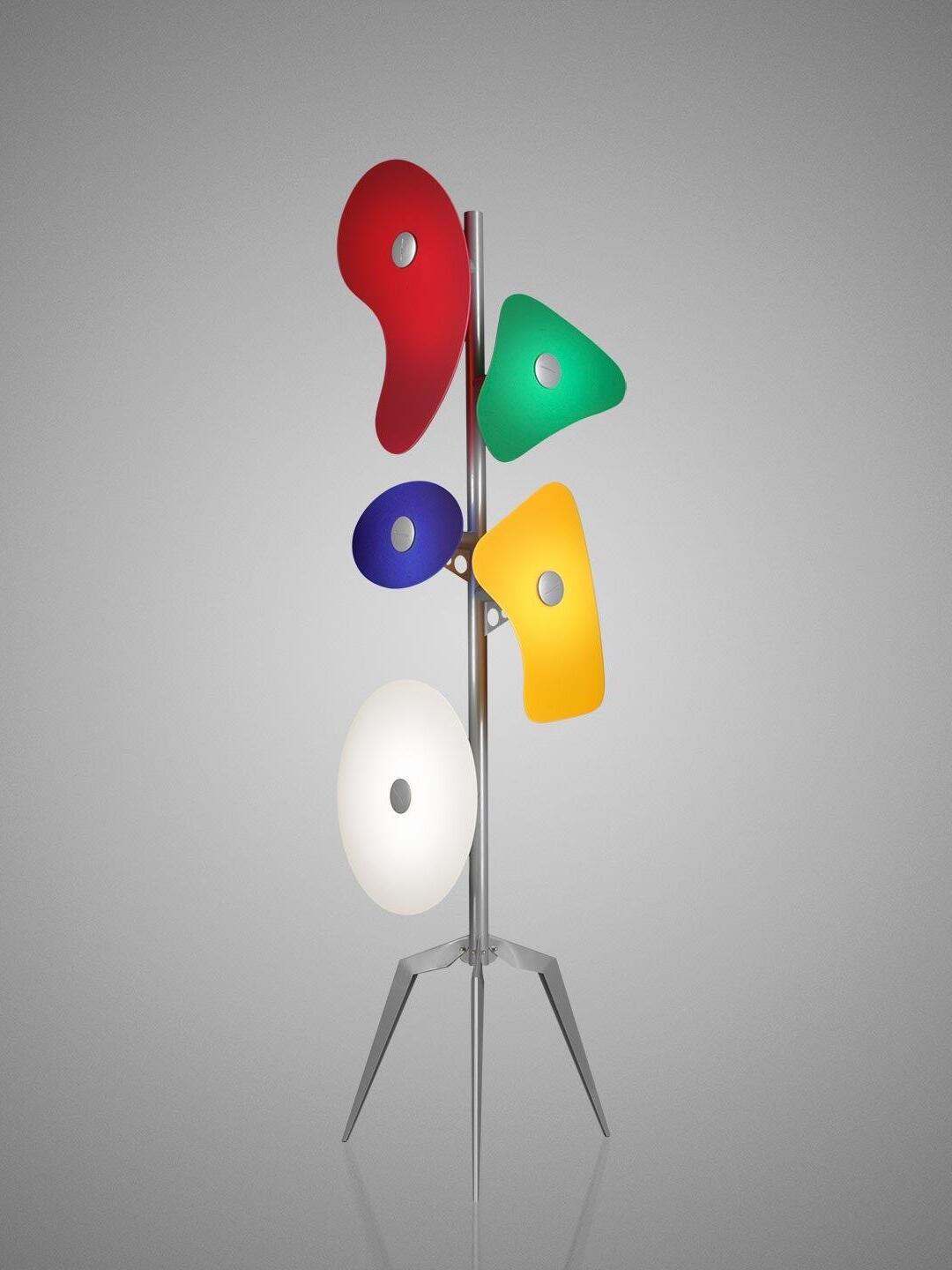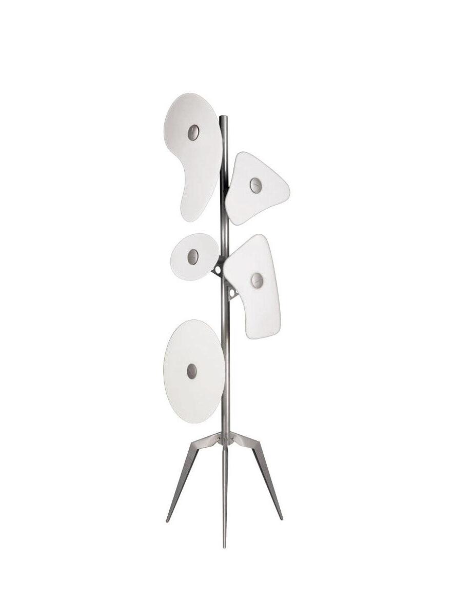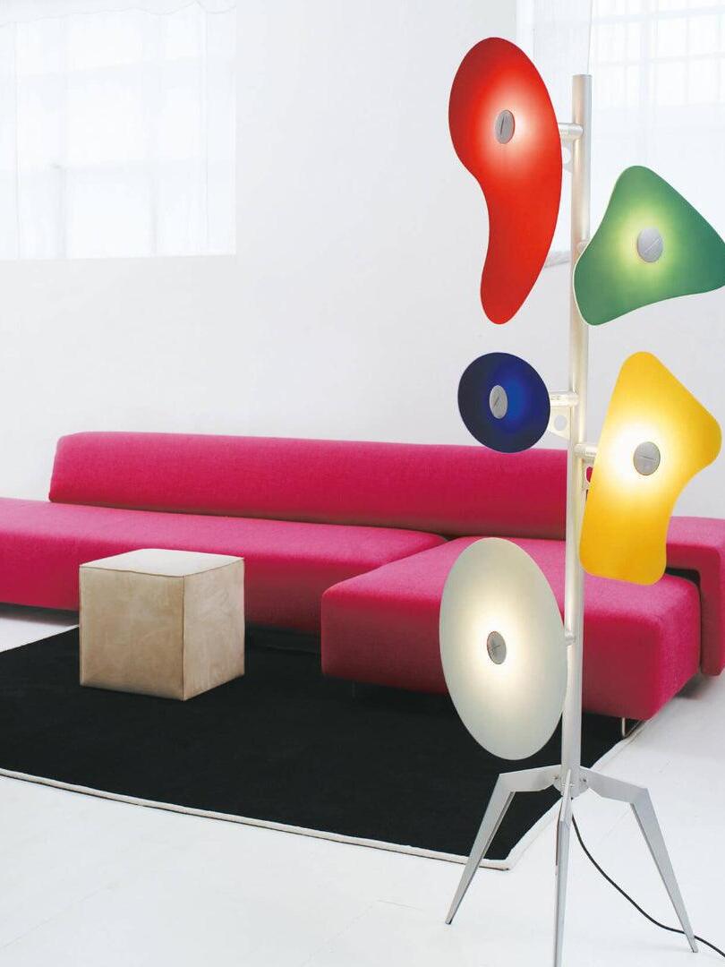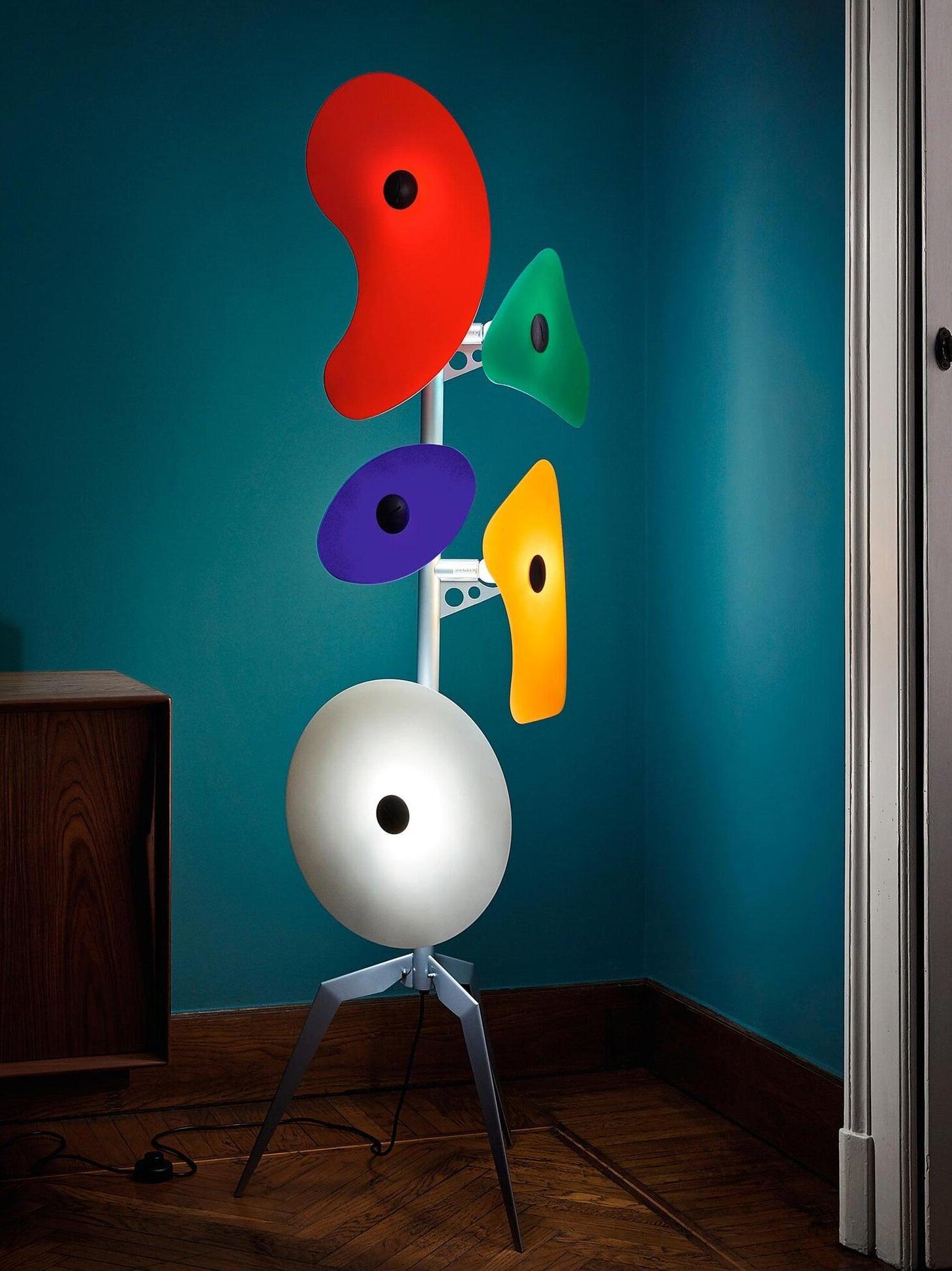 La lampada da terra Orbital è un progetto unico nella storia del design, che prevede una composizione di sagome bianche o multicolori che diffondono nello spazio un segno grafico e luminoso inconfondibile.