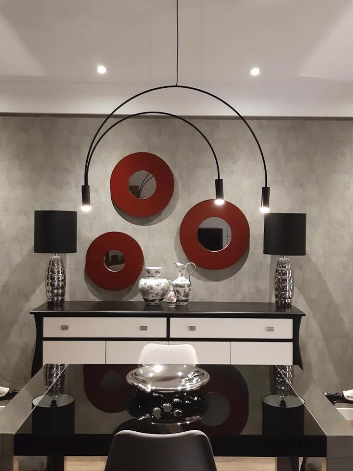 Arcs Pendant Light offers a chic, modern look featuring gracefully overlapping arced arms finished in Black with cylindrical aluminum heads and acrylic lens diffusers. Composed of two large arcs with two smaller inner arcs. Available finished in Black or Gold with a Black or White finished canopy.