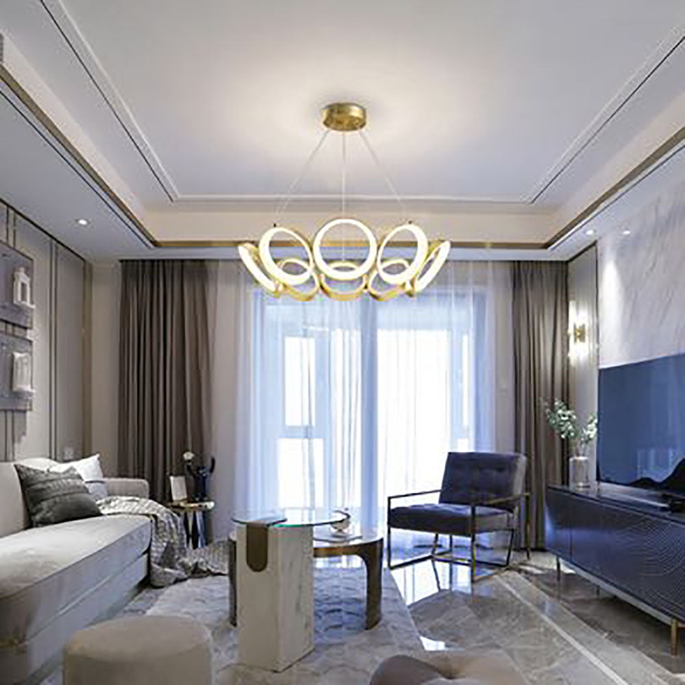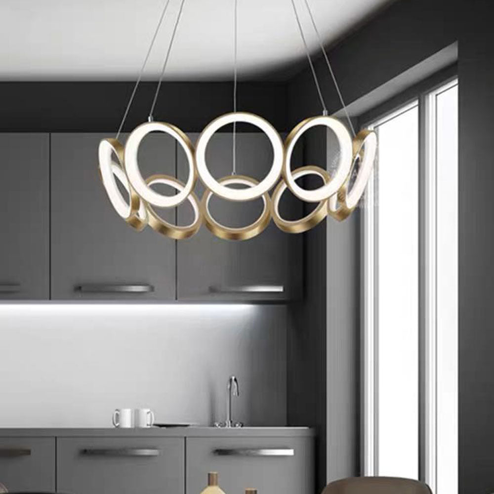 - Our pendant light's unique design. Composed of interconnected ring lights, it forms a mesmerizing circular configuration that instantly draws the eye. The seamless integration of these rings creates an enchanting visual spectacle, making this pendant light not just a source of illumination but also a work of art. Elevate your space with a fixture that combines form and function in a spellbinding way.