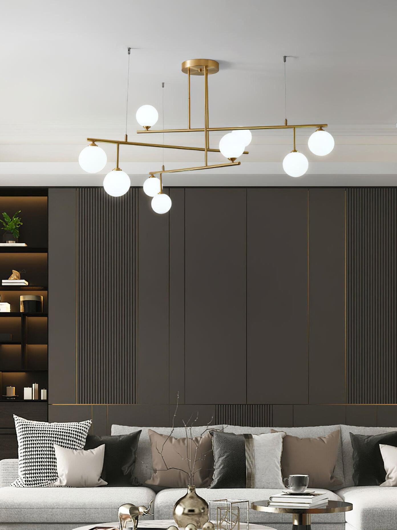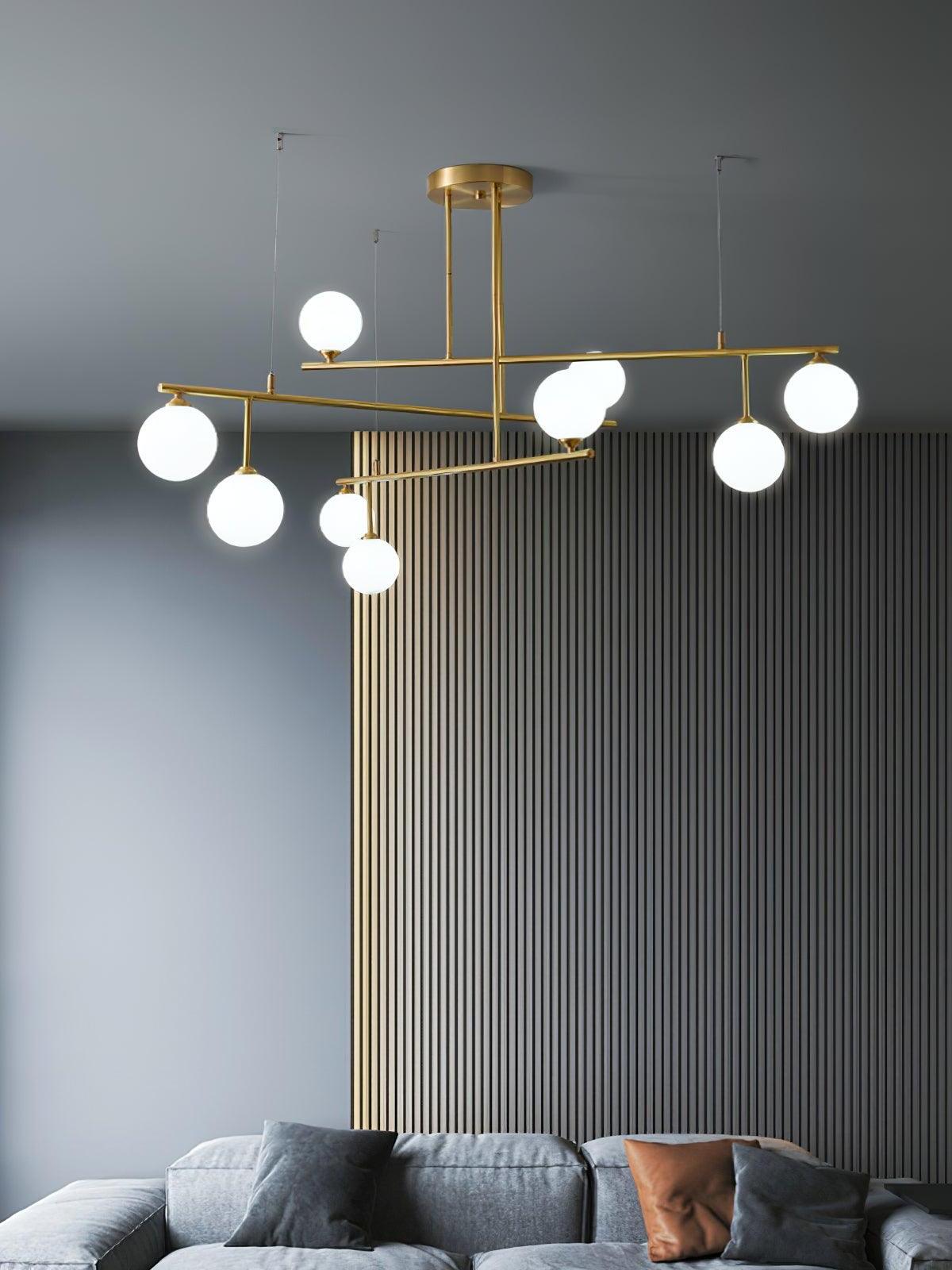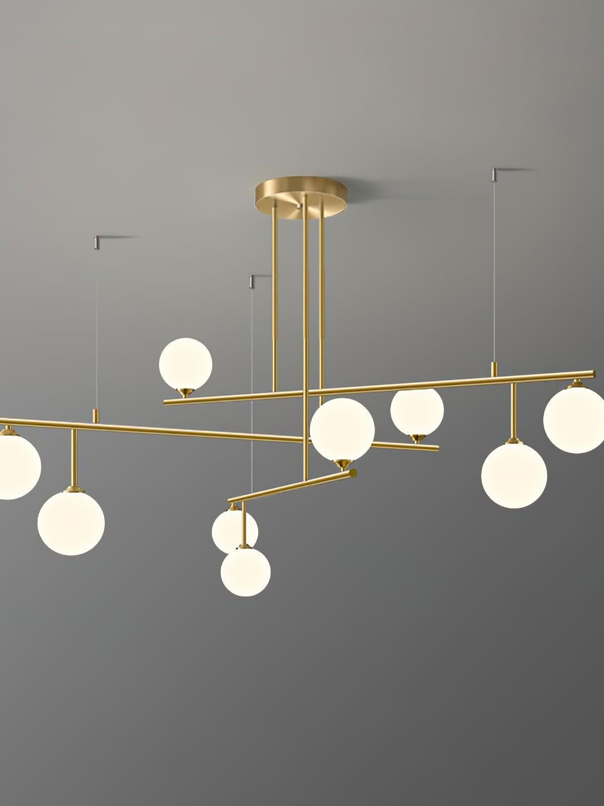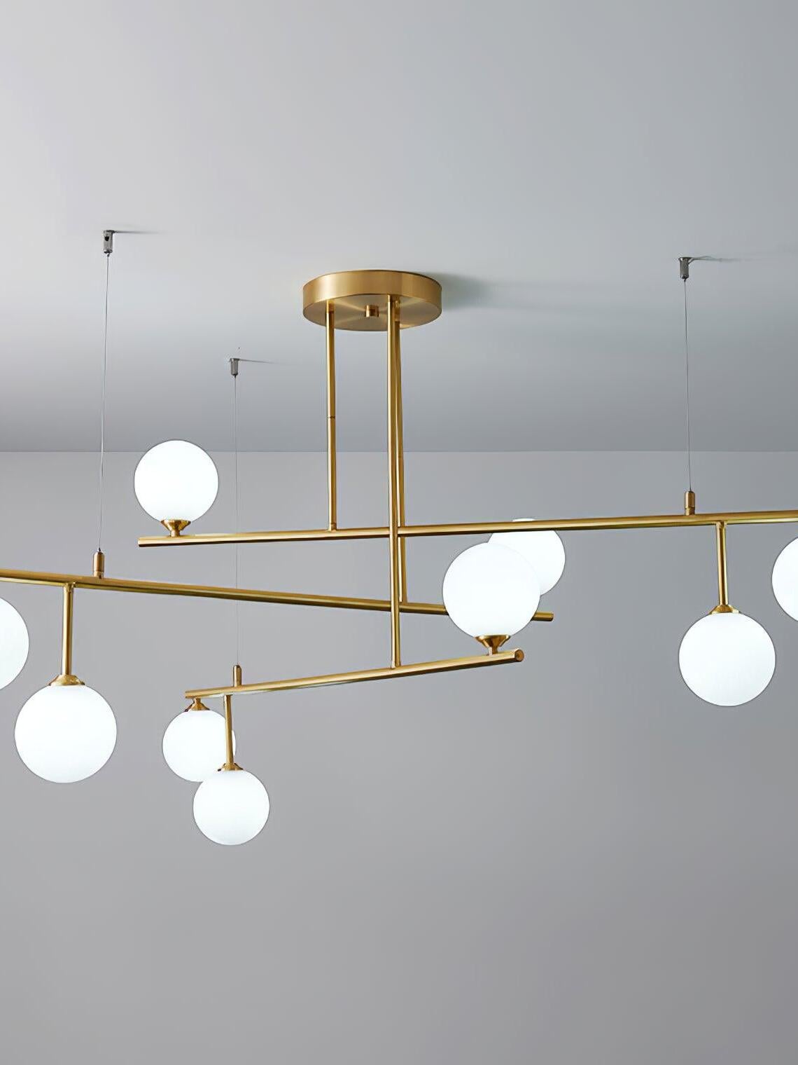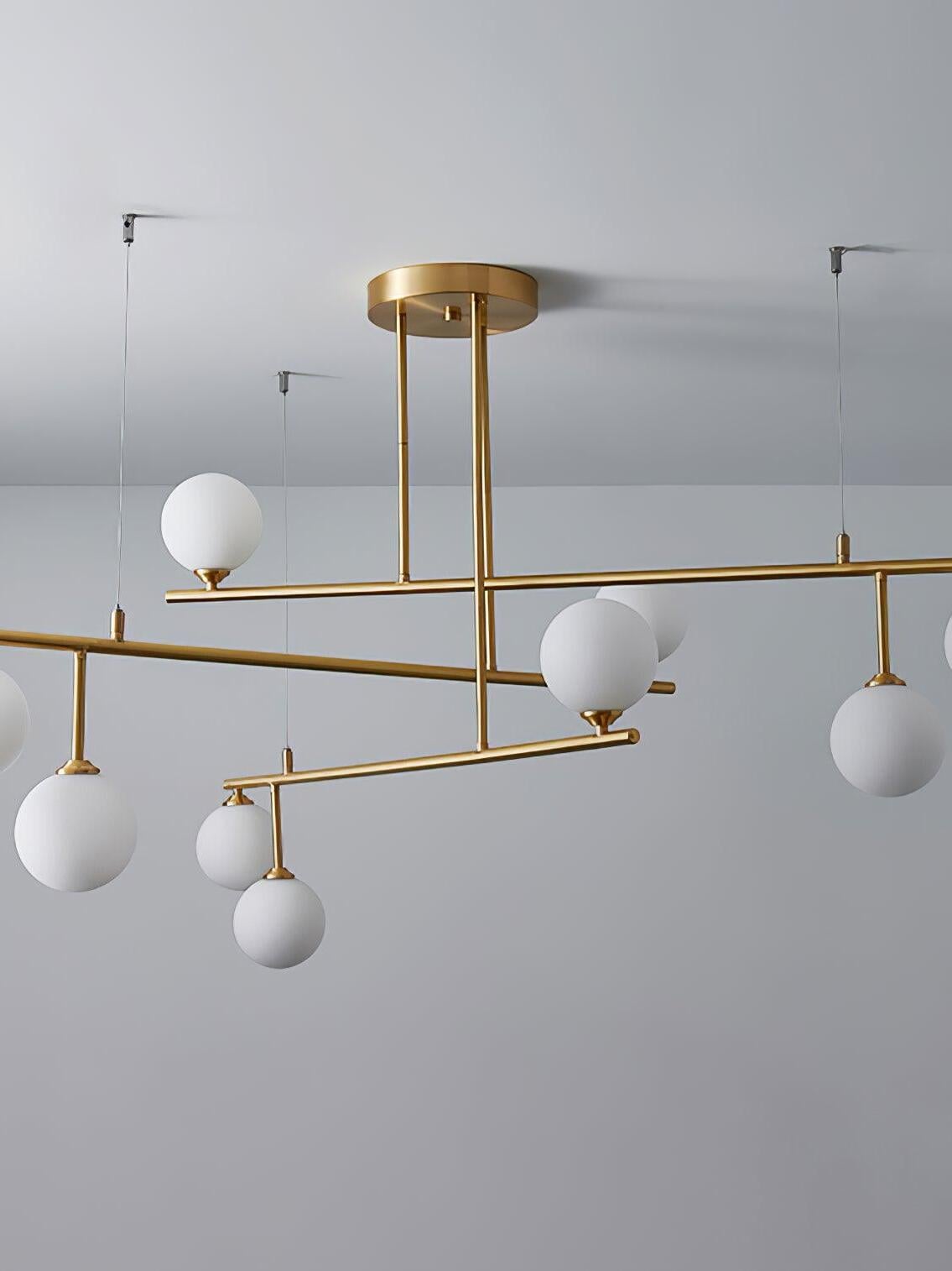 A slight departure from true linear form, this asymmetric grid-like layout of lights delivers strong visual presence. A balancing act of materials and proportions, the tiered steel frame seamlessly flows into antique brass arms for a striking contrast. Each arm presents an white glass globe, which range in size for added drama. Perfect for contemporary spaces, or for adding a modern touch to traditional settings.