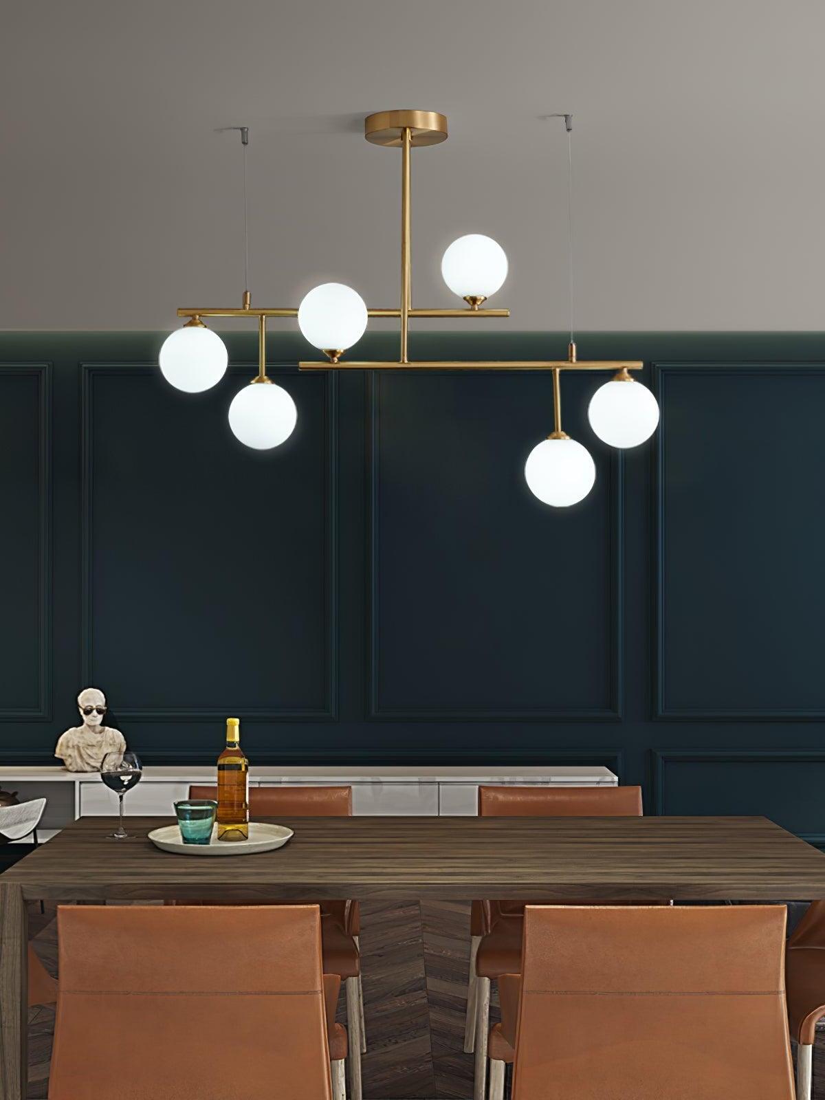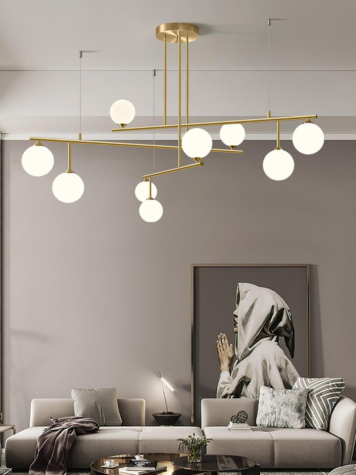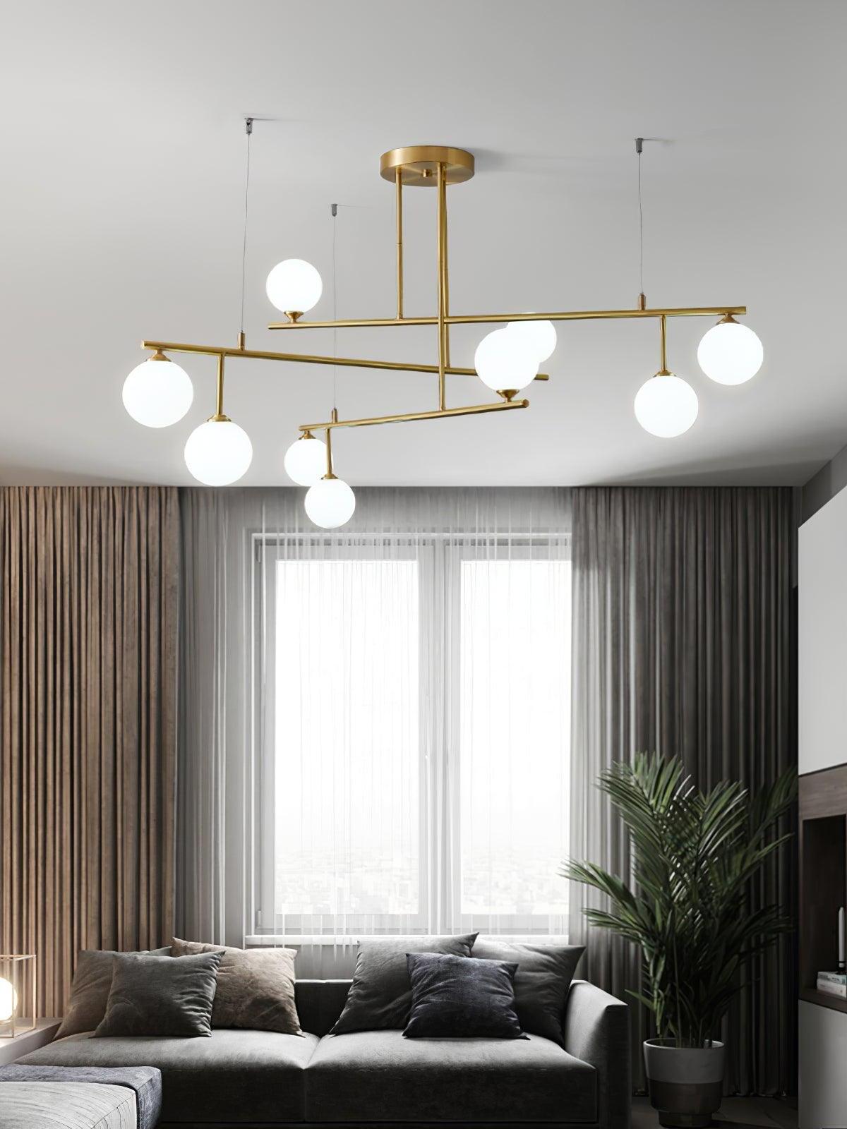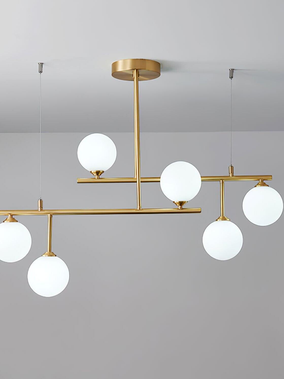 A slight departure from true linear form, this asymmetric grid-like layout of lights delivers strong visual presence. A balancing act of materials and proportions, the tiered steel frame seamlessly flows into antique brass arms for a striking contrast. Each arm presents an white glass globe, which range in size for added drama. Perfect for contemporary spaces, or for adding a modern touch to traditional settings.