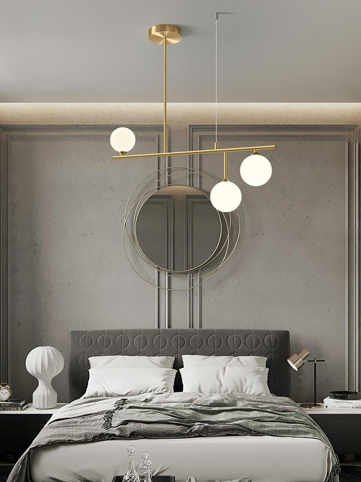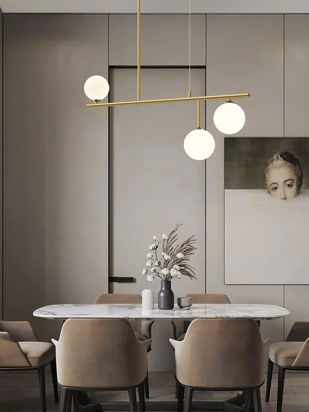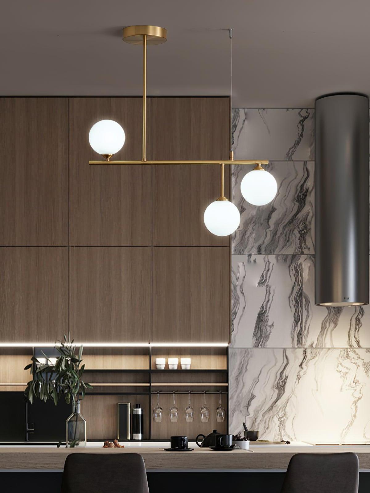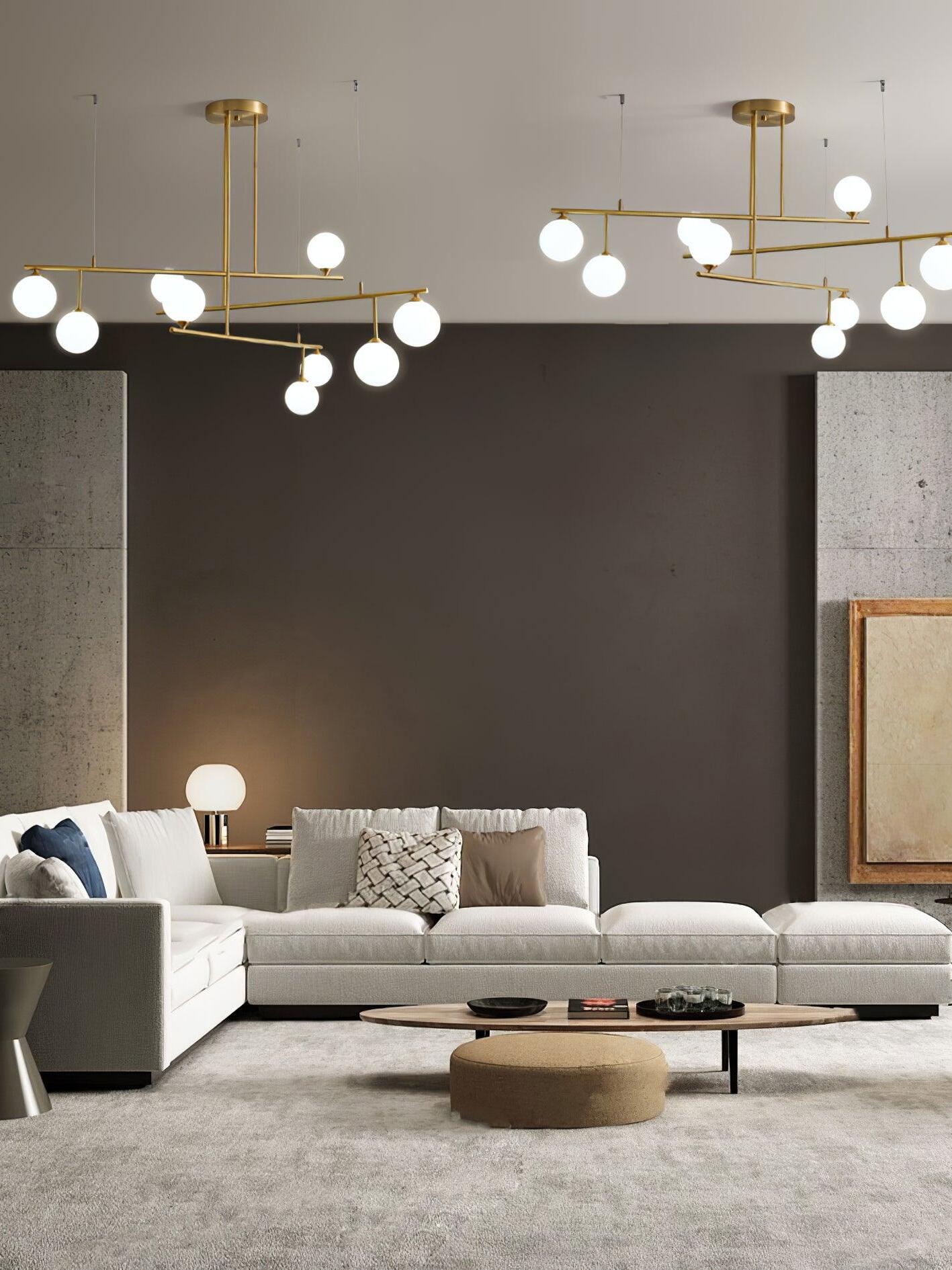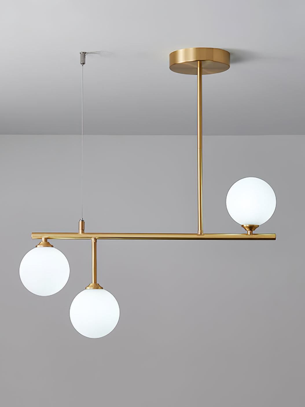 A slight departure from true linear form, this asymmetric grid-like layout of lights delivers strong visual presence. A balancing act of materials and proportions, the tiered steel frame seamlessly flows into antique brass arms for a striking contrast. Each arm presents an white glass globe, which range in size for added drama. Perfect for contemporary spaces, or for adding a modern touch to traditional settings.