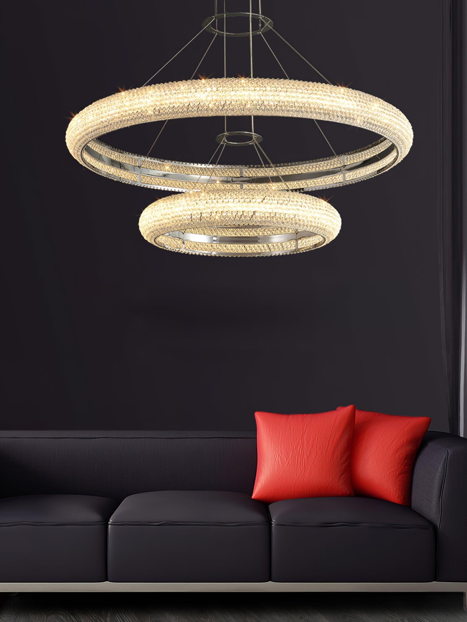 Rings of sparkling crystals on 24-carat gilded finished metal frames holding dimmable LEDs: Our new Asscher Ring Chandelier design adds style and glamour to any setting. These handcrafted lights from the heart of Europe make a statement, either as a solo piece or in a mix of two or more lights.