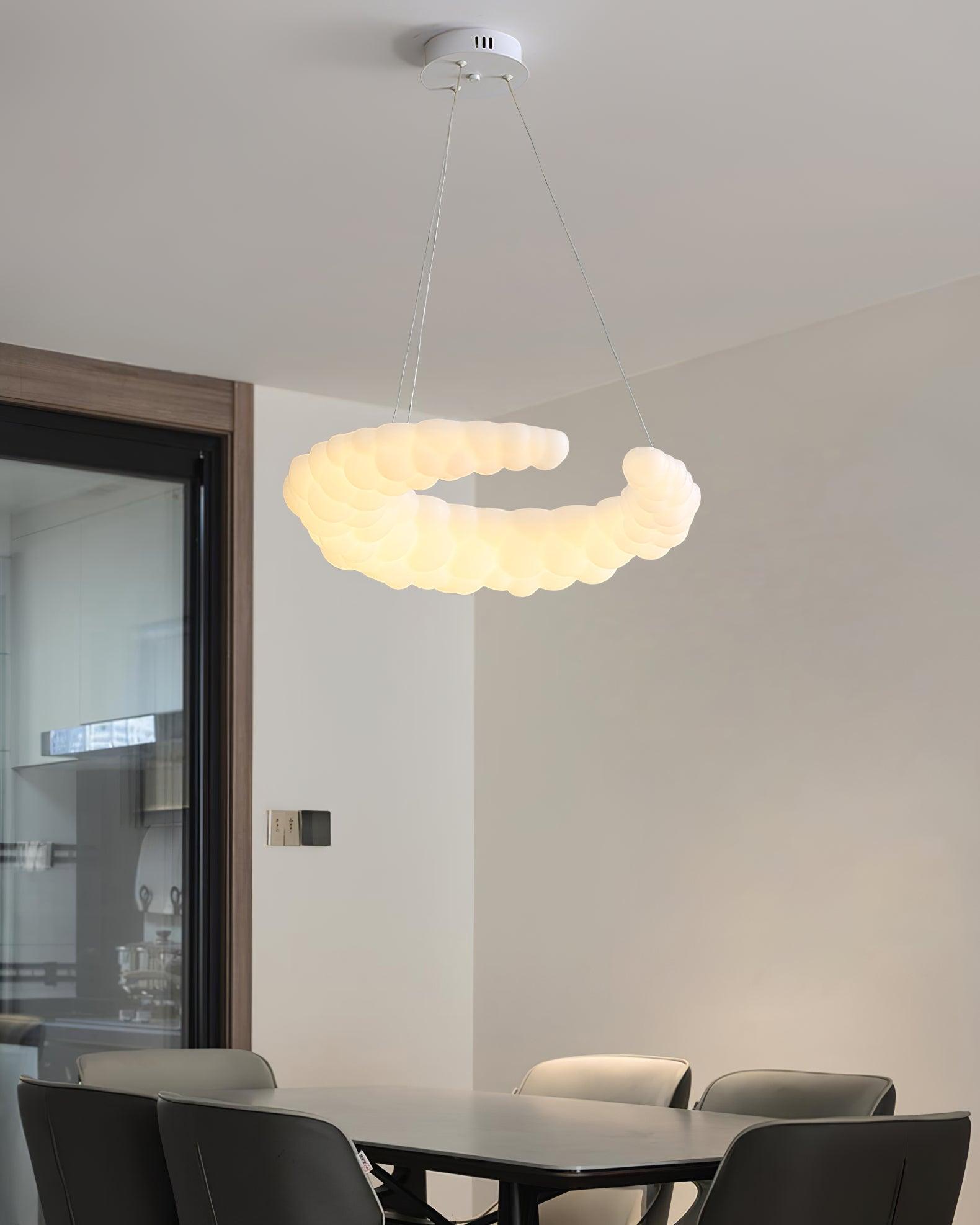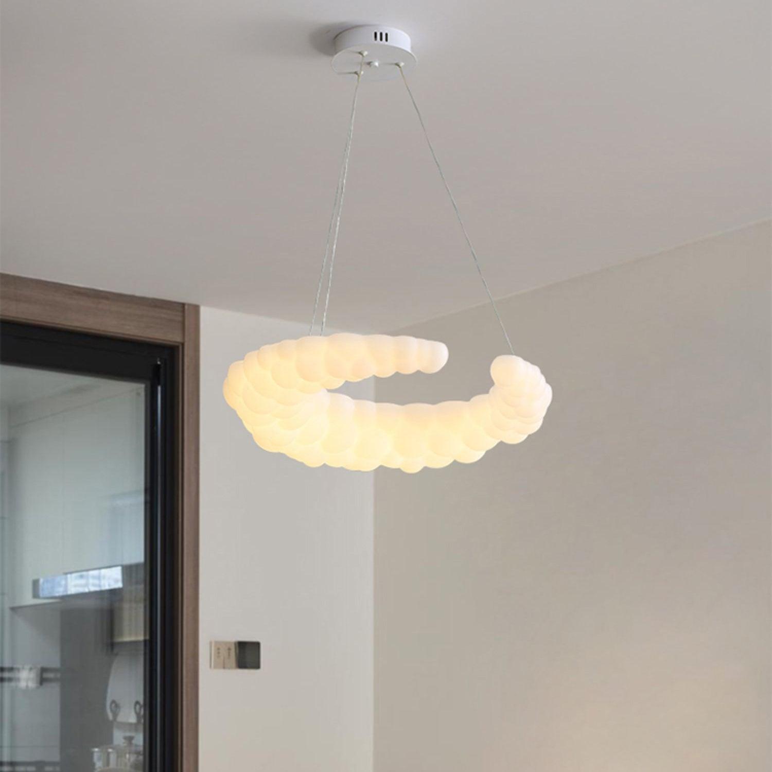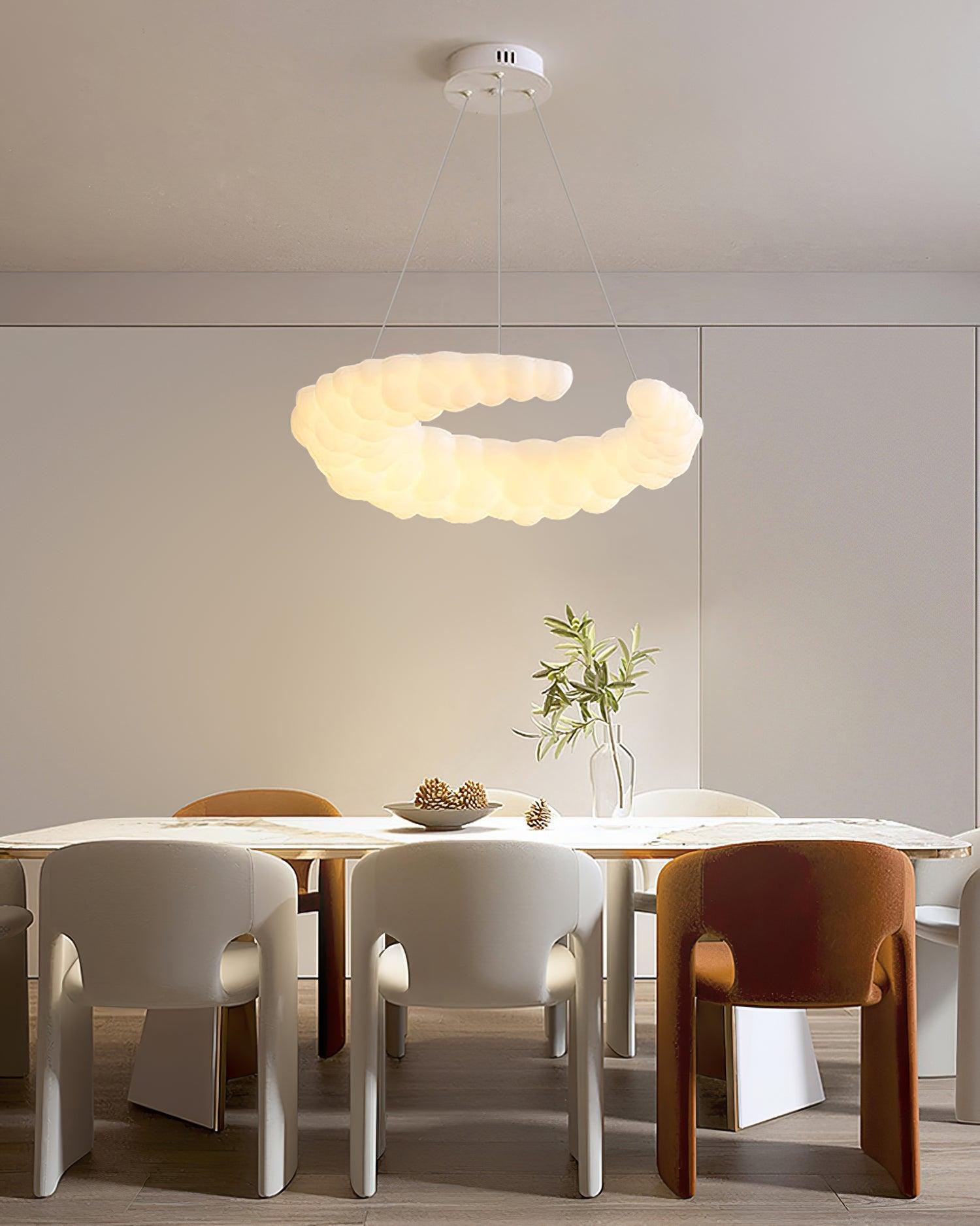 The contemporary pendant in white finishes can go with any style of decor The Moon-shaped shade resembles the aura in the air. Furthermore, the pendant light is a halo-shaped ring as well as the bulbs that are LED built into the frame, brimming with sentimental love. hanging wire can be adjusted and you can position the light fixture wherever you want in your home.