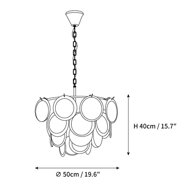 The Bettina Murano Chandelier is a luxurious lighting piece to bring a touch of sophistication to any room. The white, softly glowing glass discs create a warm and inviting ambiance. An ideal choice for elegant home decor.