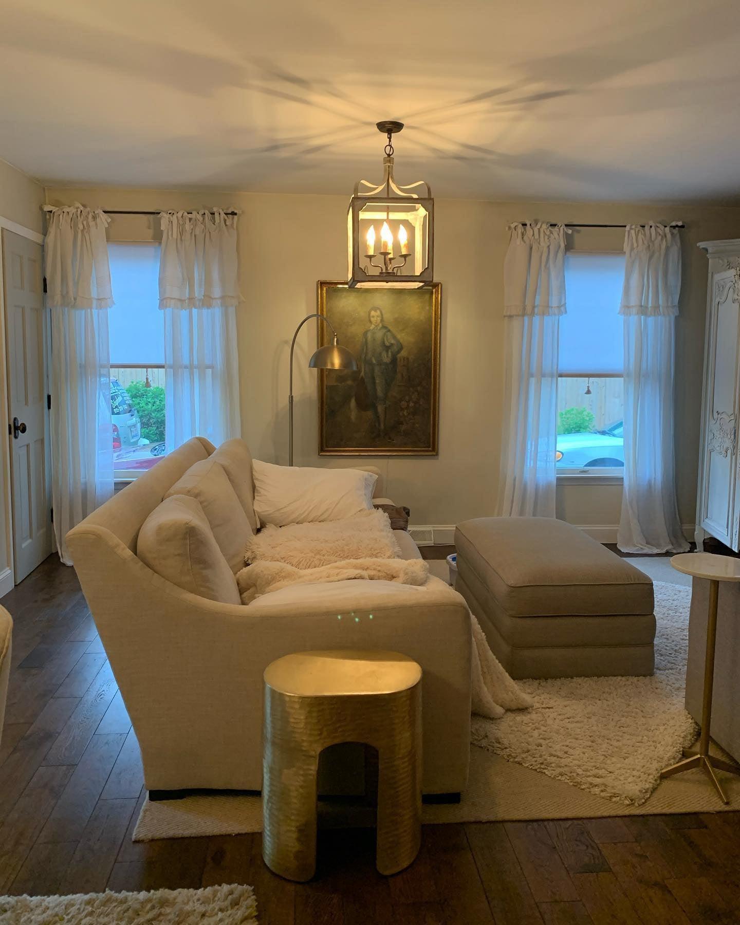 A distressed wood frame in washed grey with golden trim is held aloft by four iron arms, giving this fixture a romantic, weathered cottage-style look and feel. Place this boxy lantern-style chandelier in a foyer or group several above an island or dining table.