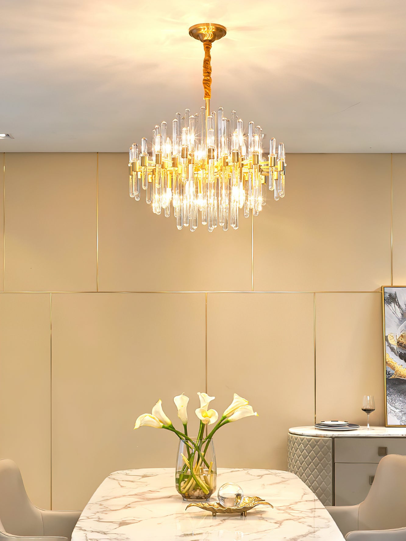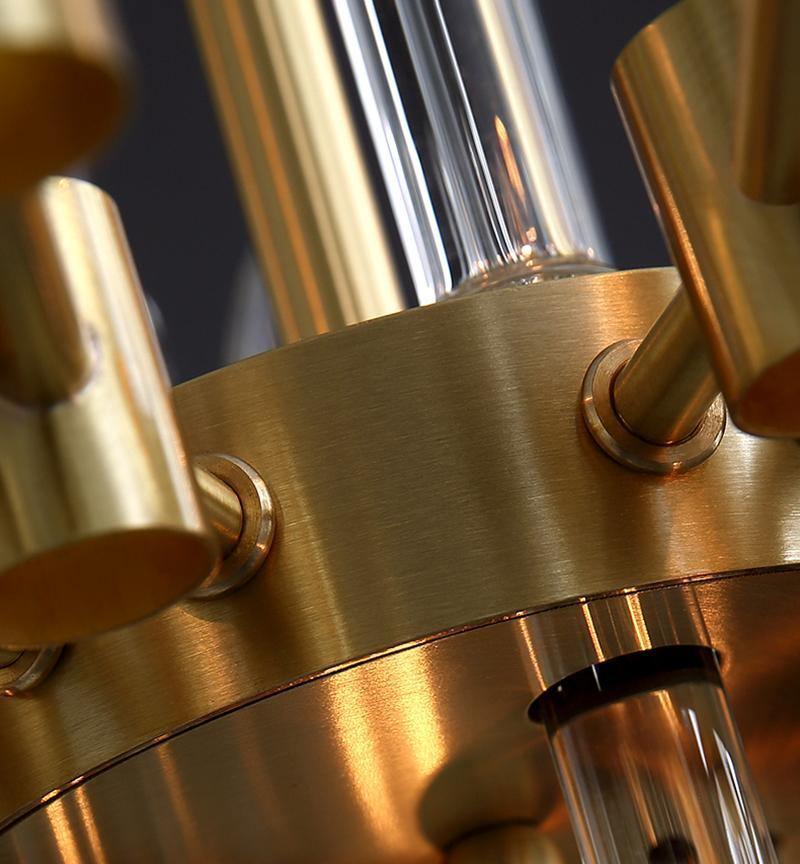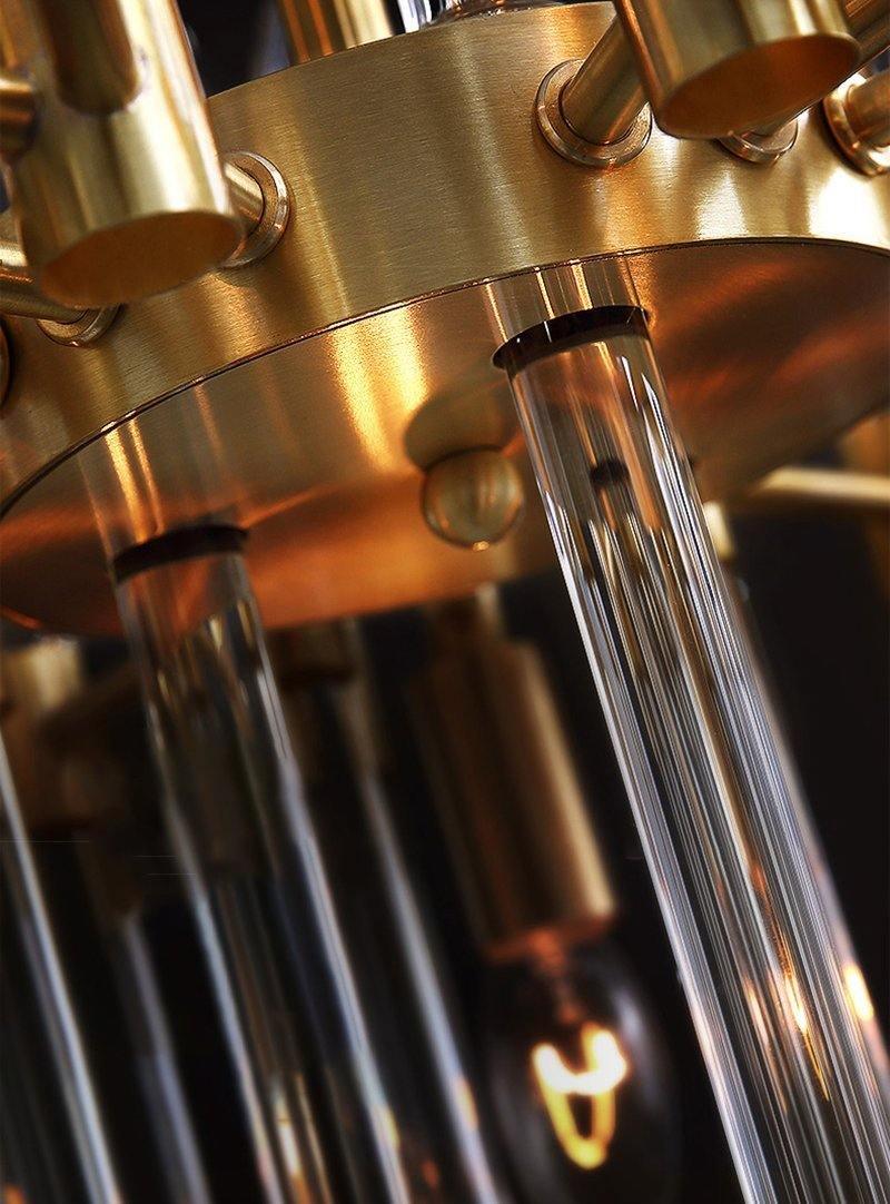 The Antique Brass Chandelier boasts a starburst design that's contemporary and stylish. Made of brass with a vintage-inspired brushed brass finish, and getting its cue from mid-century modern designs, this incredible chandelier is highlighted with clear glass rods that give it a sparkling, spacy effect. perfectly marries the modern elegance of the past with the flair of anew. Finished in a beautifully refined Burnished Antique Brass finish accented by clear glass rods, destined to withstand the ages. Made with solid brass construction to look great.