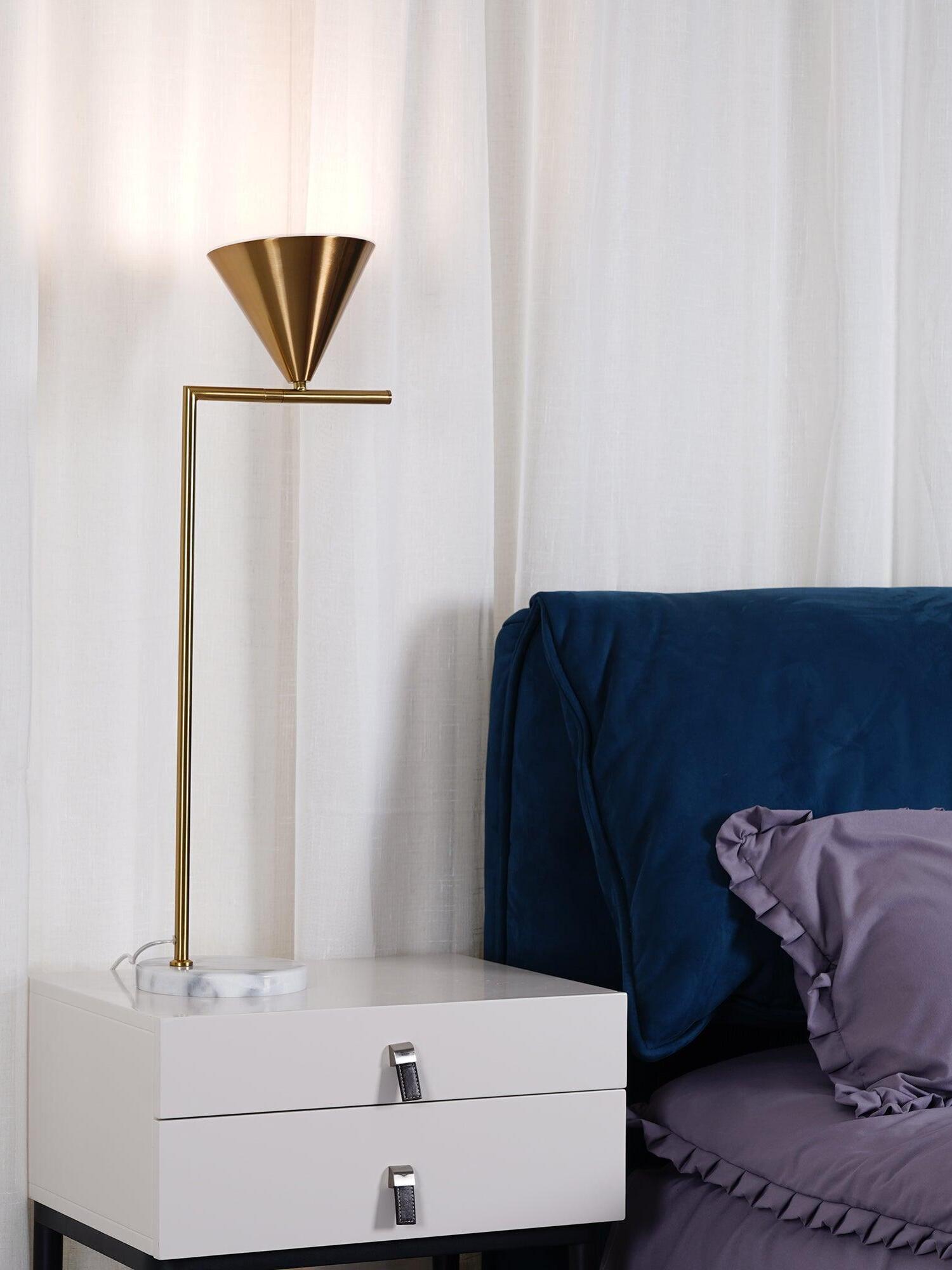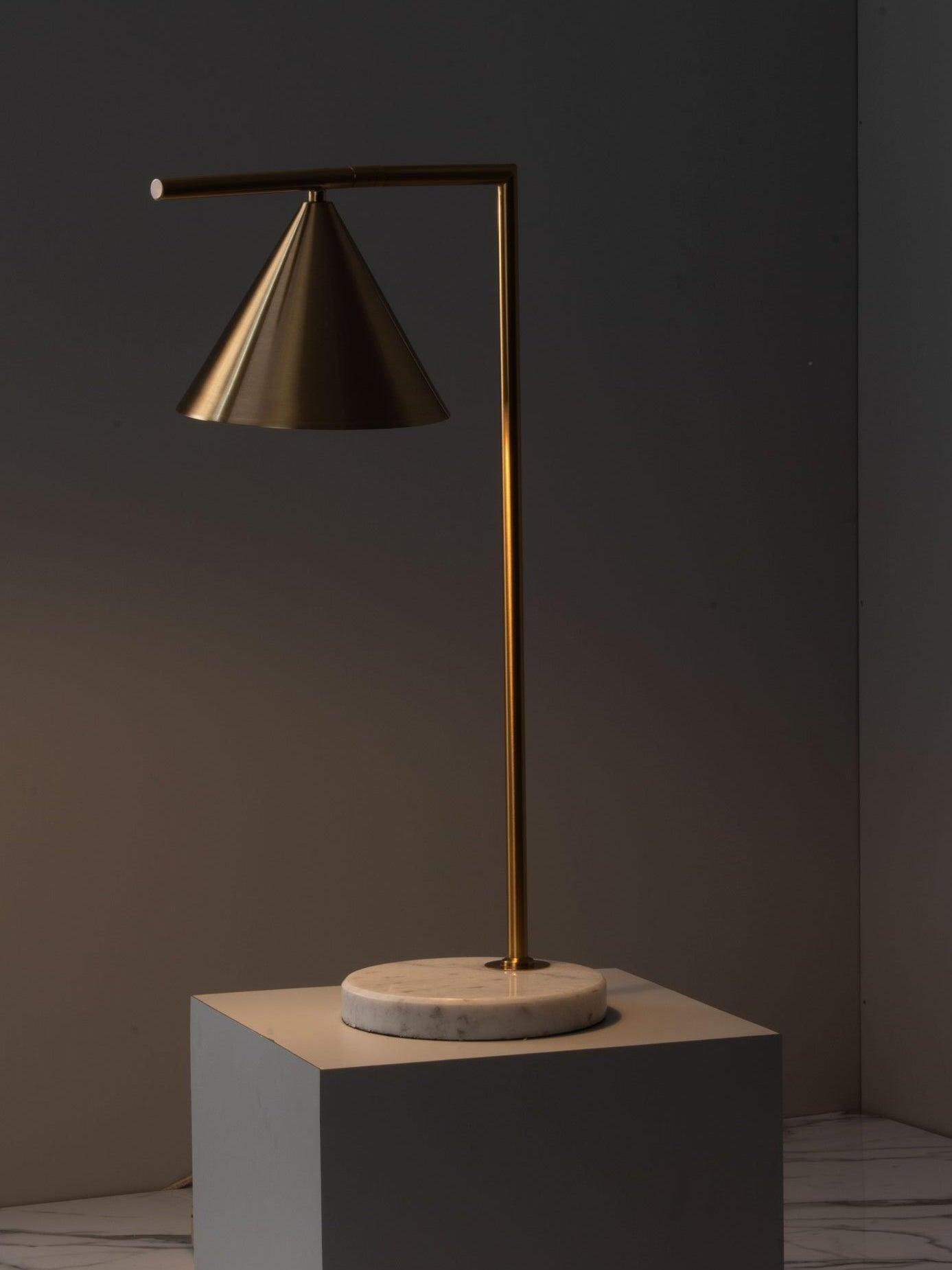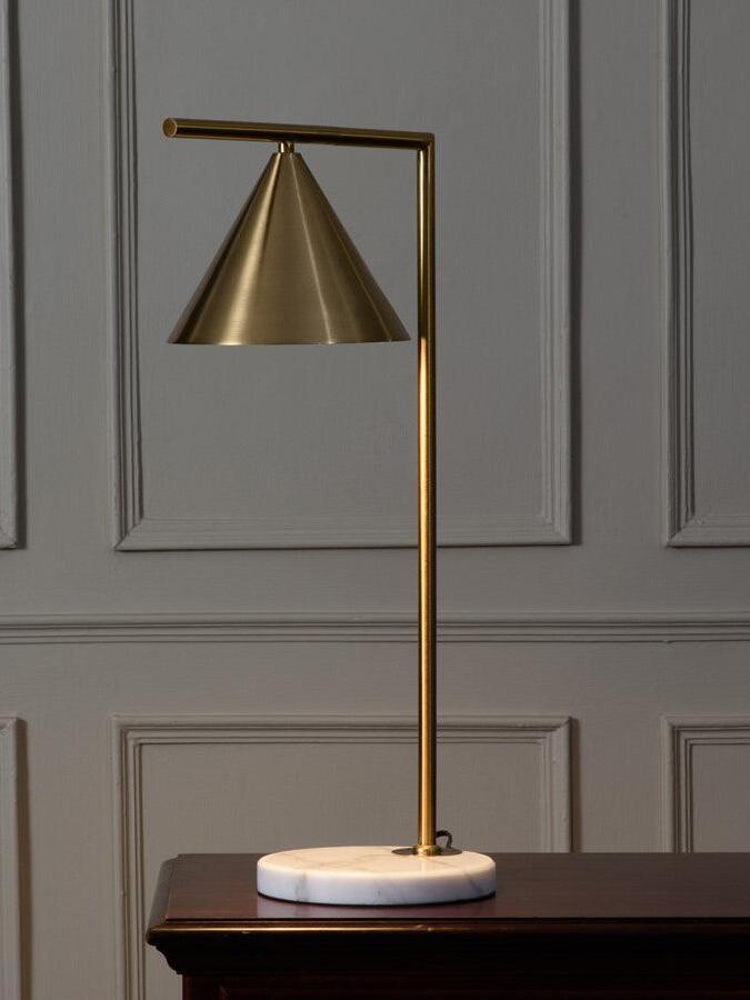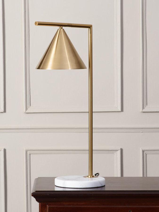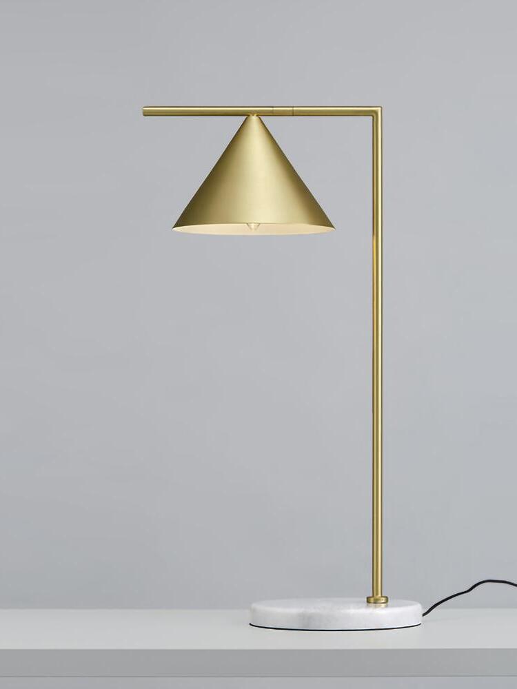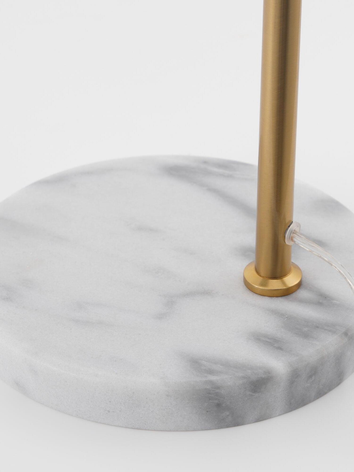 Sleek and graceful, this versatile floor lamp features smart details from head to toe. At the top, its spinning cone diffuser provides direct light that can be repositioned. On the bottom, it is weighted by a stunning white Carrara or black Marquina marble base. Its stem and cone are available in painted steel or brushed brass. The diffuser is injection-molded opal photoengraved PC (polycarbonate). Its power cord measures 200 centimeters and features a foot switch with ON-OFF functions.