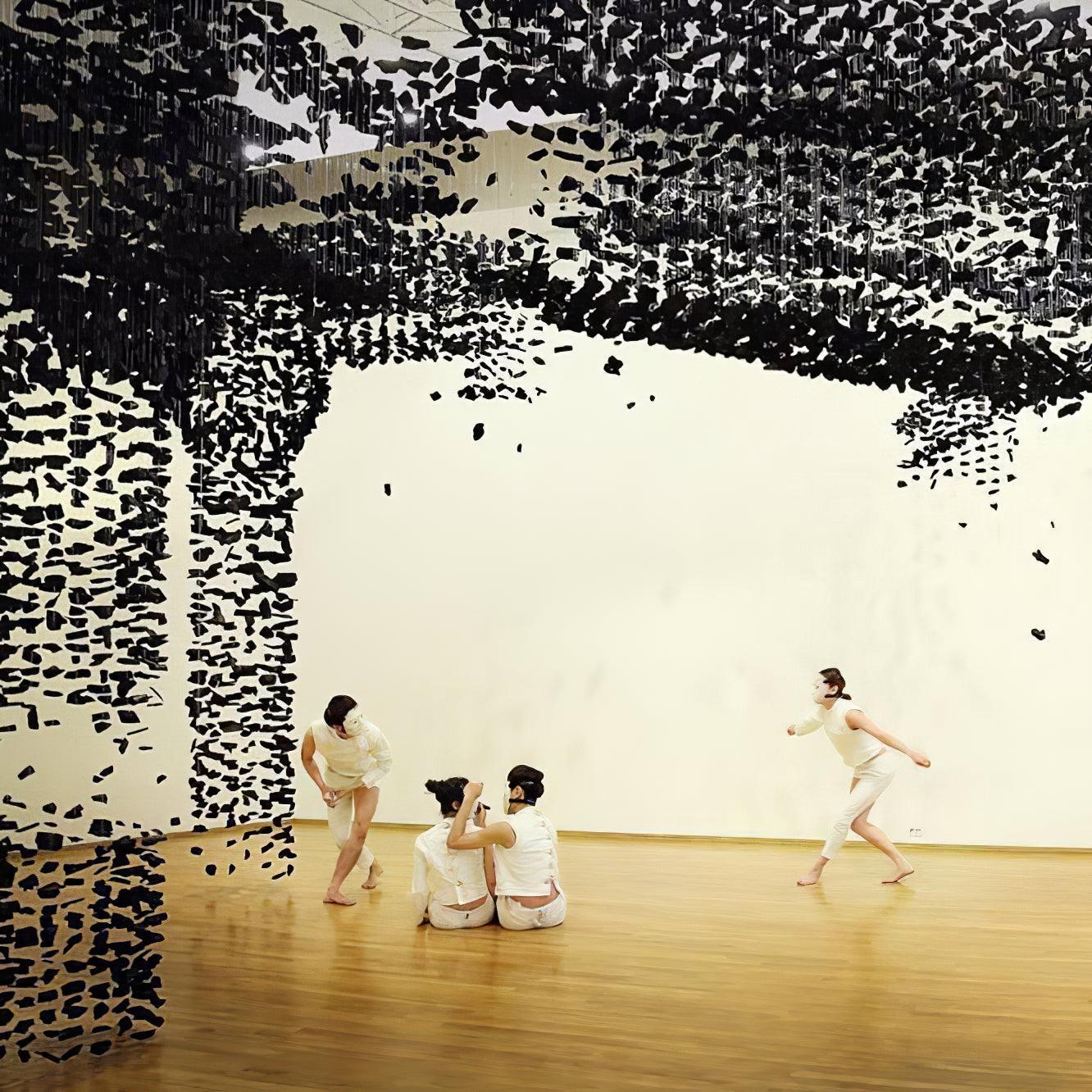 Beginning with one piece of charcoal, a line is formed and an area is filled, expressing the idea that everything in the universe interconnects. The use of charcoal, which simultaneously creates and destroys, implies that all of existence is condensed in a single point. The meaning is plain and unmistakable.