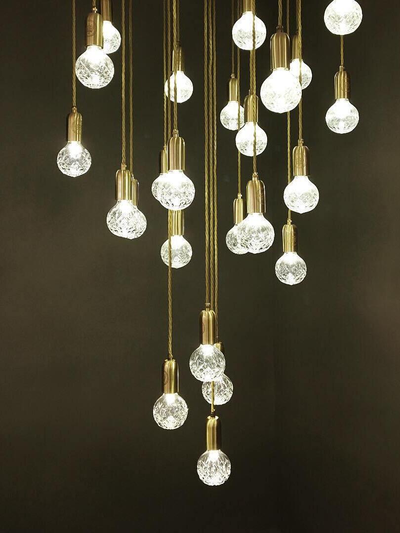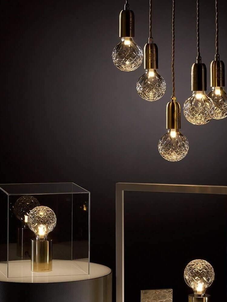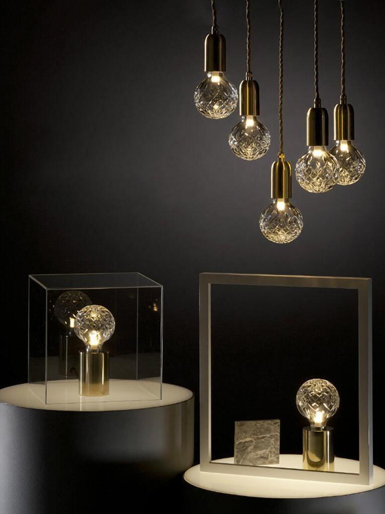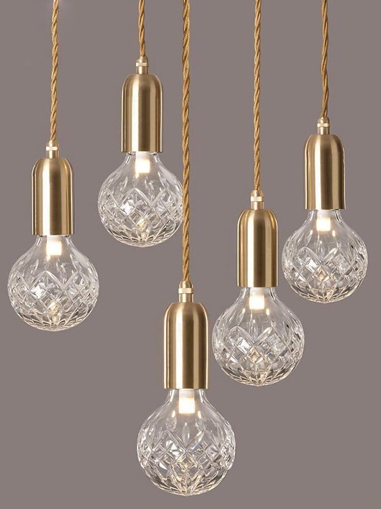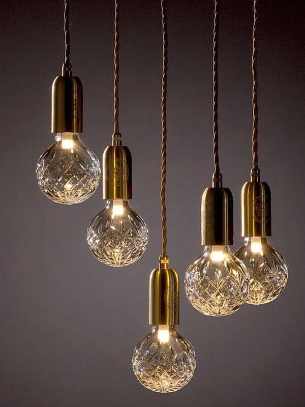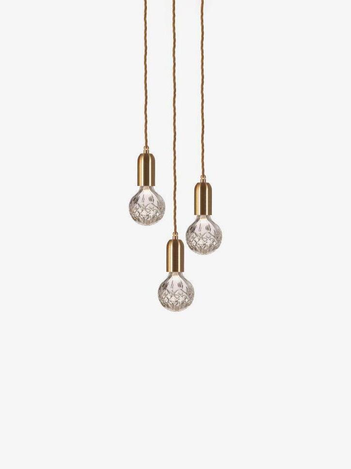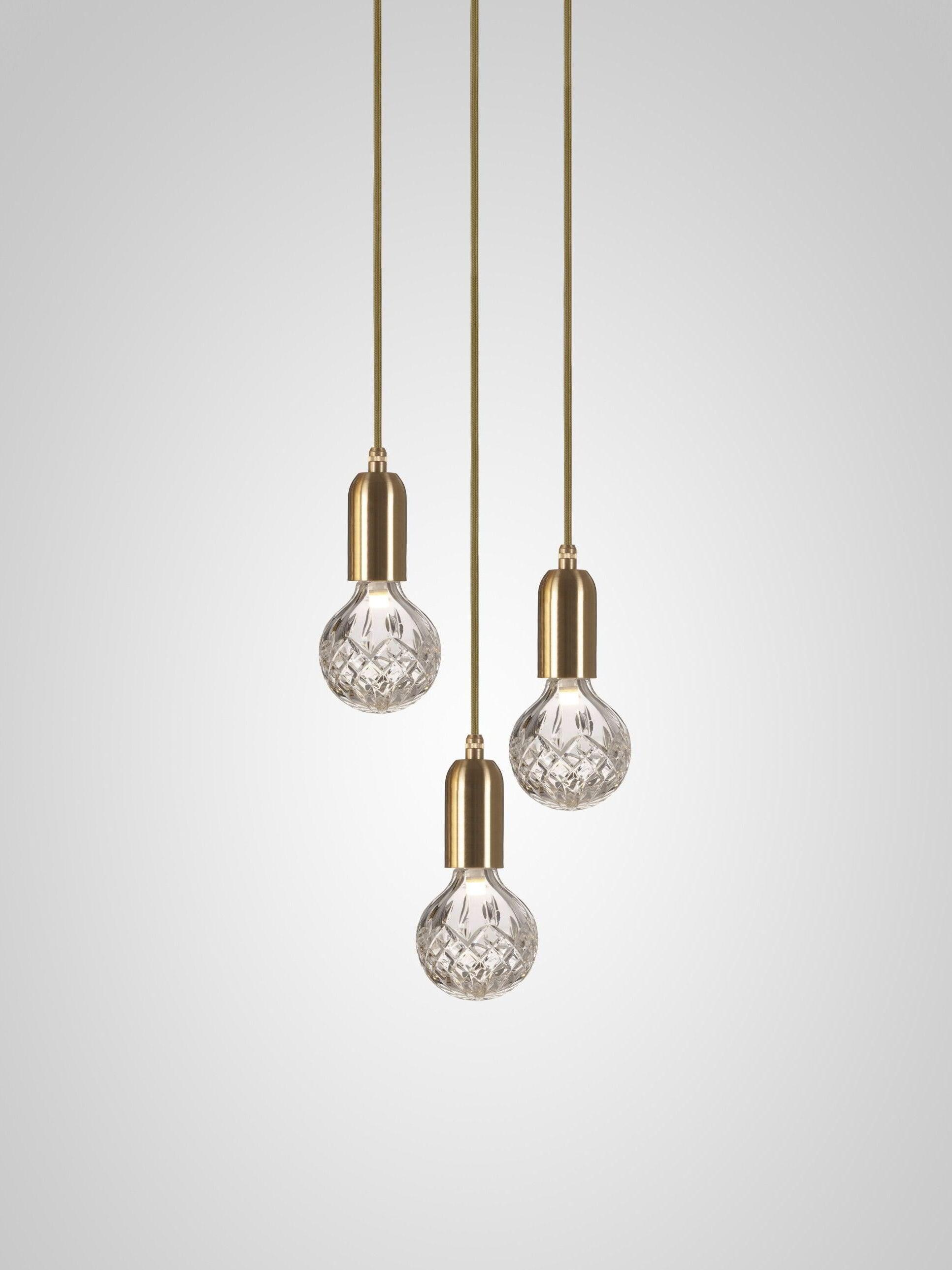 With the Crystal Bulb LED Multi-Light Pendant, Takes inspiration from the exquisite and meticulous process of crystal cutting, commonly seen in traditional whiskey glasses and decanters. A grouping of spherical crystal shades suspends in an elegant composition, highlighted by their sophisticated hand-cut design. LED lighting diffused by the shades culminates into a clean ambient glow that accentuates the engraved ornamental logo on each of the Steel lamp holders.
