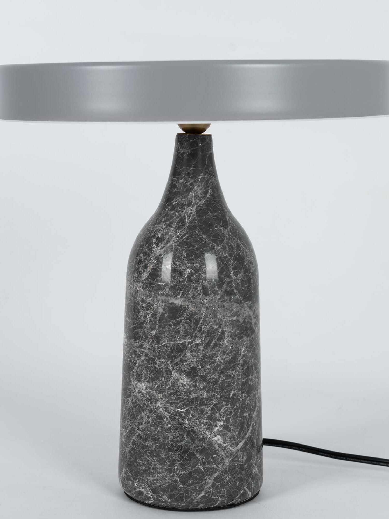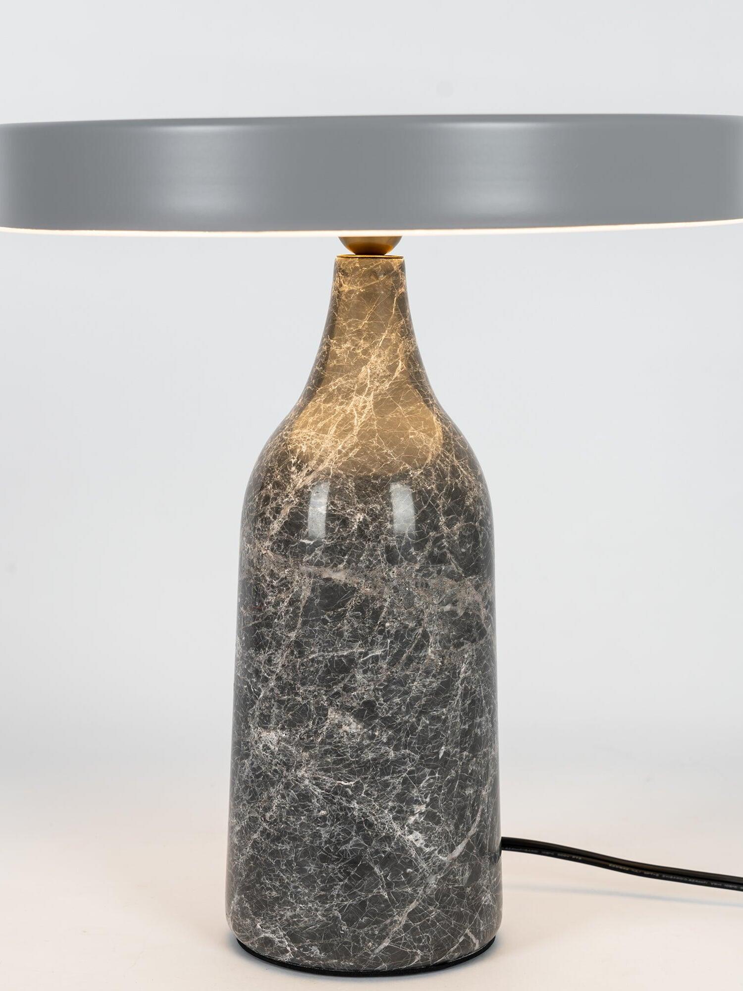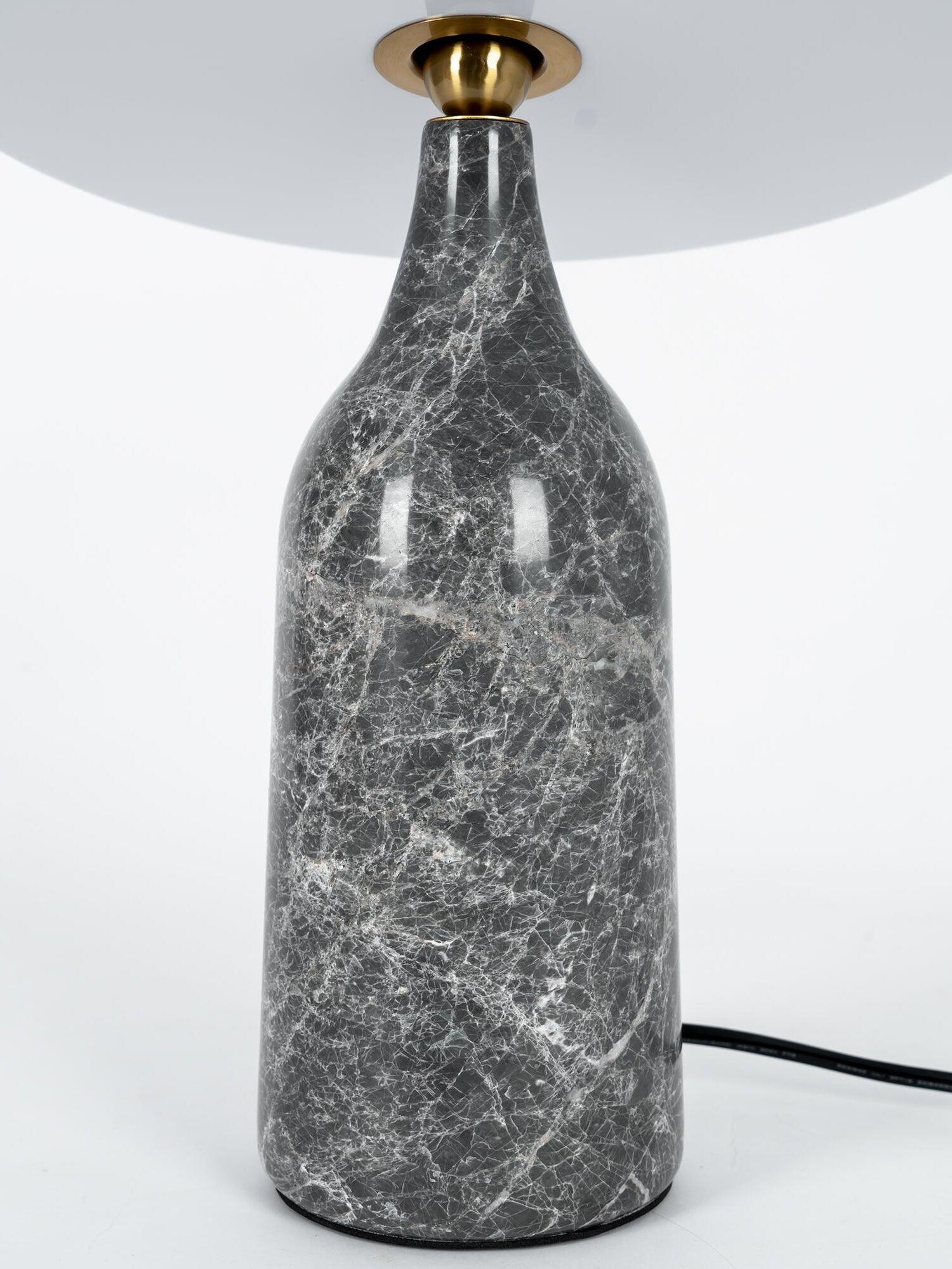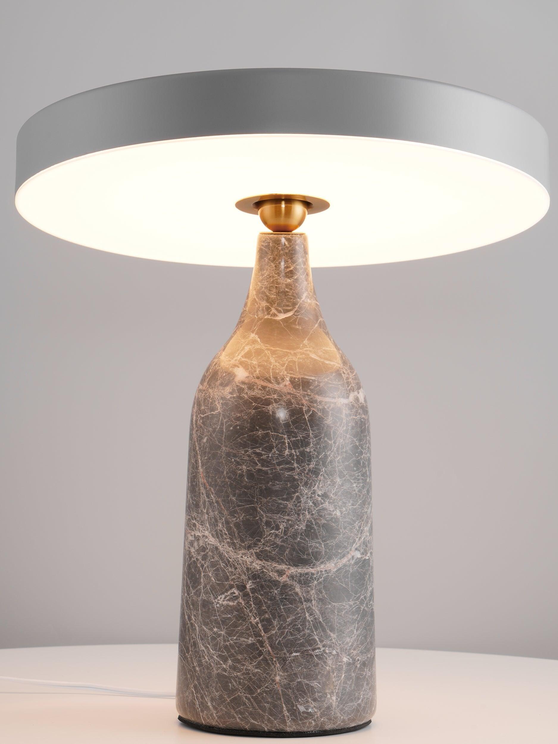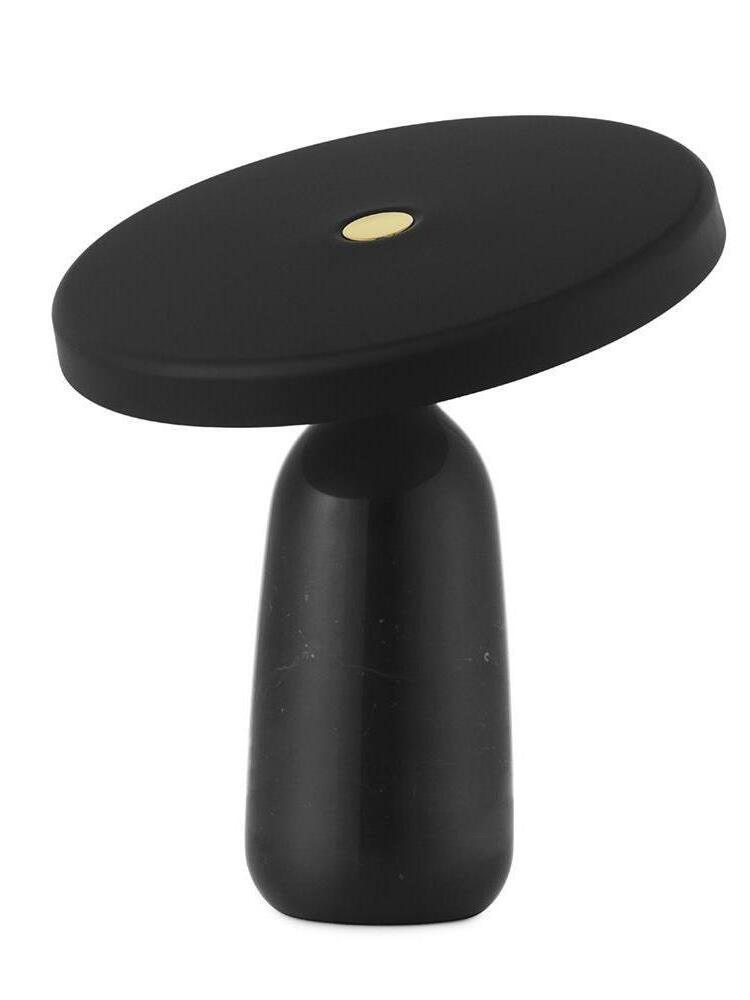 The table lamp consists of a steel screen with an integrated LED light source and a lamp base made of hand-turned to marble. Lampshade and base meet in a rotation point: a metal ball, which the shade can be tipped around to control the direction of the light. Brass dimmer on top of the lampshade. Textile-covered cord.