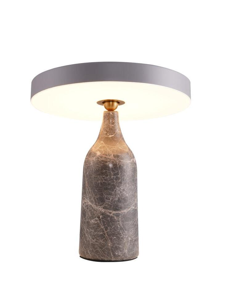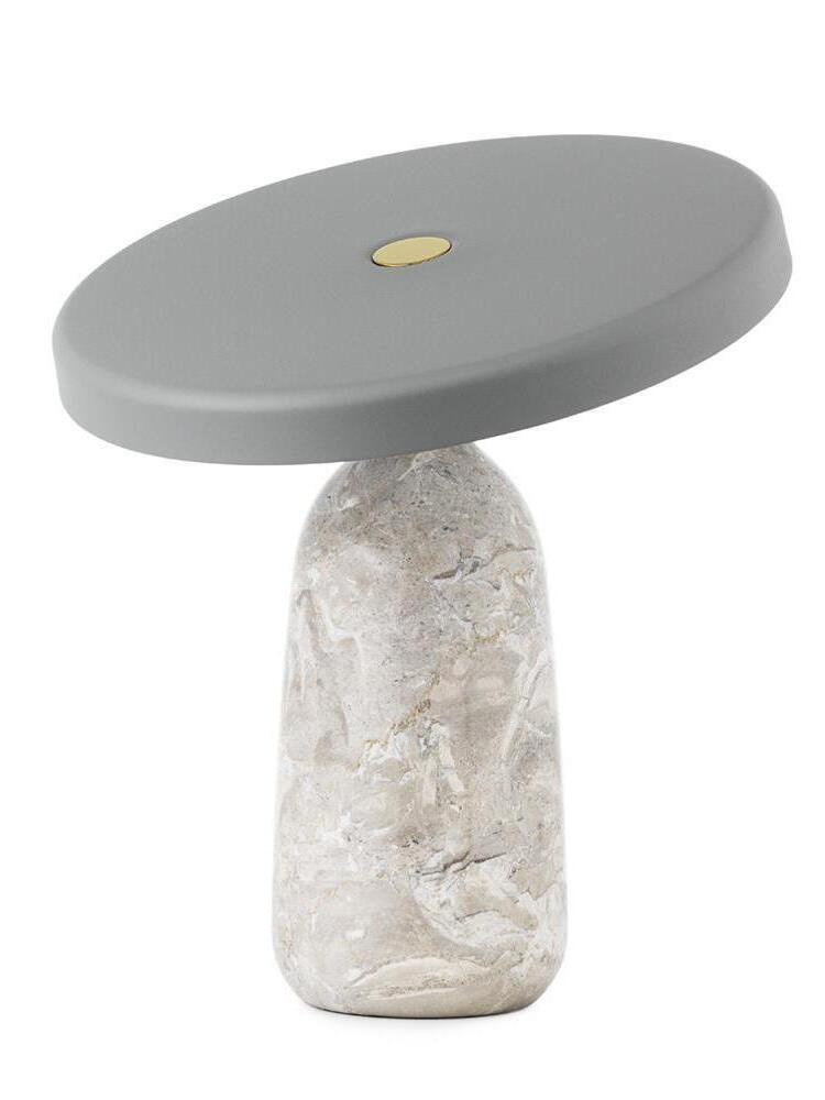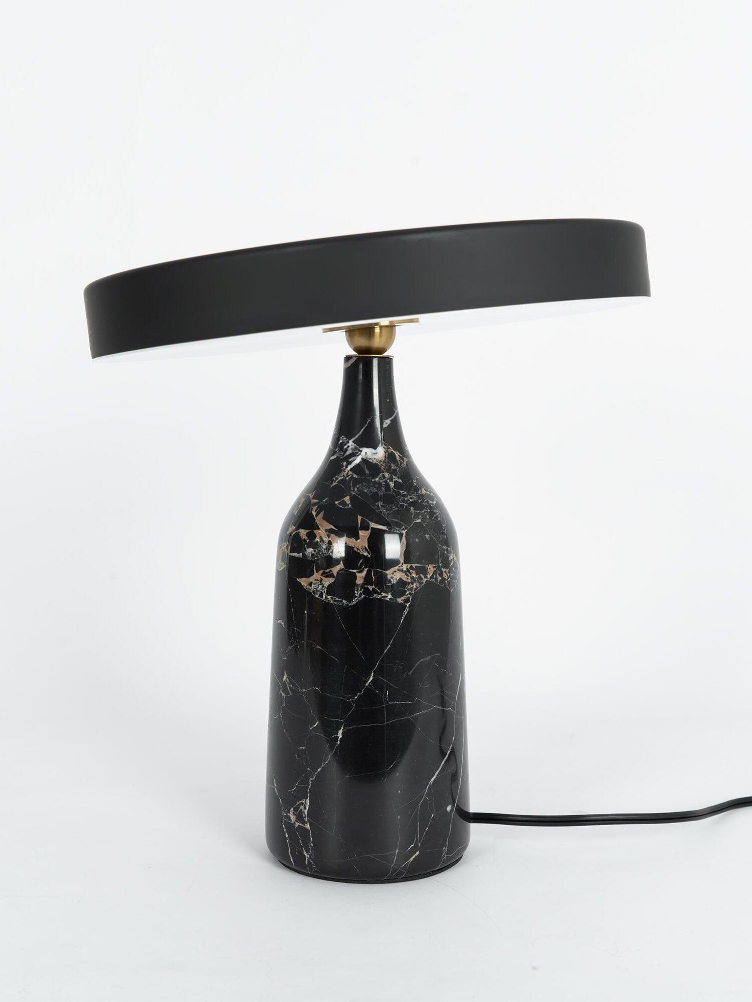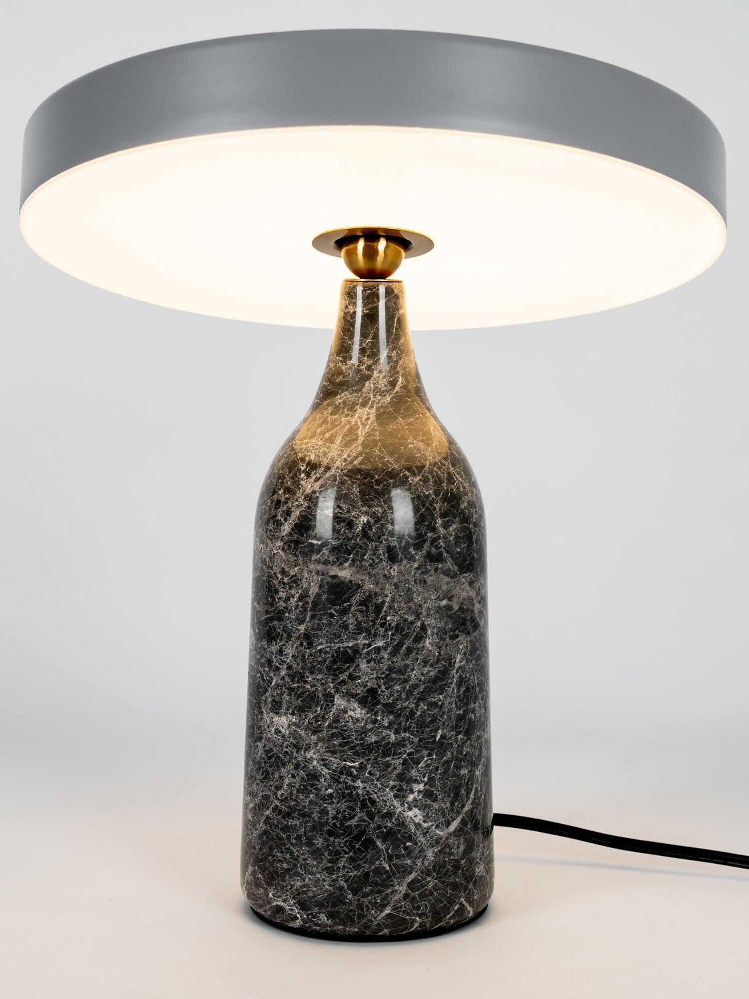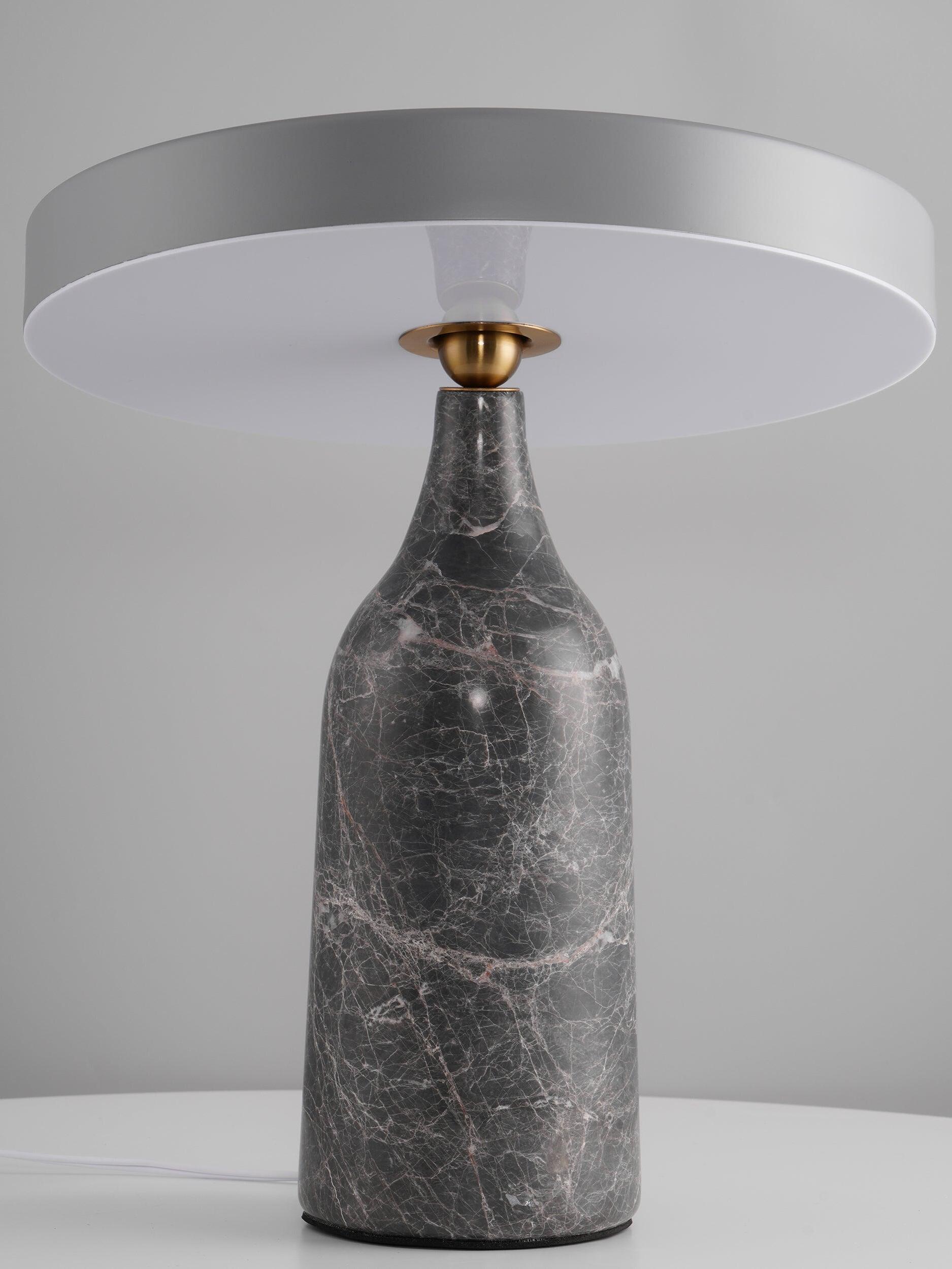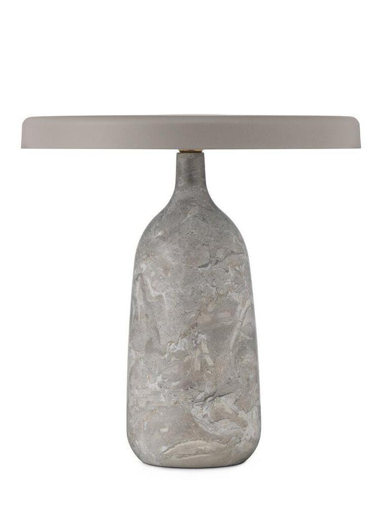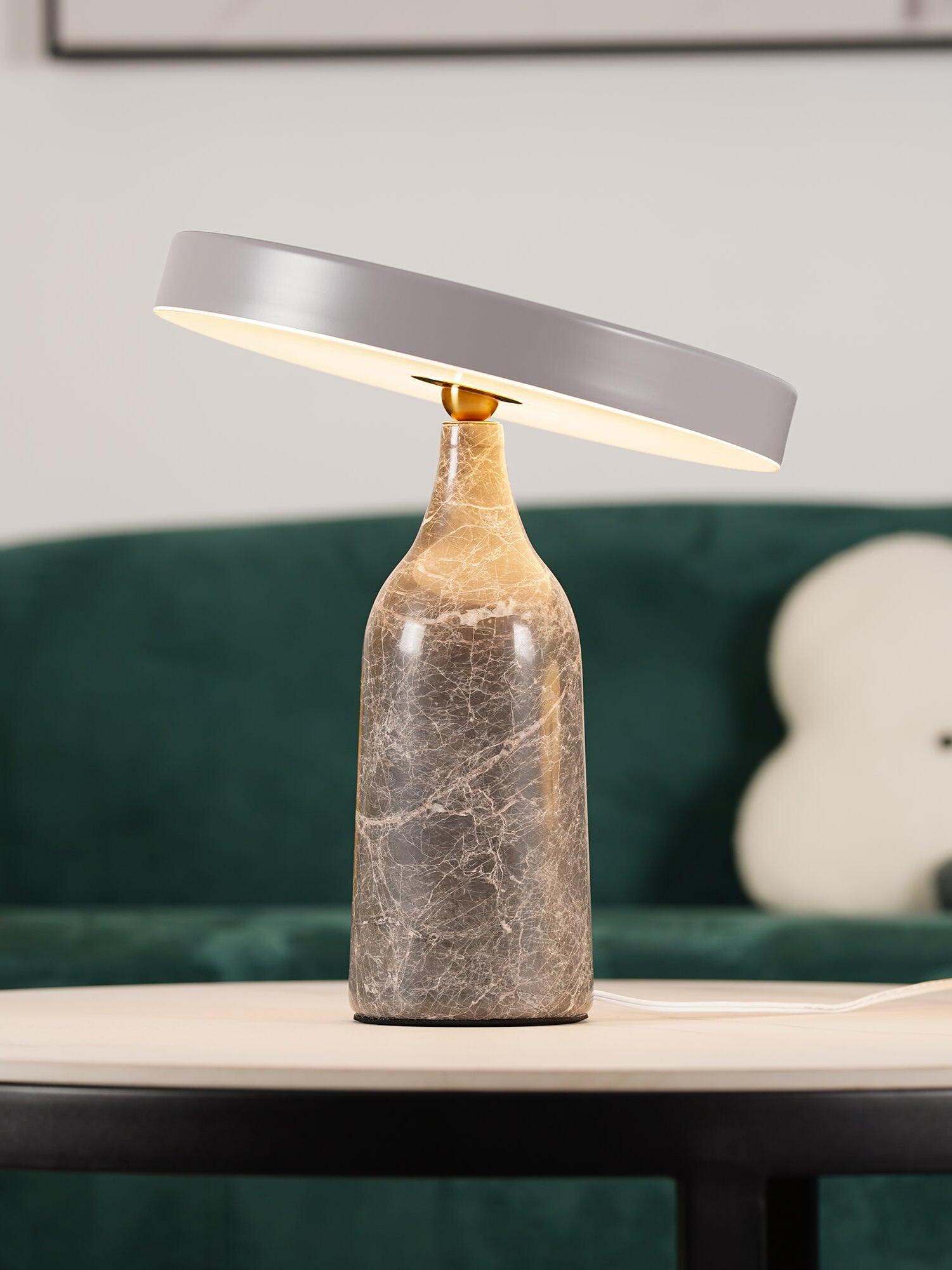 The table lamp consists of a steel screen with an integrated LED light source and a lamp base made of hand-turned to marble. Lampshade and base meet in a rotation point: a metal ball, which the shade can be tipped around to control the direction of the light. Brass dimmer on top of the lampshade. Textile-covered cord.