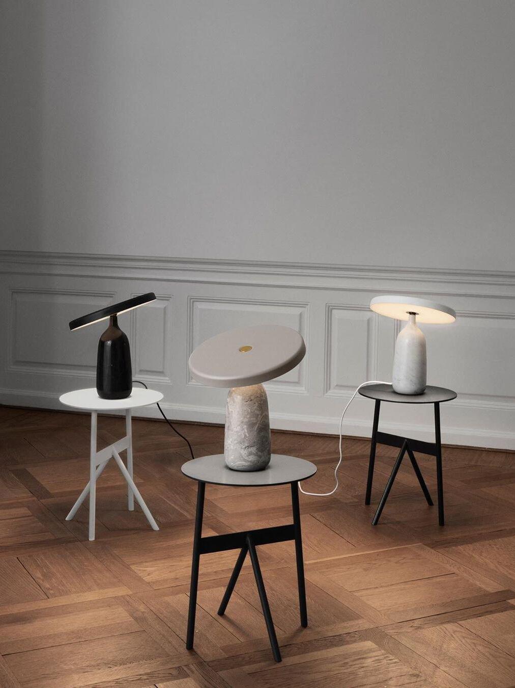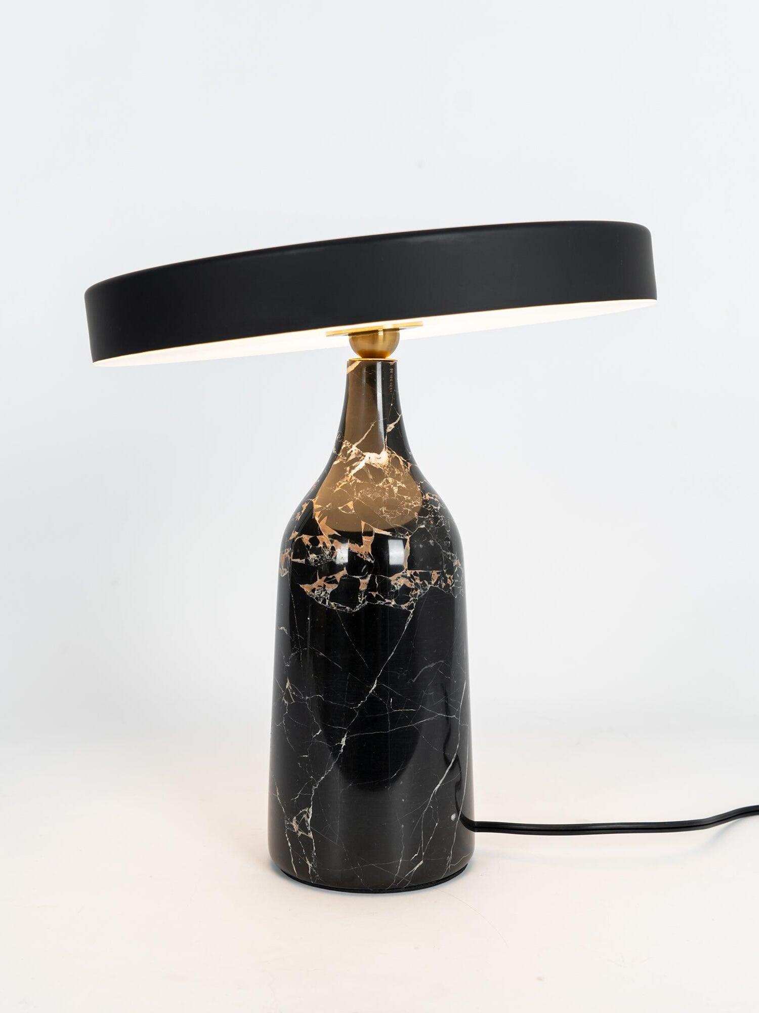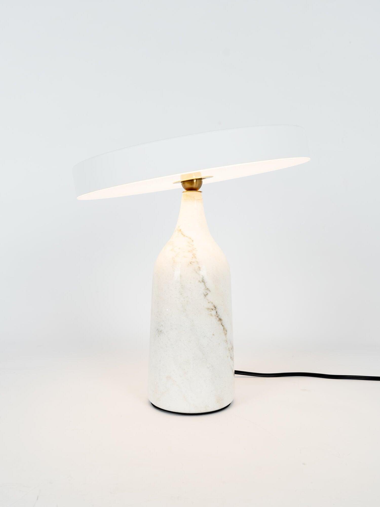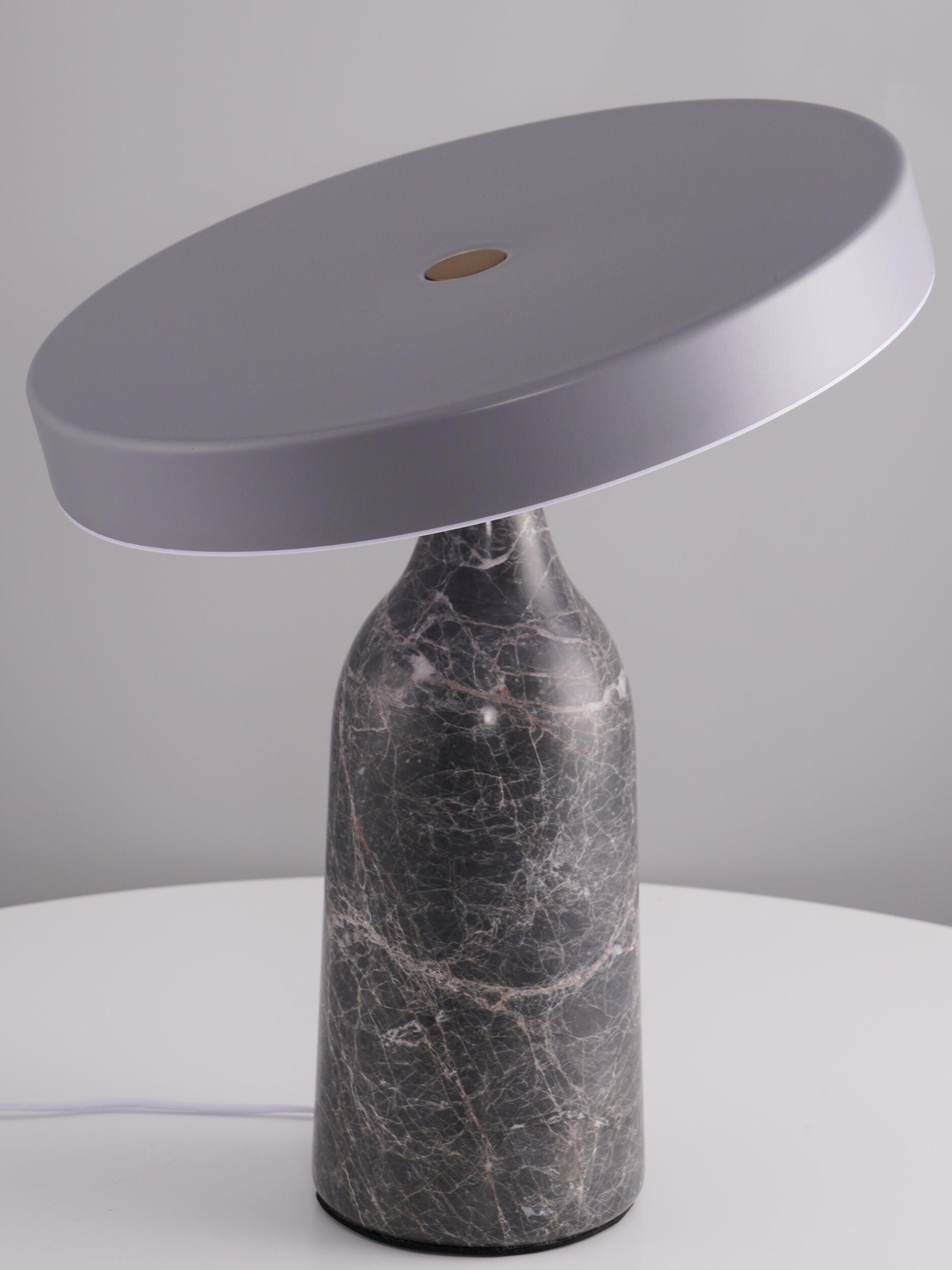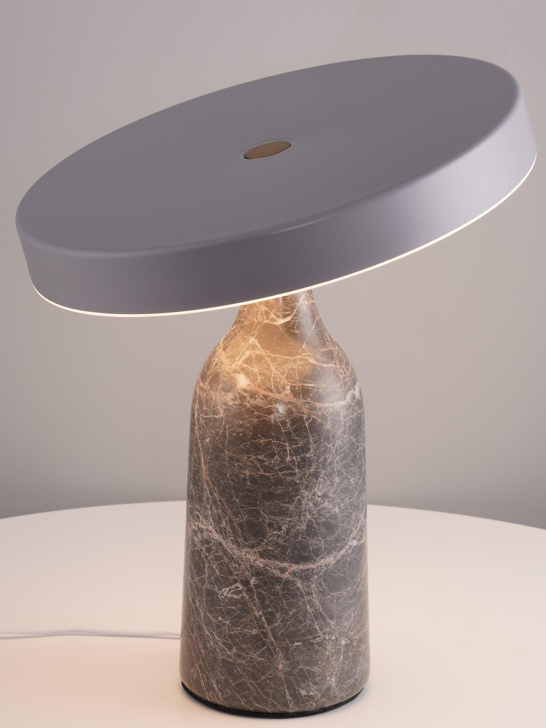 The table lamp consists of a steel screen with an integrated LED light source and a lamp base made of hand-turned to marble. Lampshade and base meet in a rotation point: a metal ball, which the shade can be tipped around to control the direction of the light. Brass dimmer on top of the lampshade. Textile-covered cord.