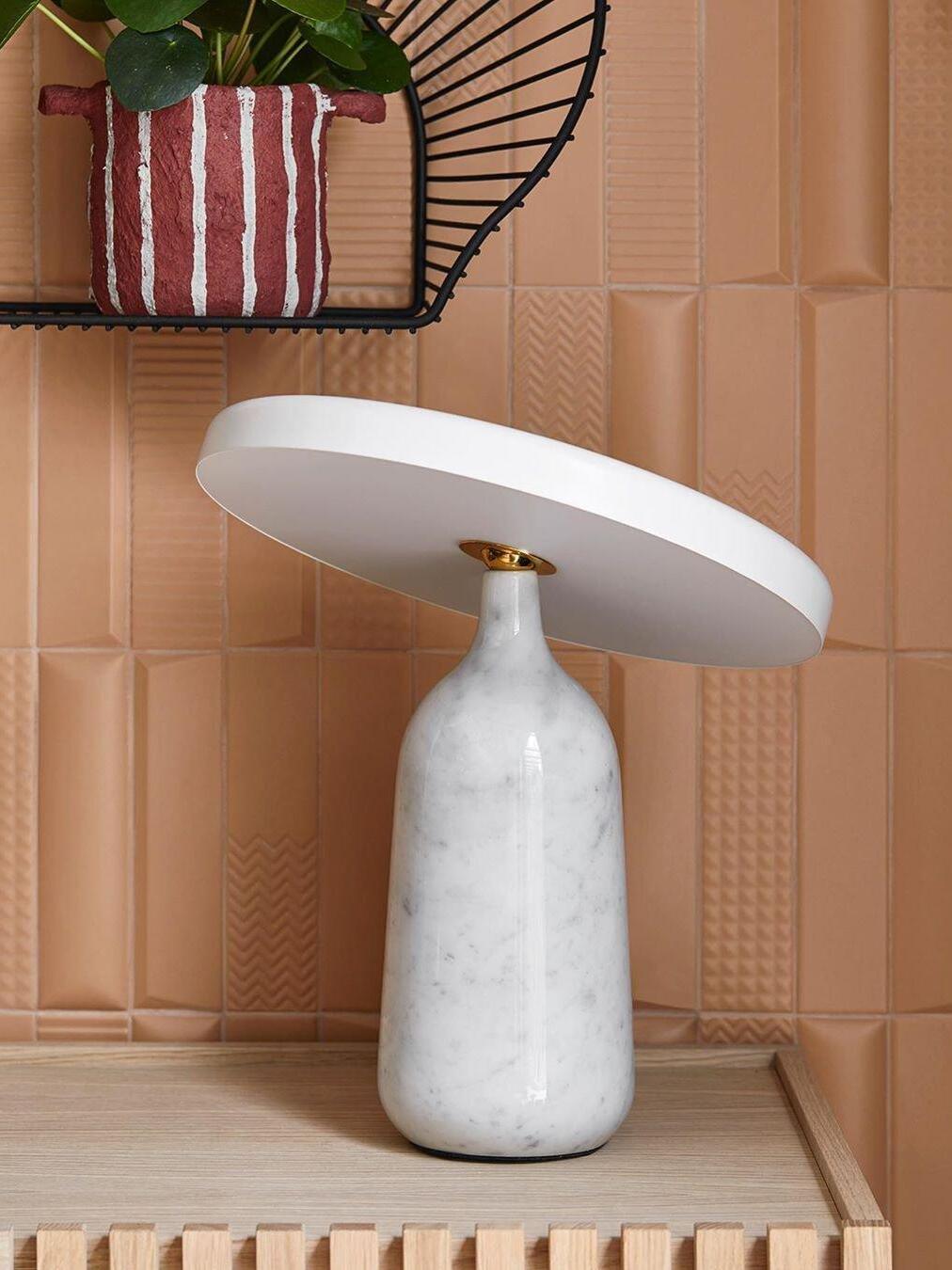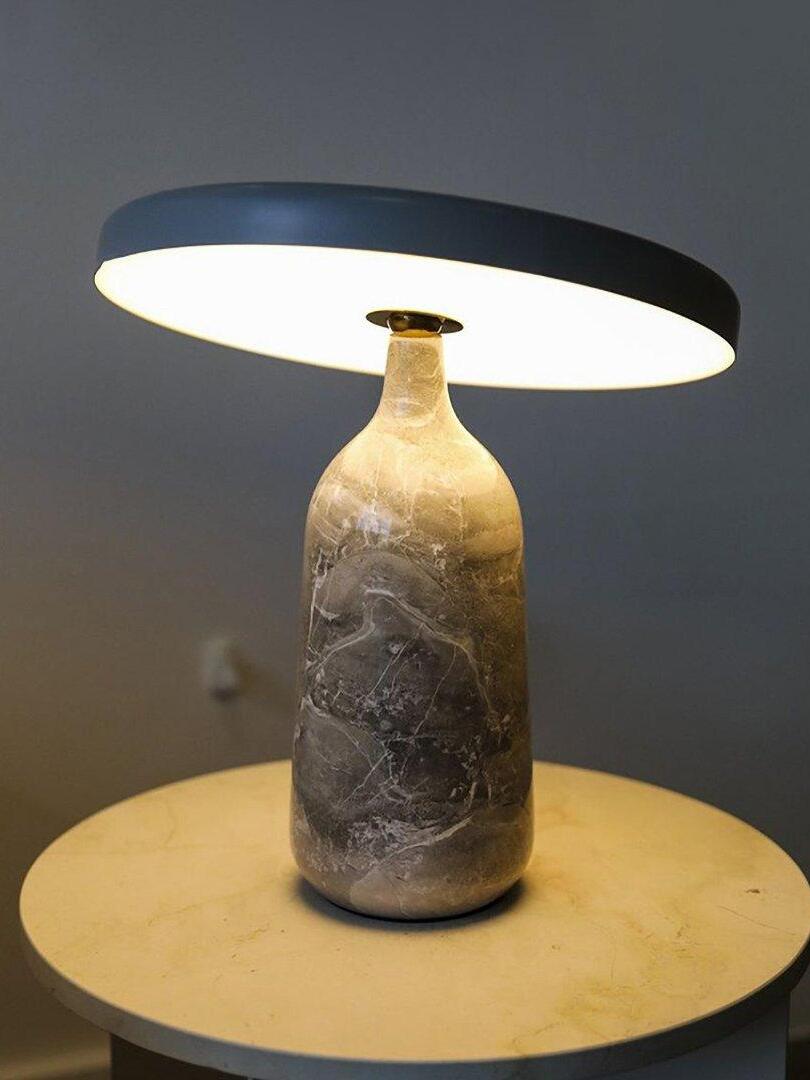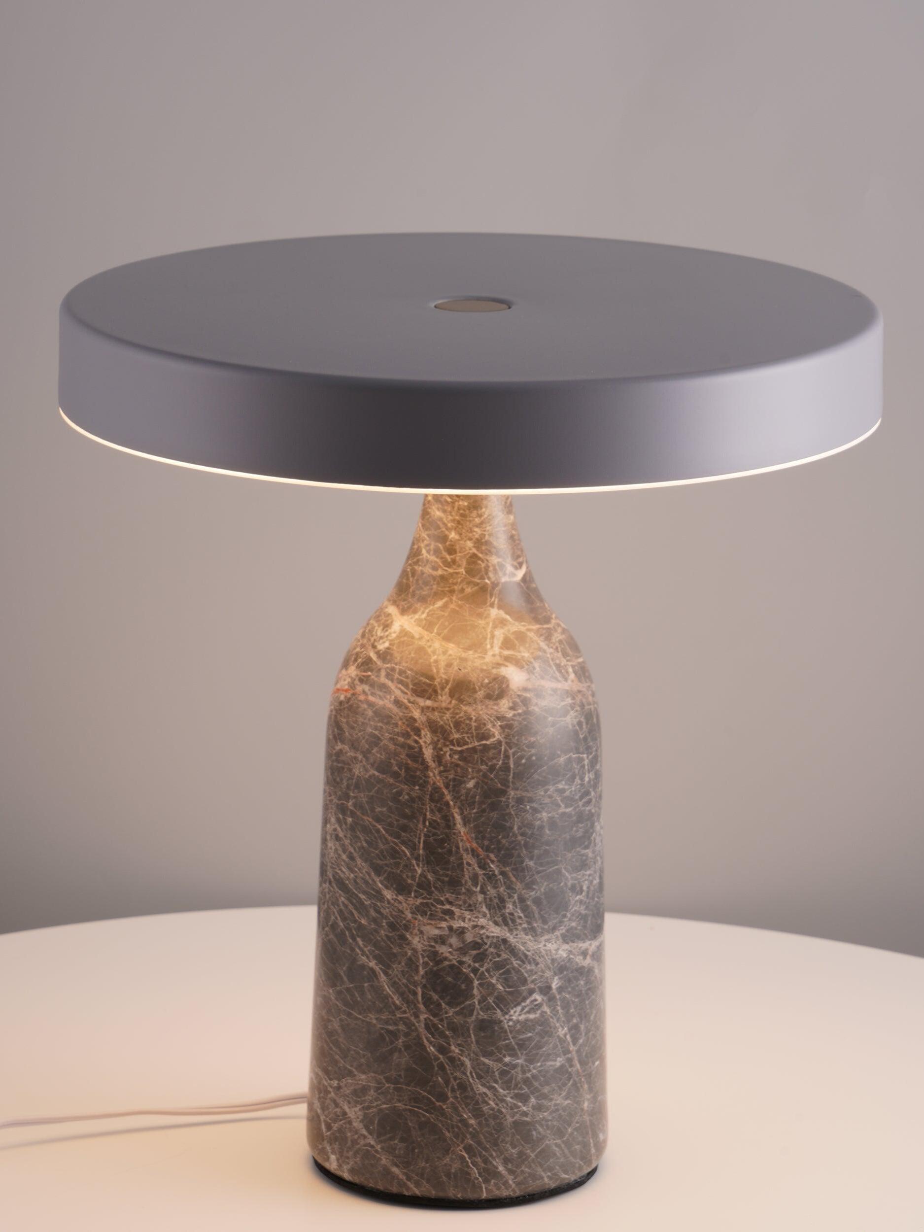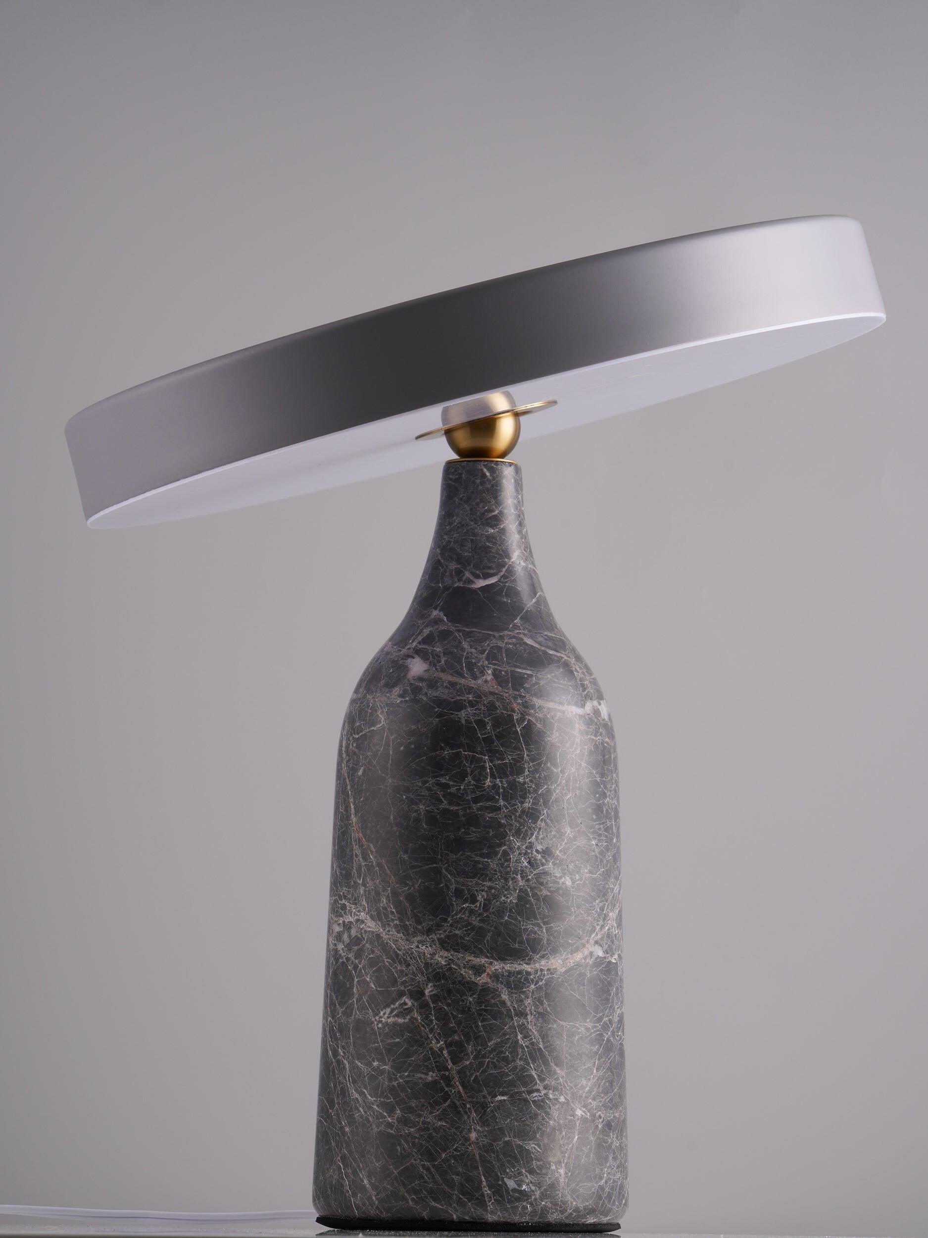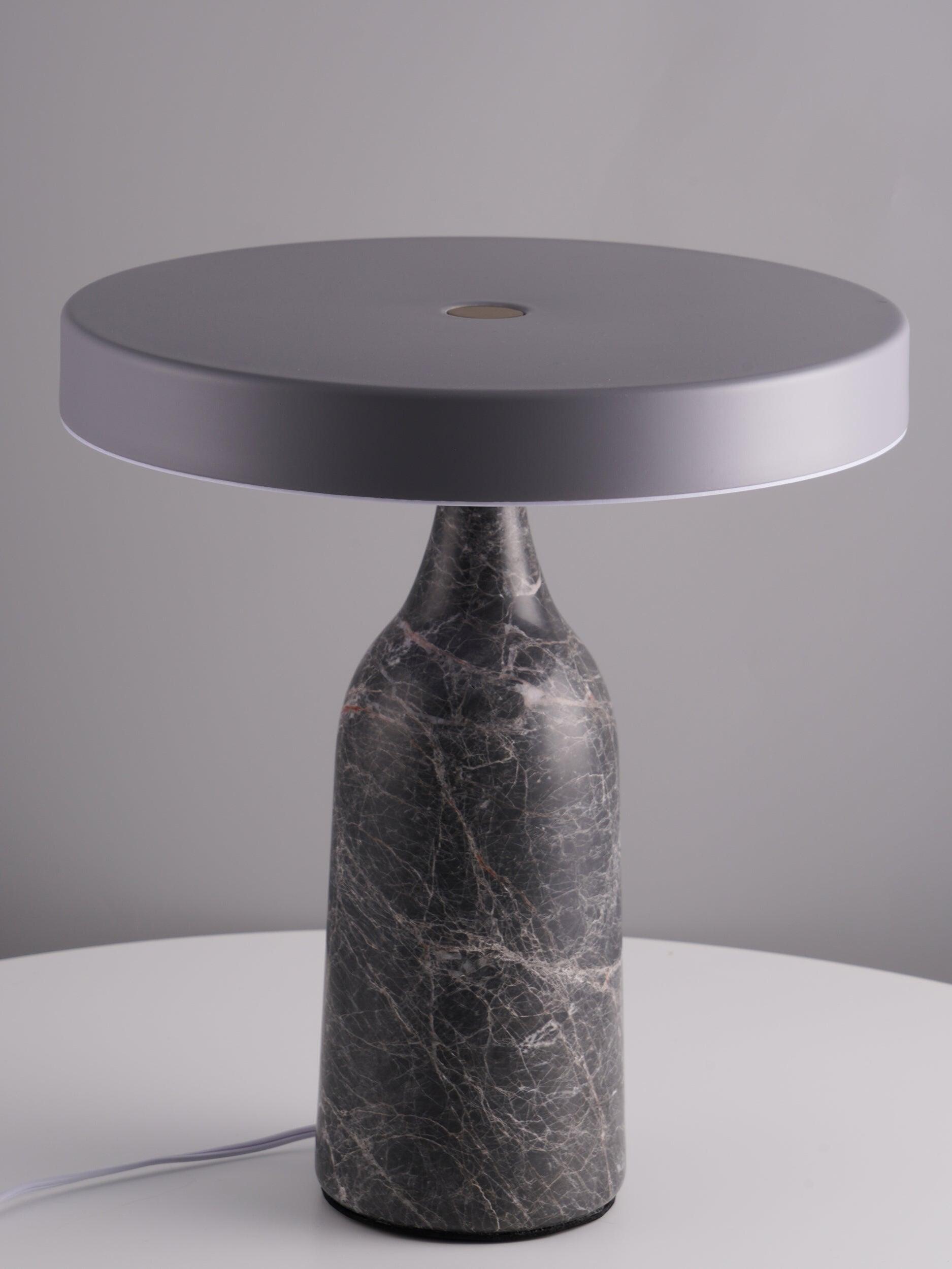 The table lamp consists of a steel screen with an integrated LED light source and a lamp base made of hand-turned to marble. Lampshade and base meet in a rotation point: a metal ball, which the shade can be tipped around to control the direction of the light. Brass dimmer on top of the lampshade. Textile-covered cord.