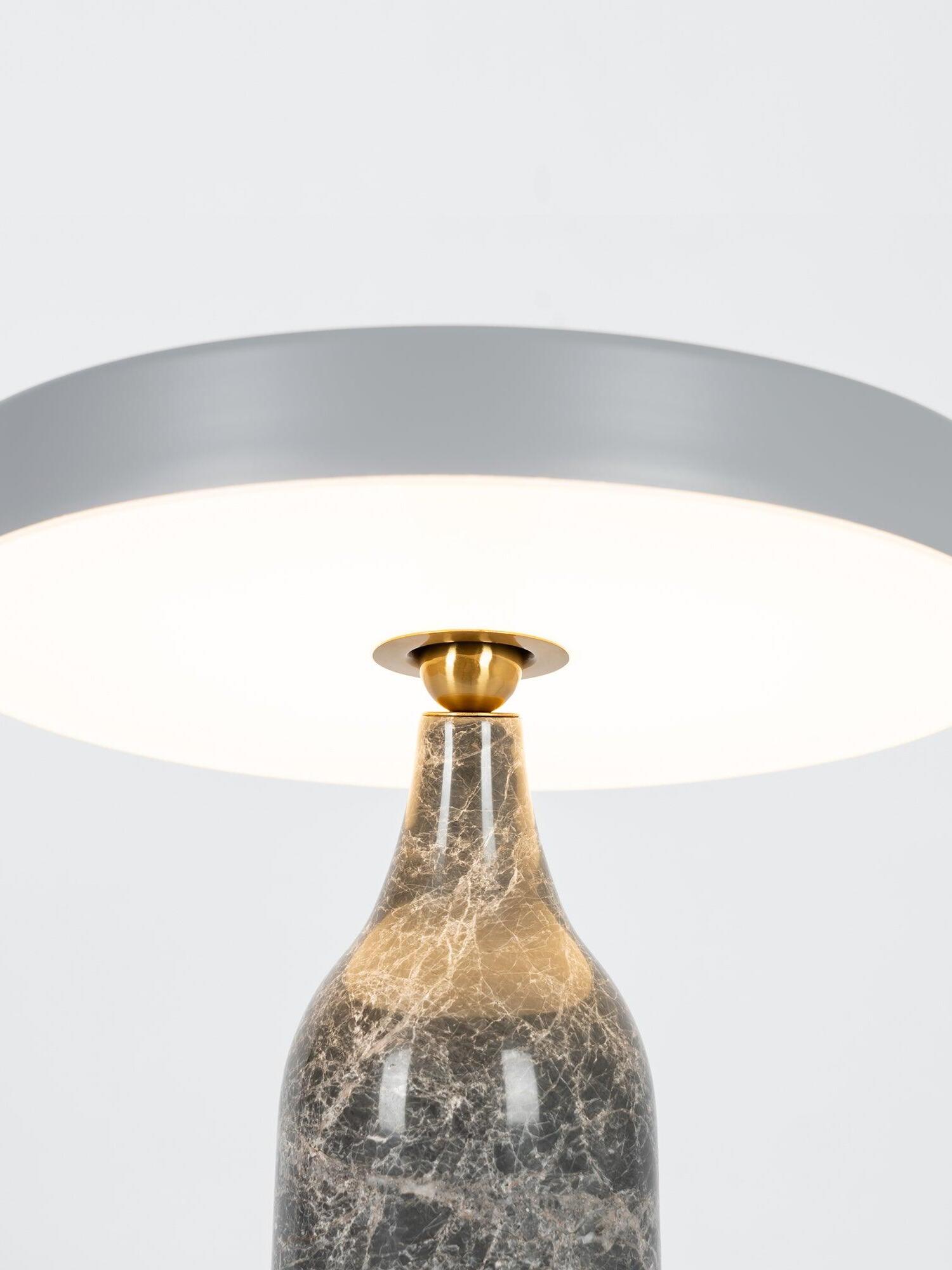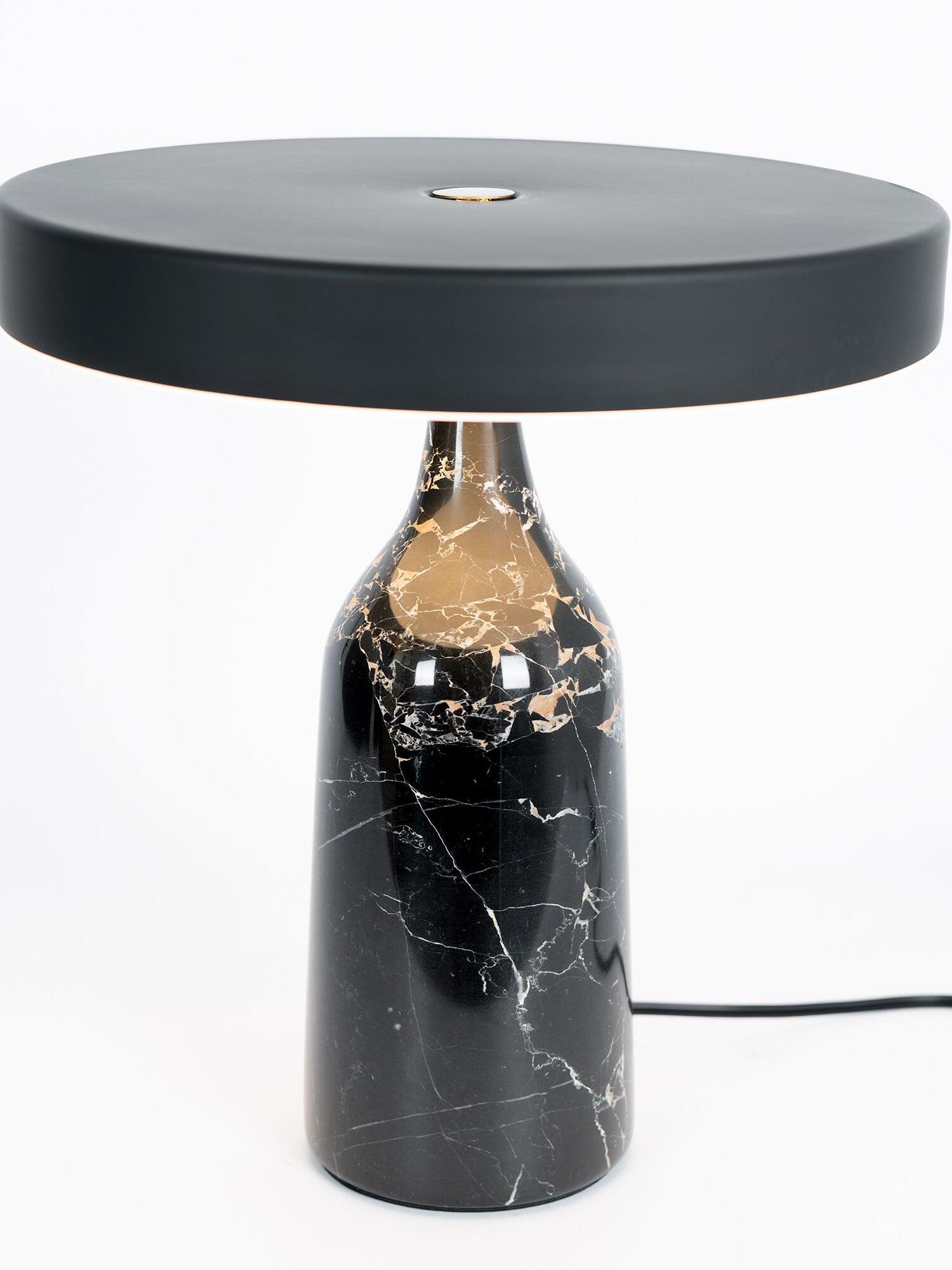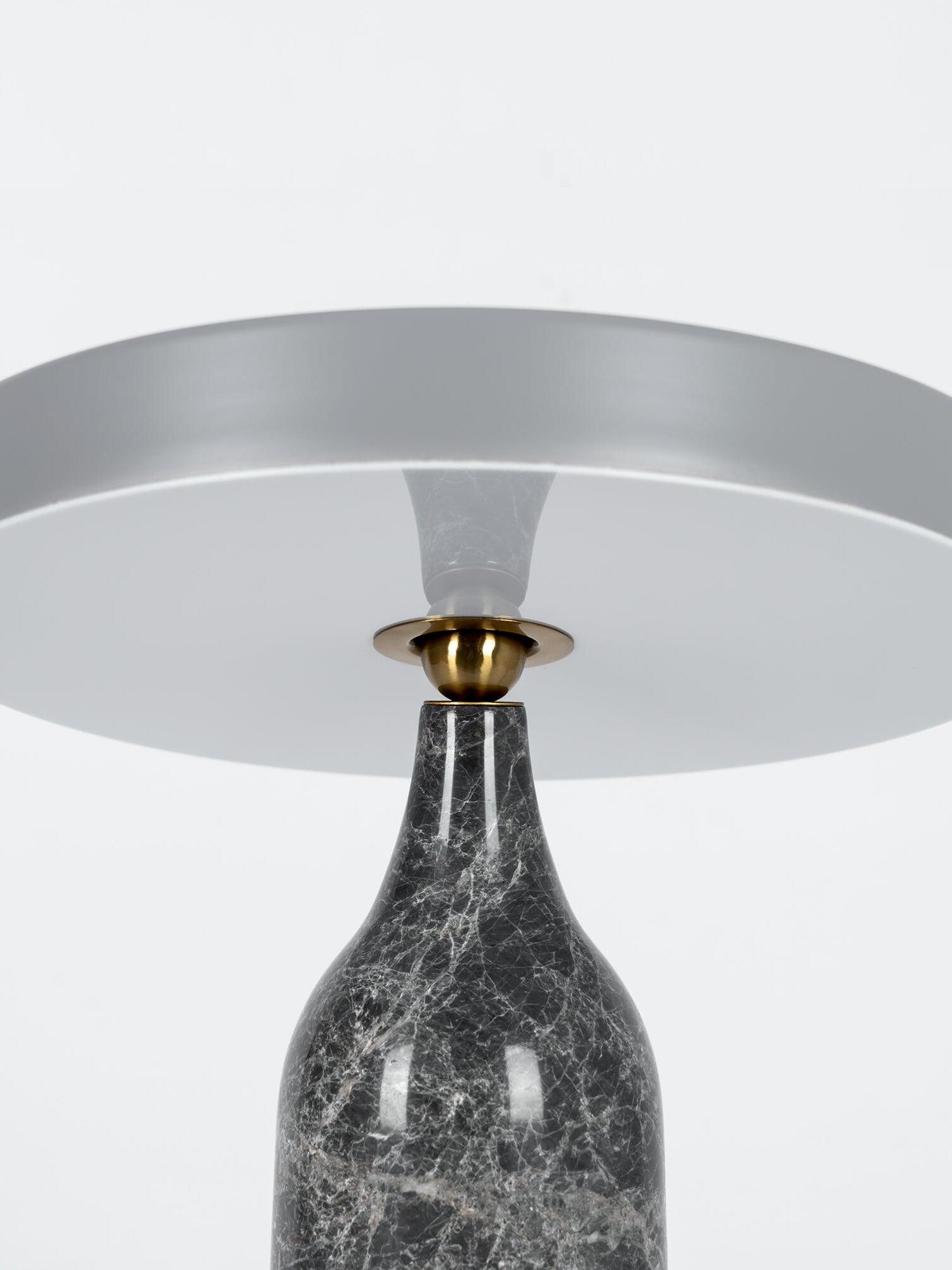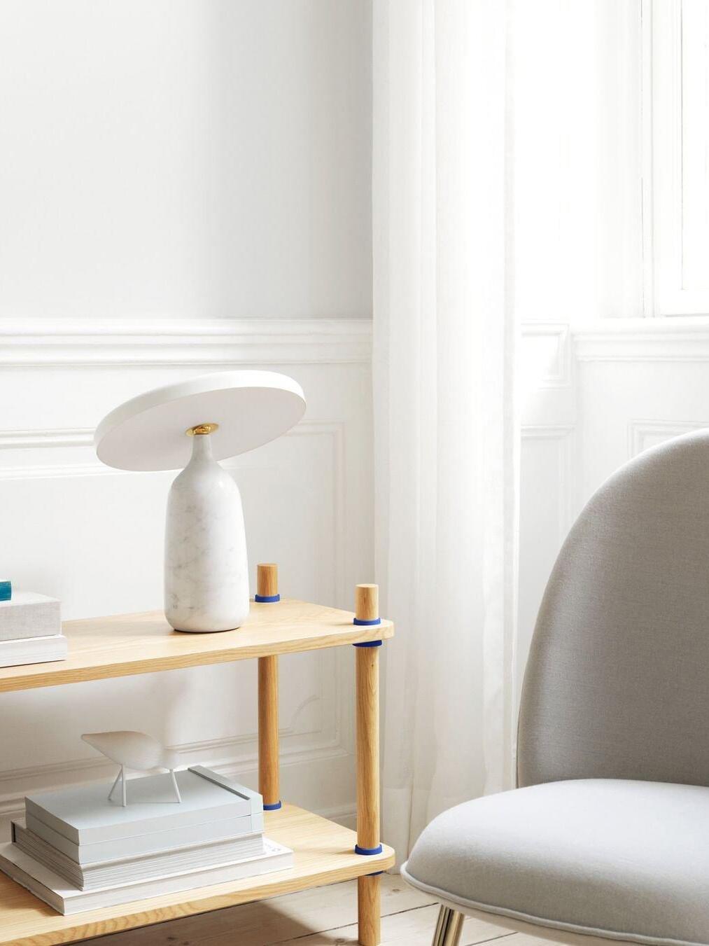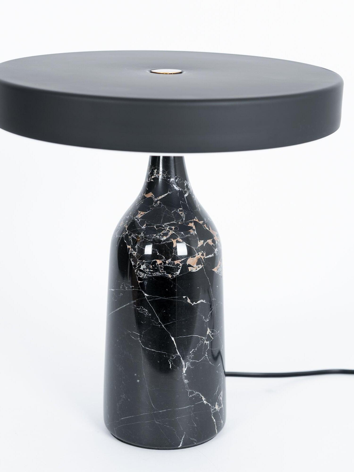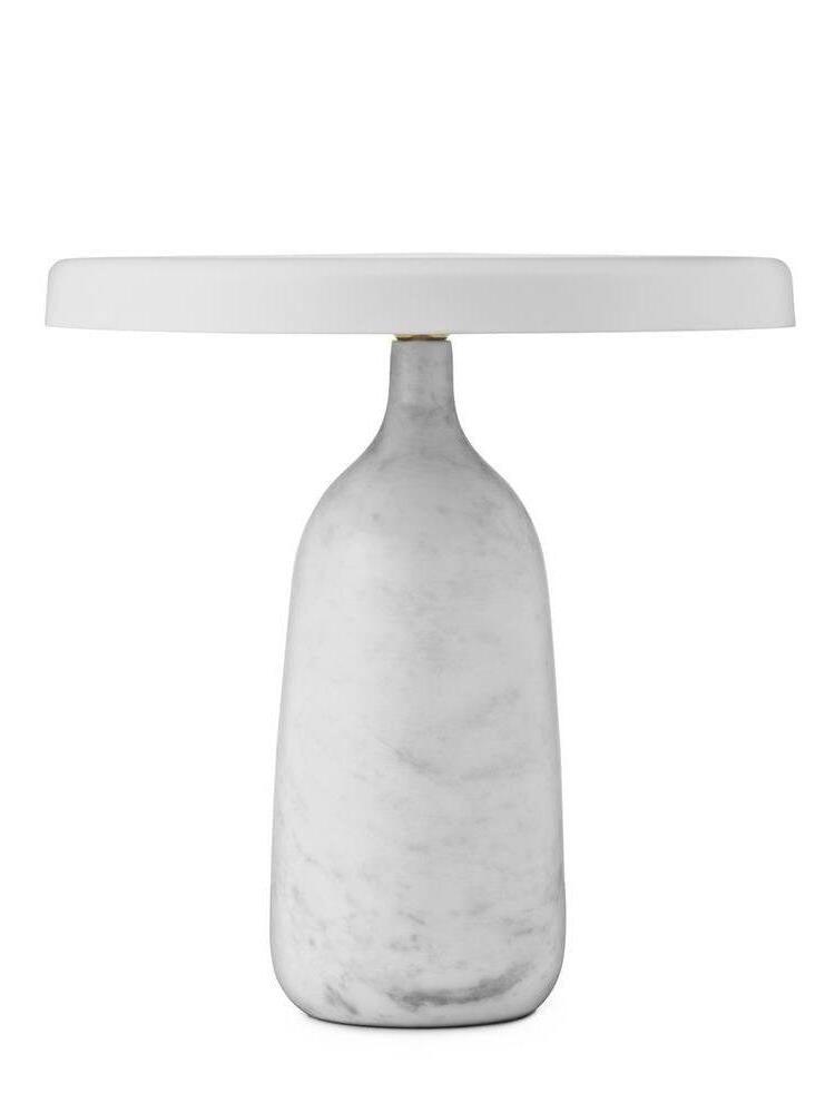 The table lamp consists of a steel screen with an integrated LED light source and a lamp base made of hand-turned to marble. Lampshade and base meet in a rotation point: a metal ball, which the shade can be tipped around to control the direction of the light. Brass dimmer on top of the lampshade. Textile-covered cord.