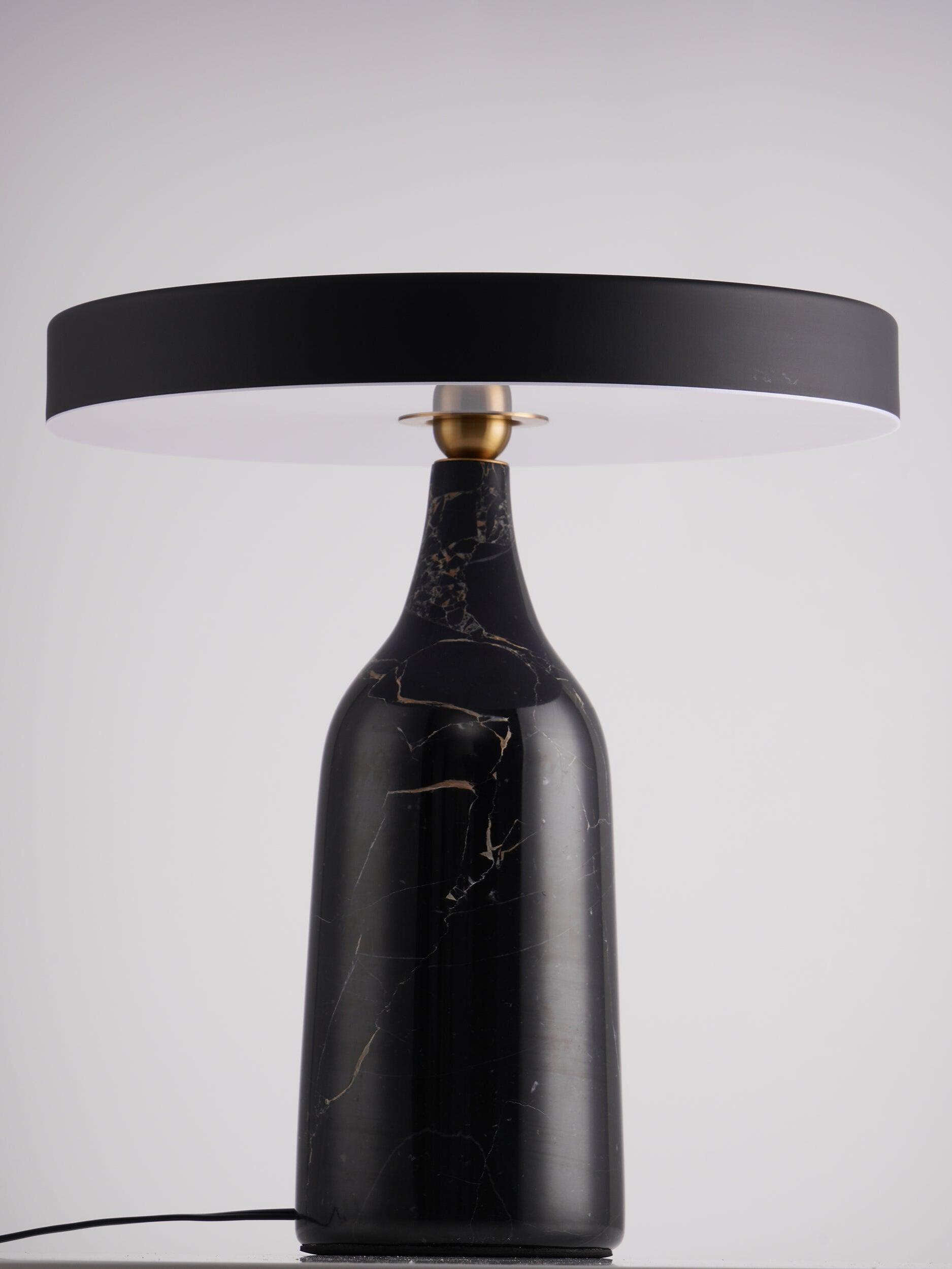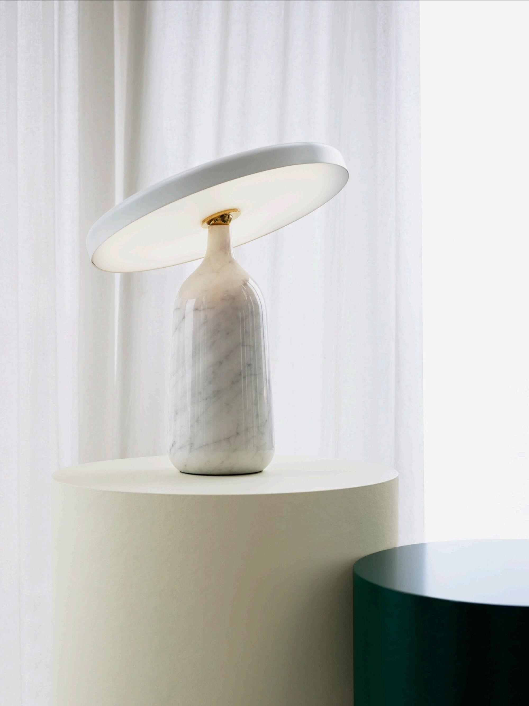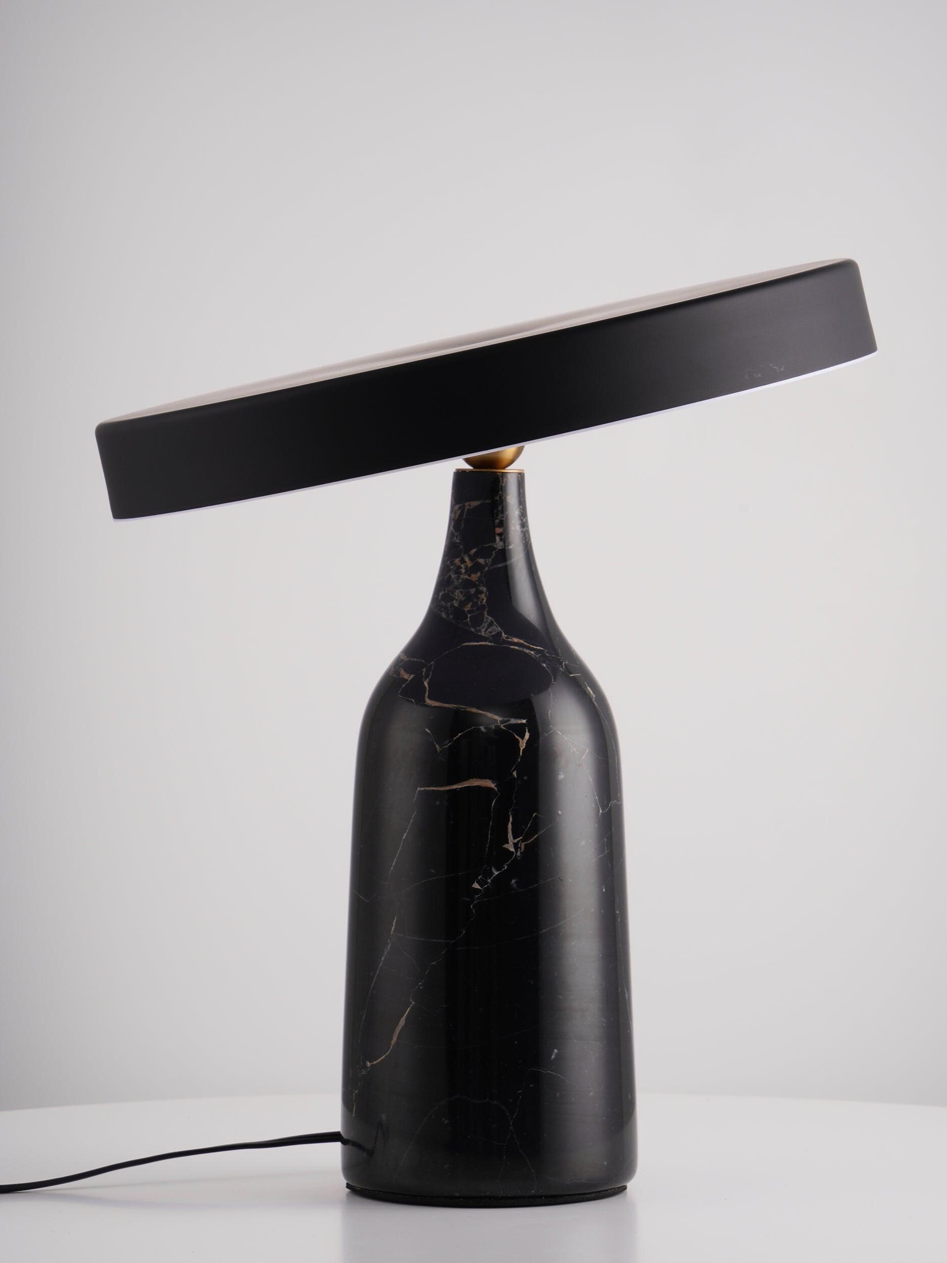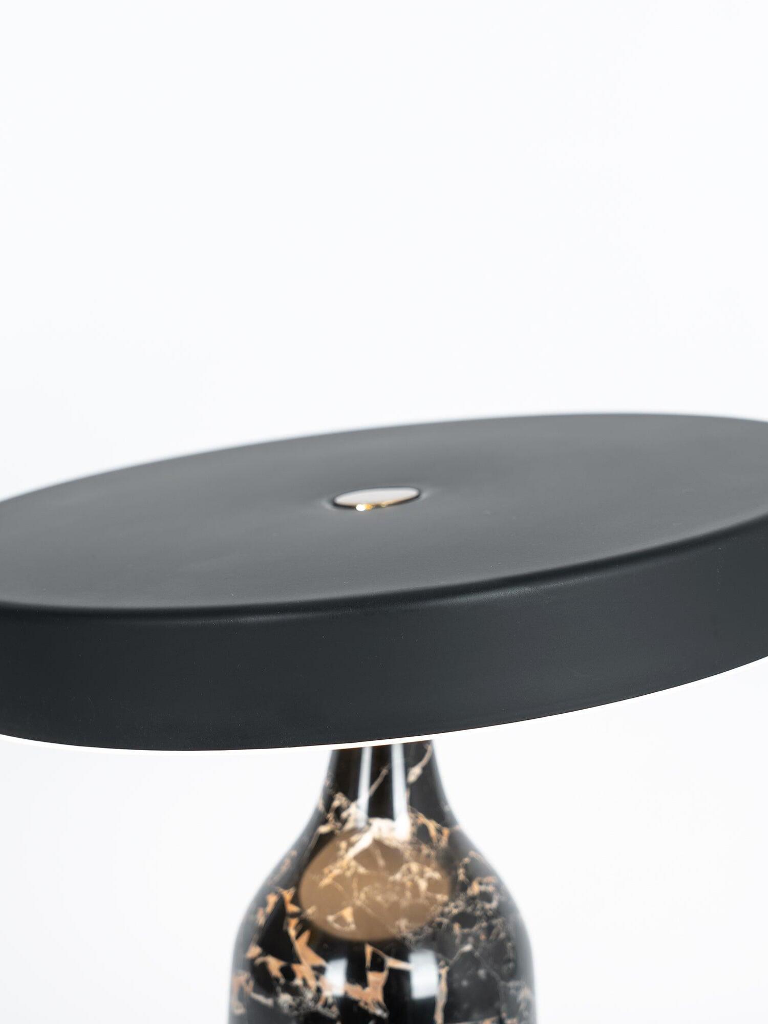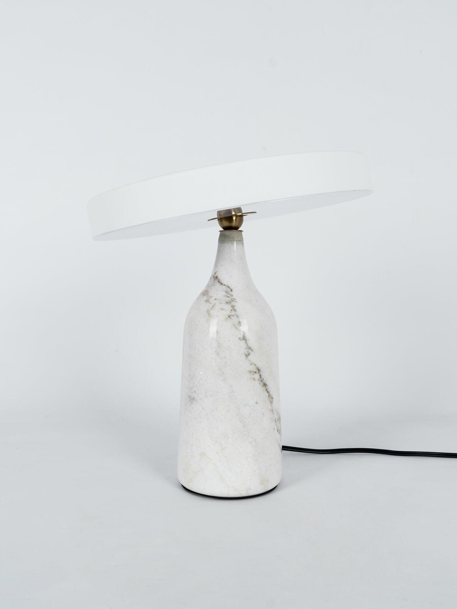 The table lamp consists of a steel screen with an integrated LED light source and a lamp base made of hand-turned to marble. Lampshade and base meet in a rotation point: a metal ball, which the shade can be tipped around to control the direction of the light. Brass dimmer on top of the lampshade. Textile-covered cord.