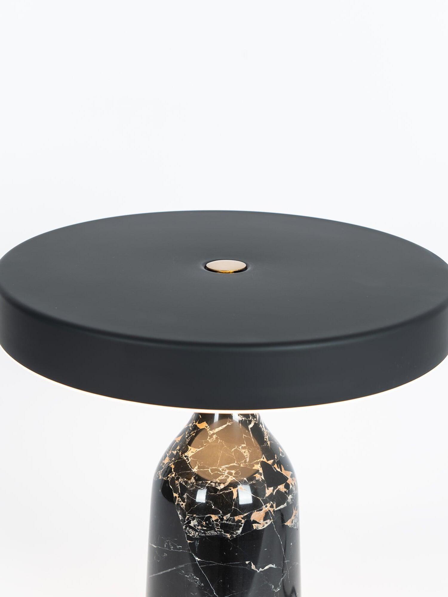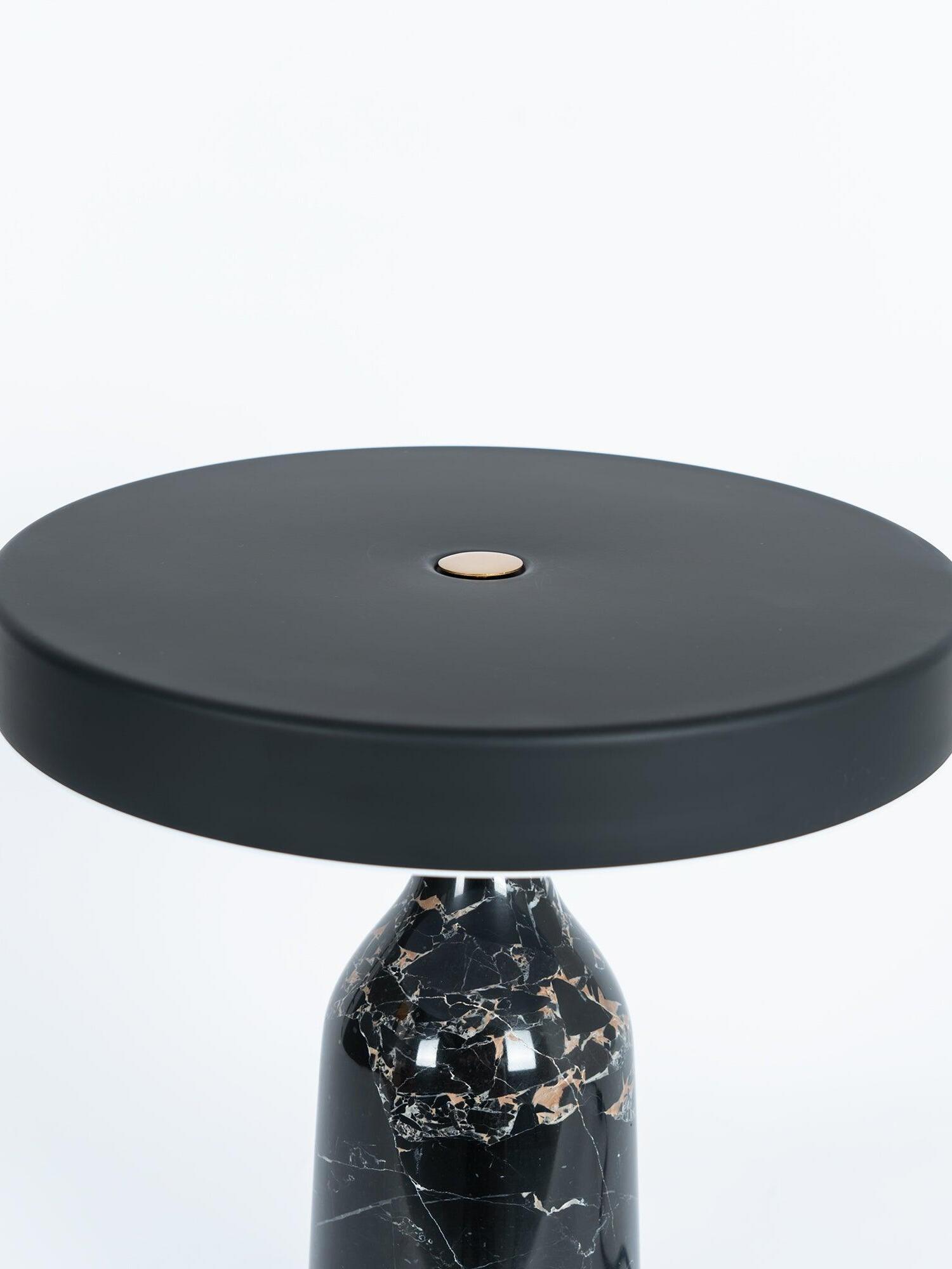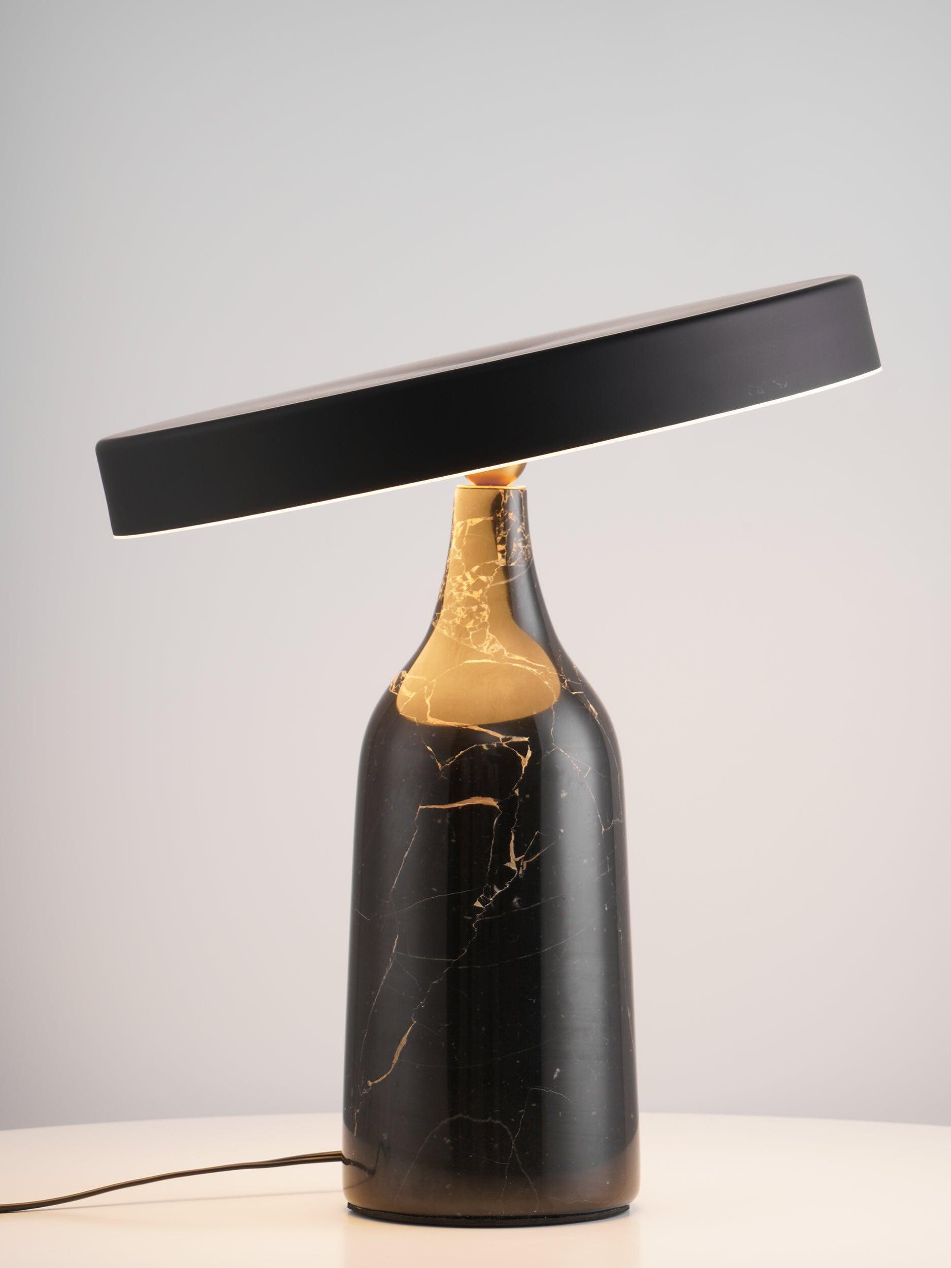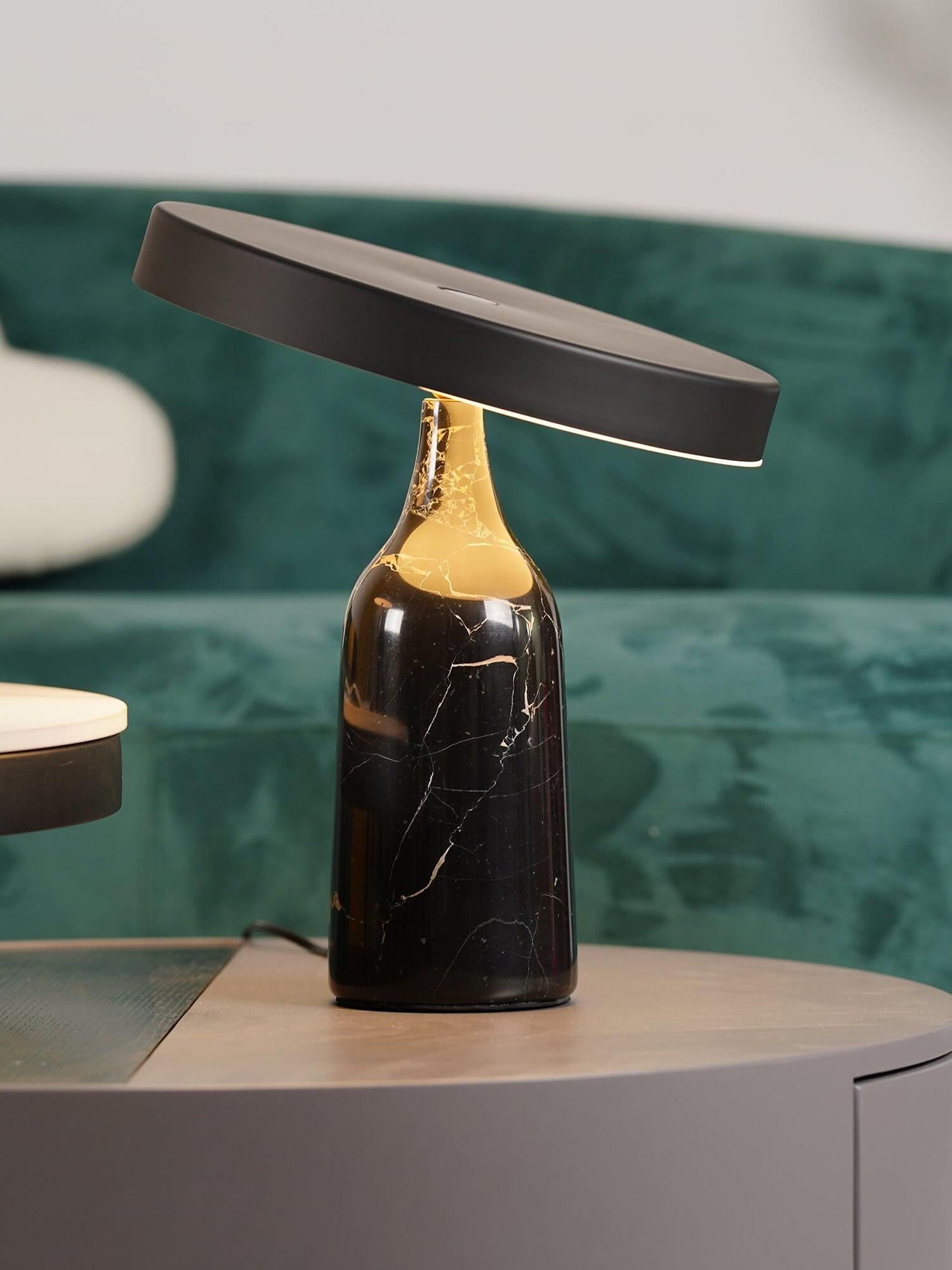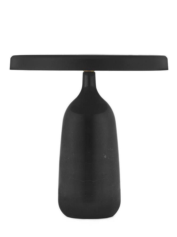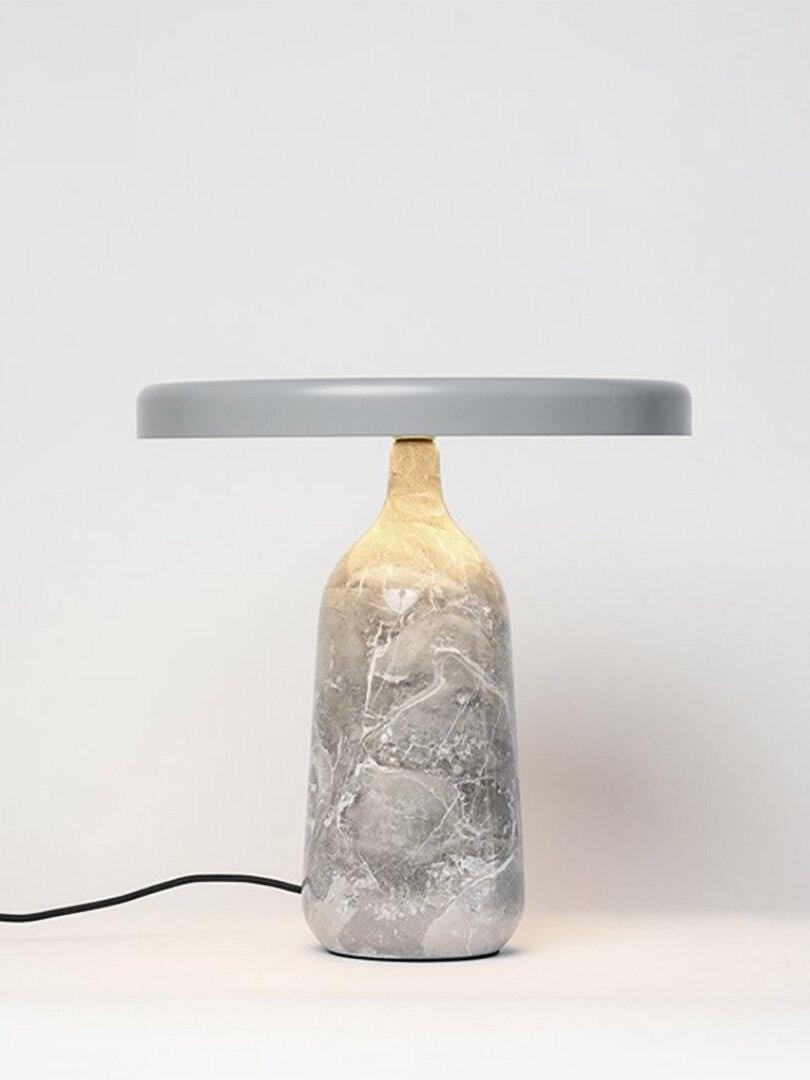 The table lamp consists of a steel screen with an integrated LED light source and a lamp base made of hand-turned to marble. Lampshade and base meet in a rotation point: a metal ball, which the shade can be tipped around to control the direction of the light. Brass dimmer on top of the lampshade. Textile-covered cord.
