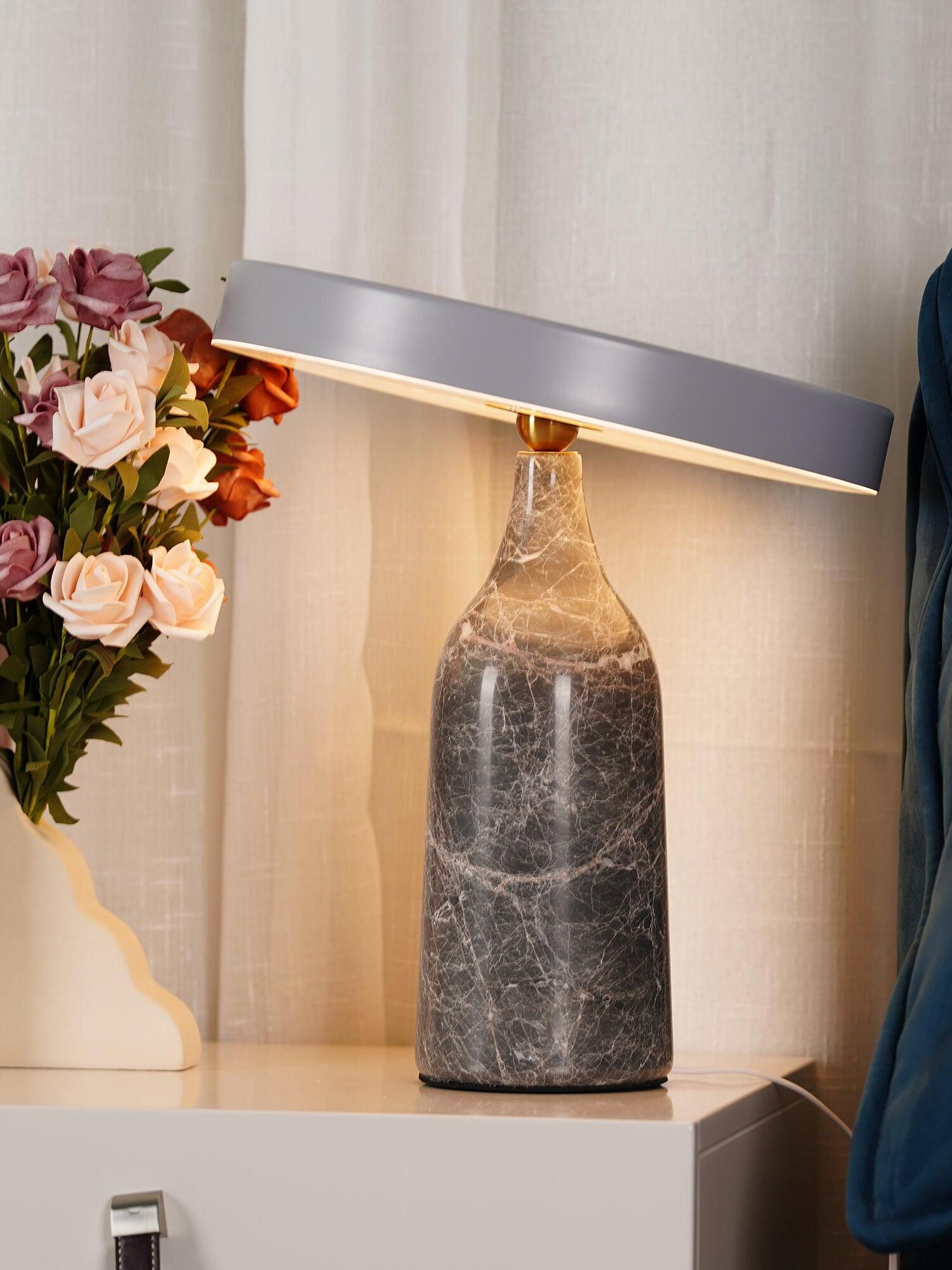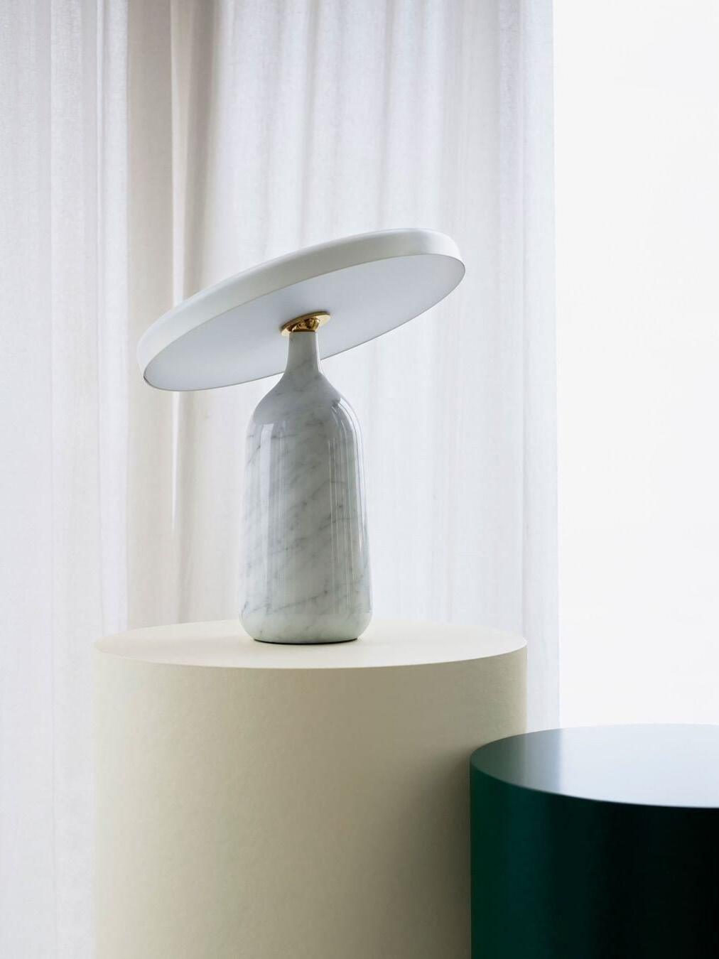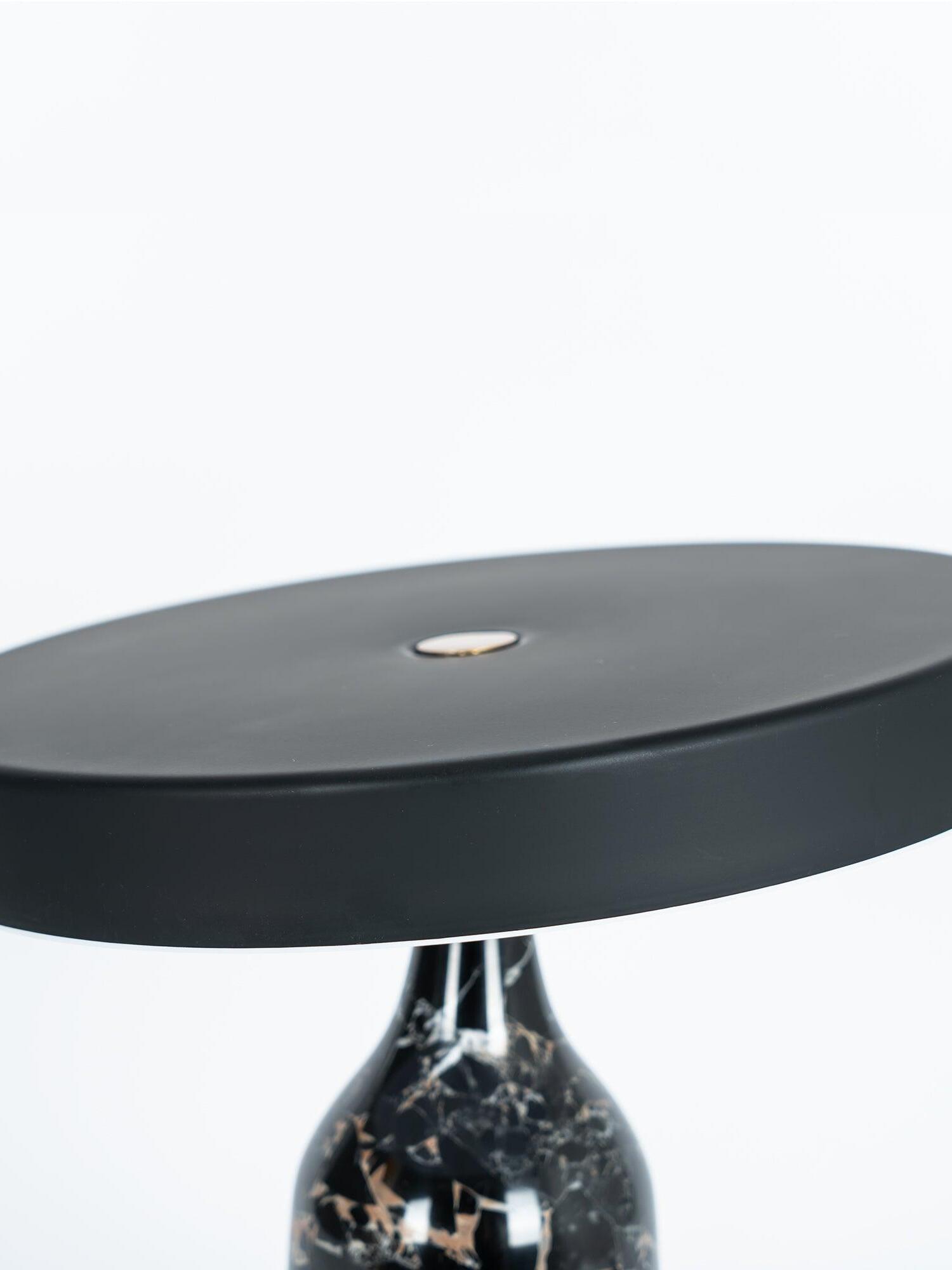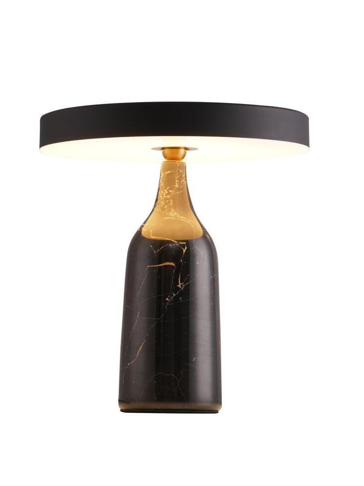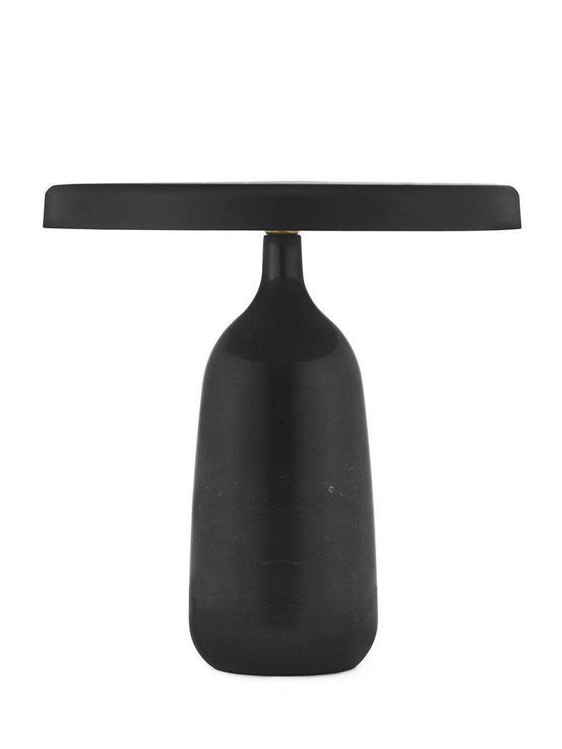 The table lamp consists of a steel screen with an integrated LED light source and a lamp base made of hand-turned to marble. Lampshade and base meet in a rotation point: a metal ball, which the shade can be tipped around to control the direction of the light. Brass dimmer on top of the lampshade. Textile-covered cord.