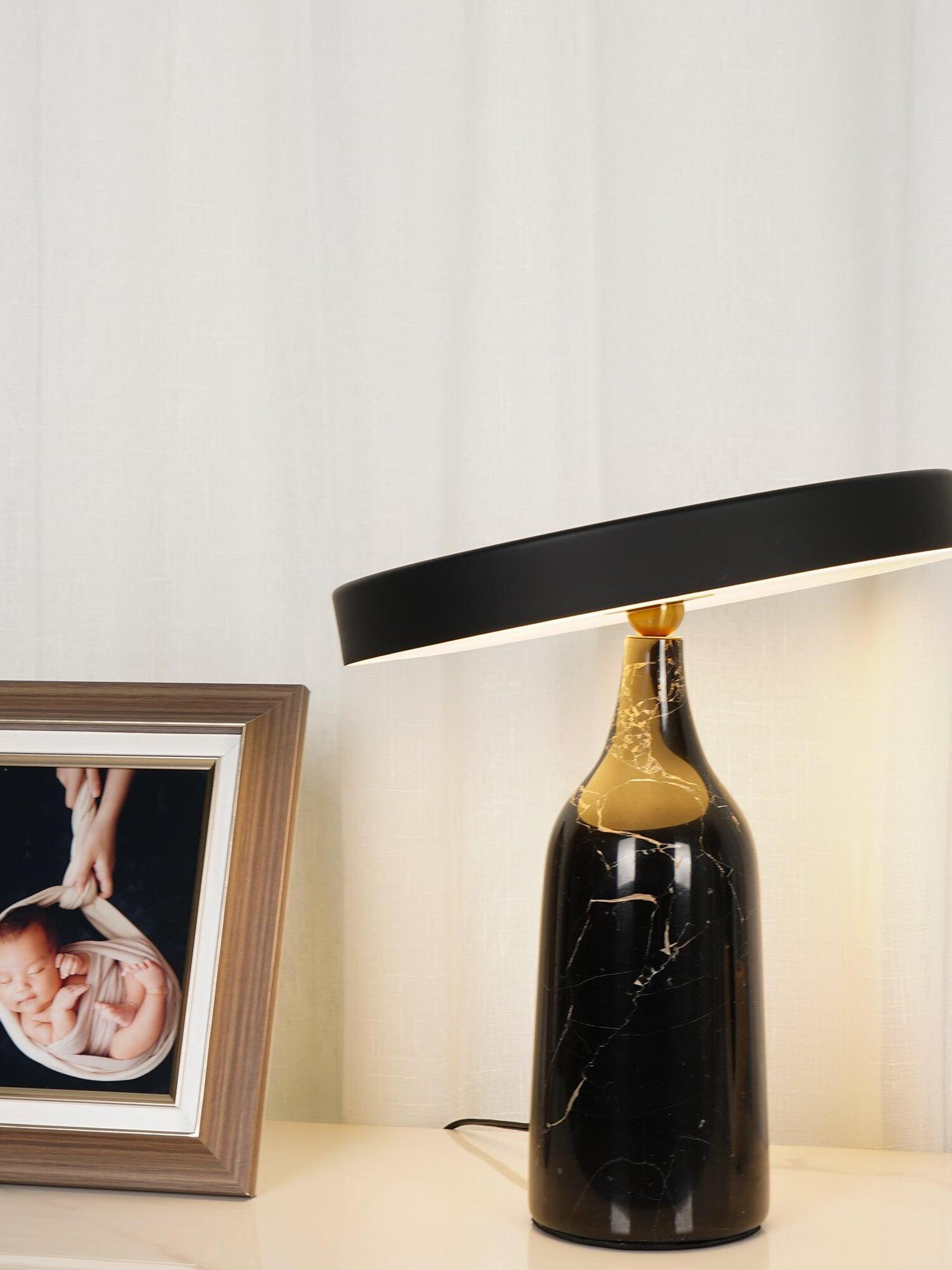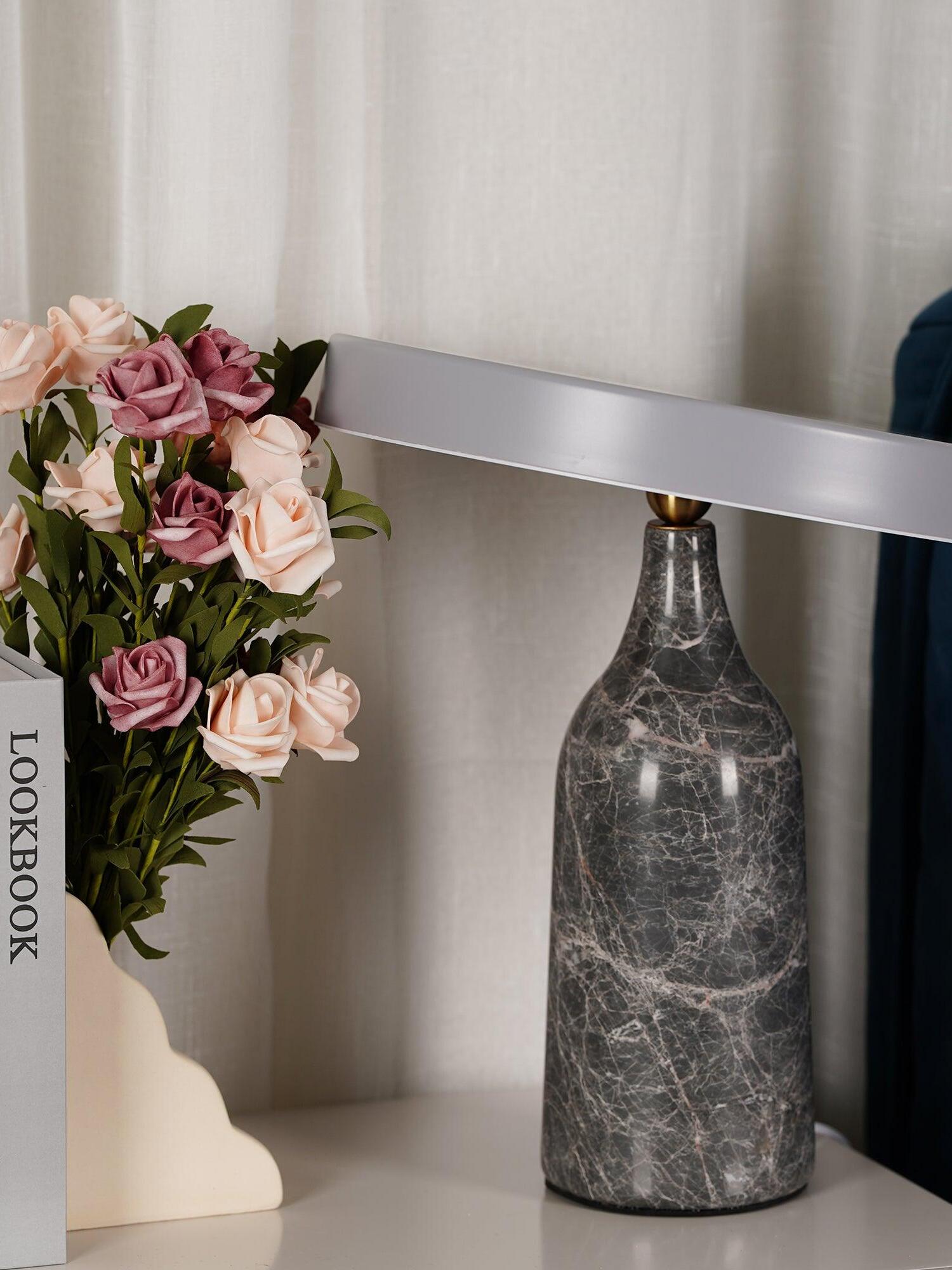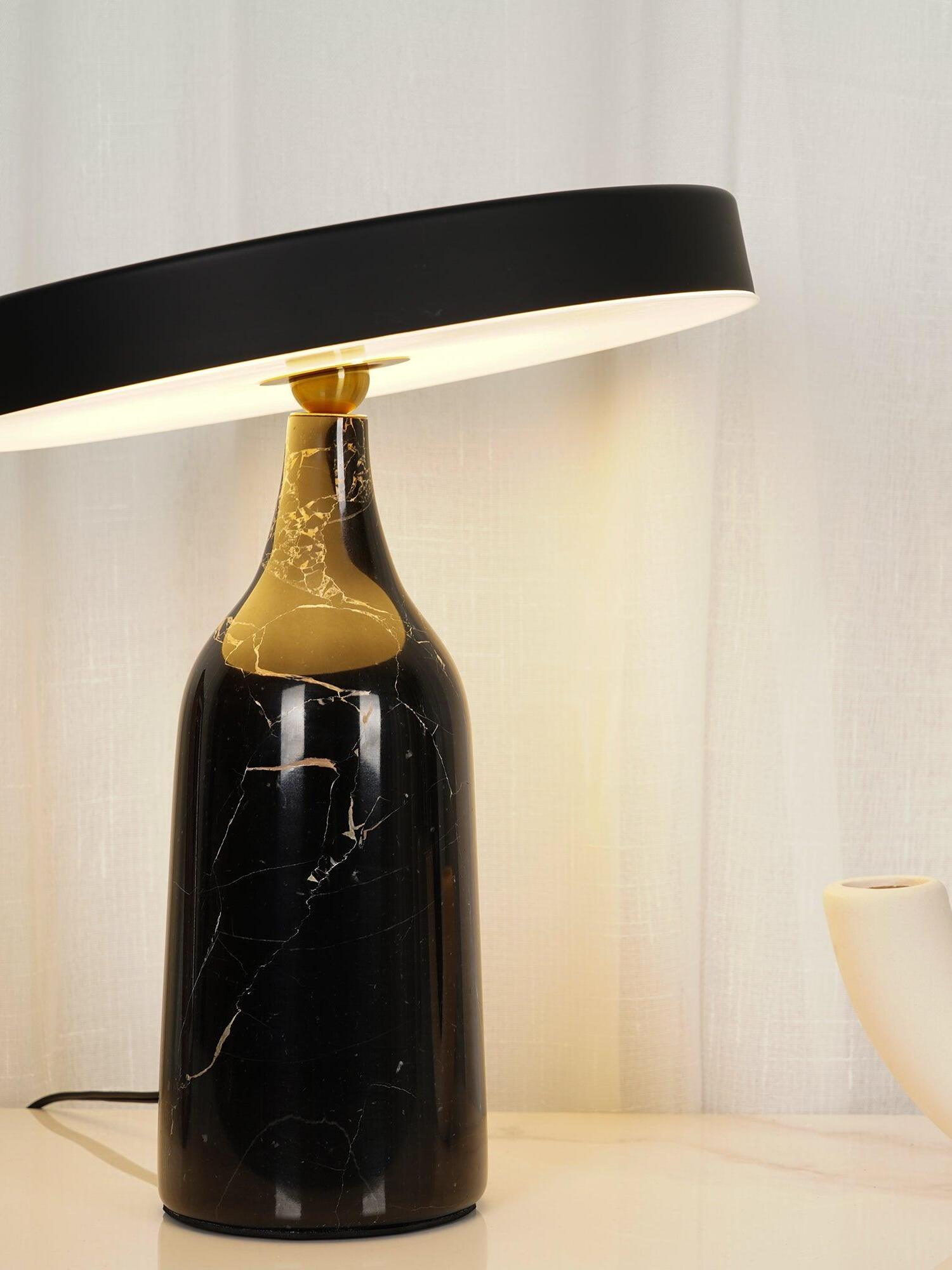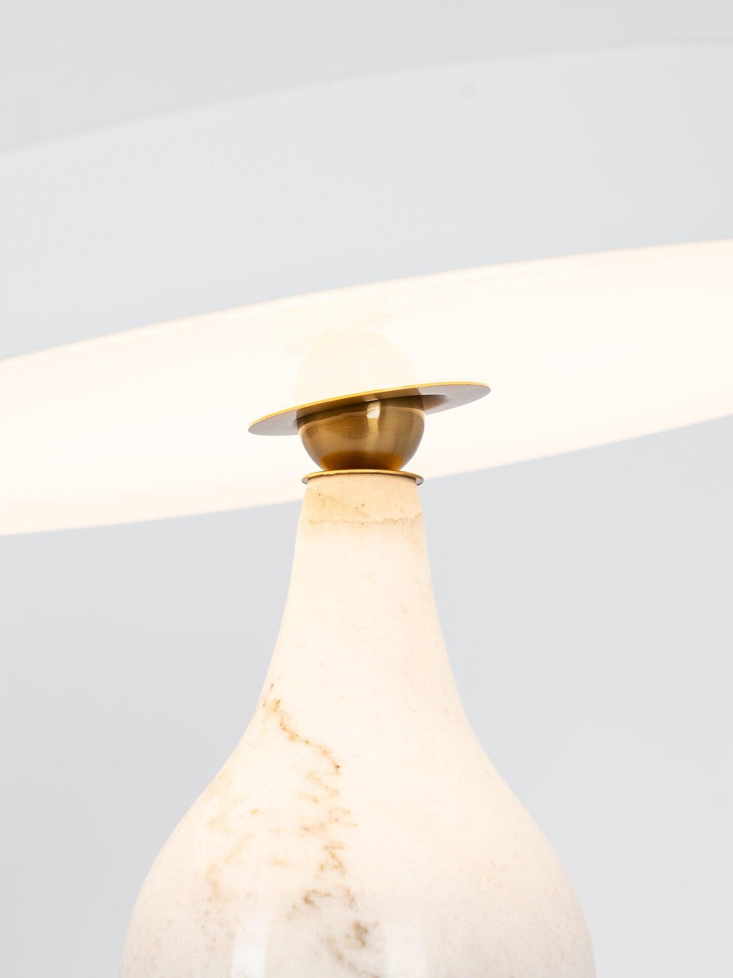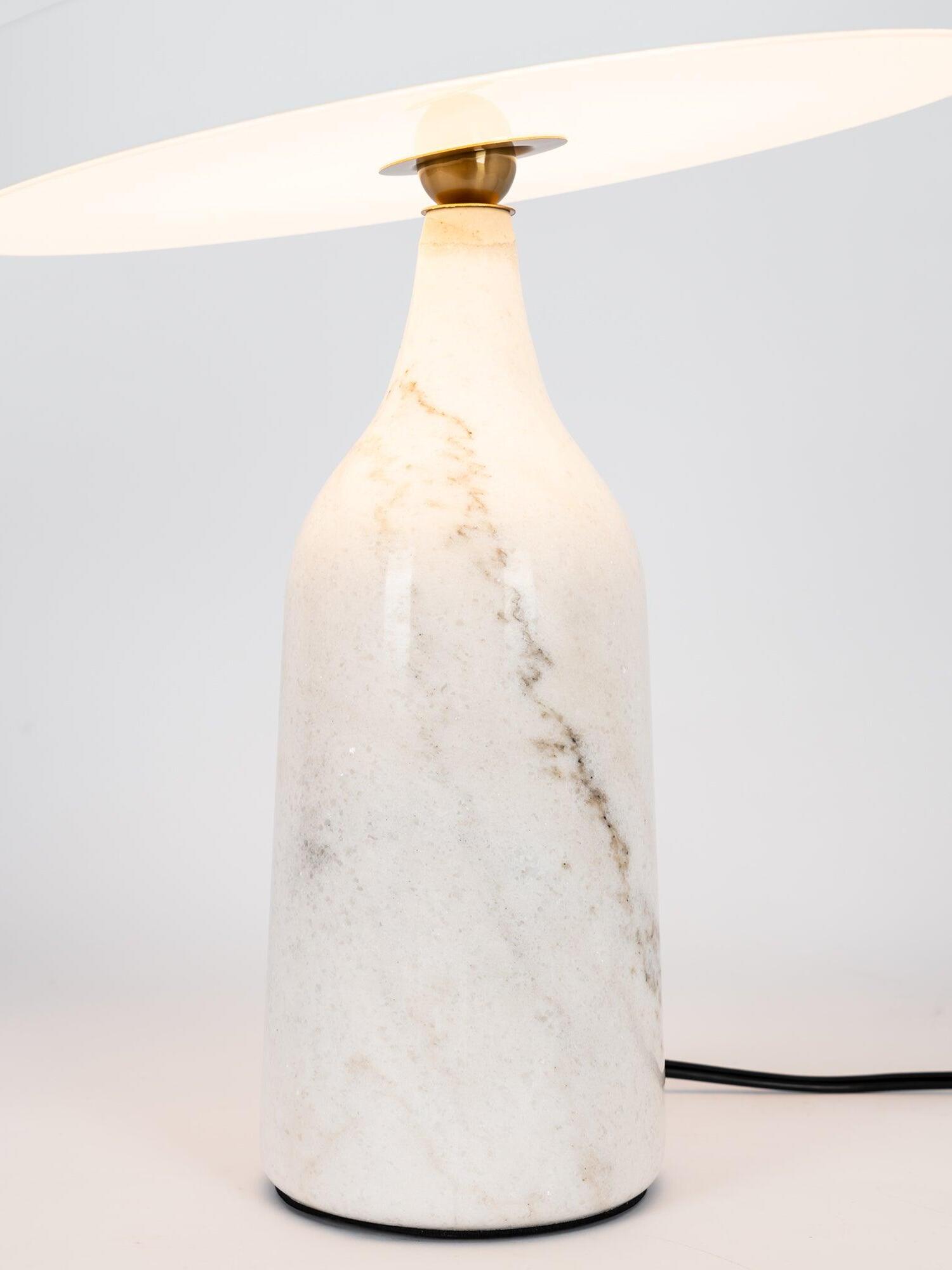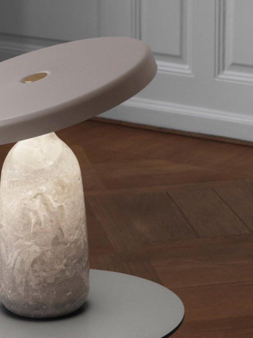 The table lamp consists of a steel screen with an integrated LED light source and a lamp base made of hand-turned to marble. Lampshade and base meet in a rotation point: a metal ball, which the shade can be tipped around to control the direction of the light. Brass dimmer on top of the lampshade. Textile-covered cord.