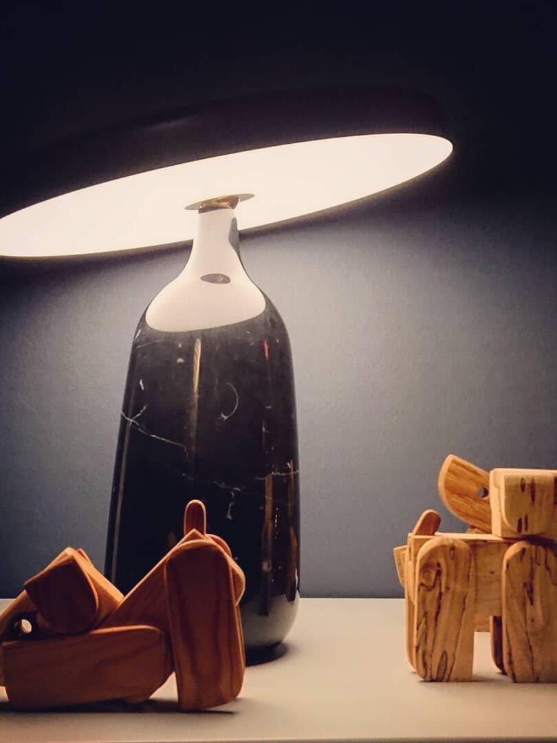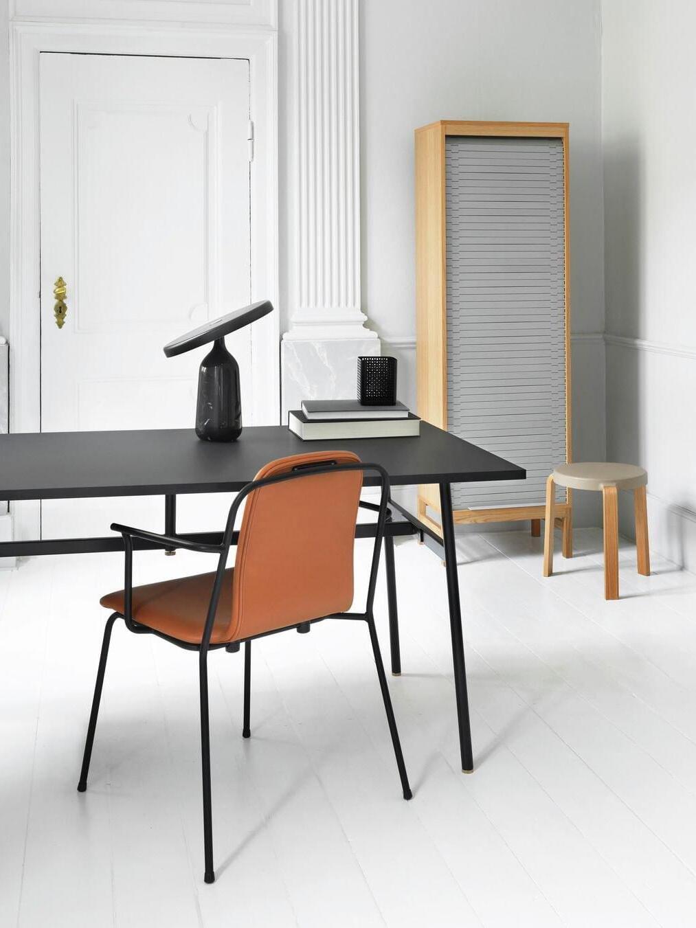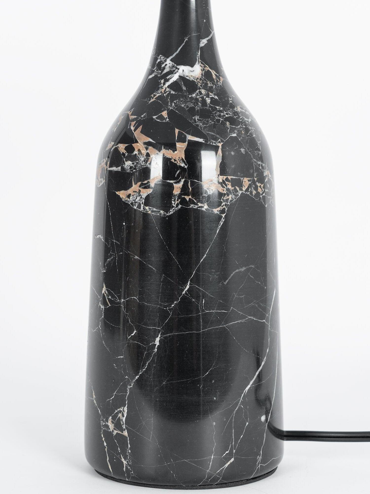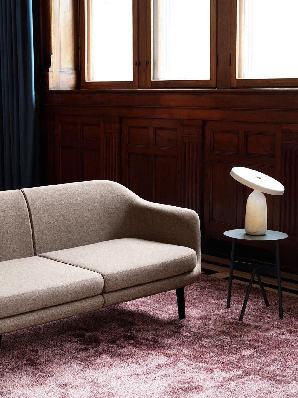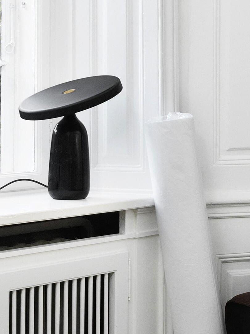 The table lamp consists of a steel screen with an integrated LED light source and a lamp base made of hand-turned to marble. Lampshade and base meet in a rotation point: a metal ball, which the shade can be tipped around to control the direction of the light. Brass dimmer on top of the lampshade. Textile-covered cord.