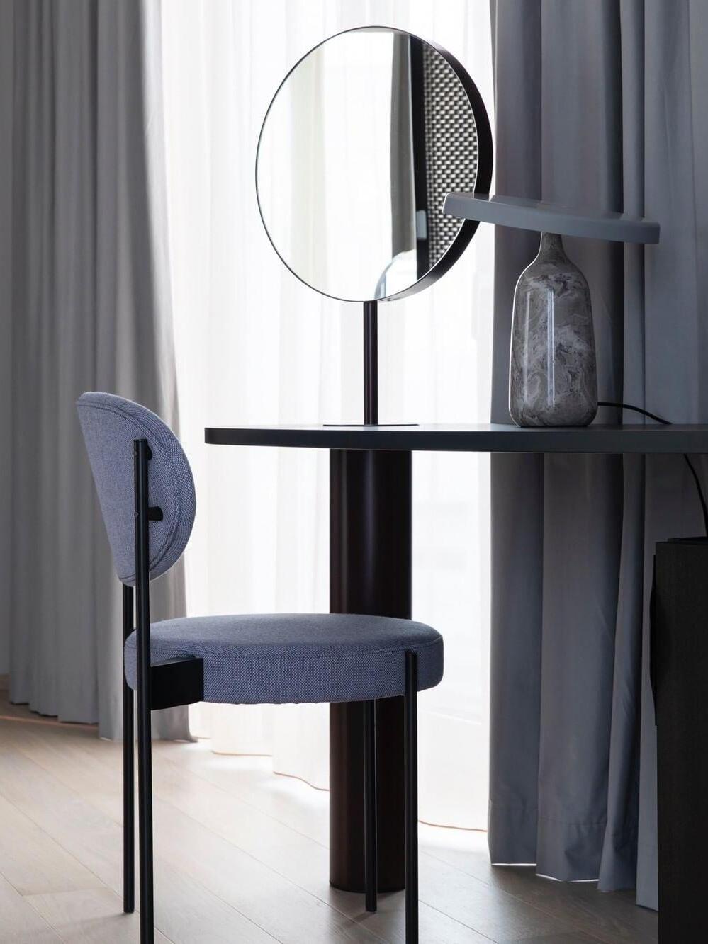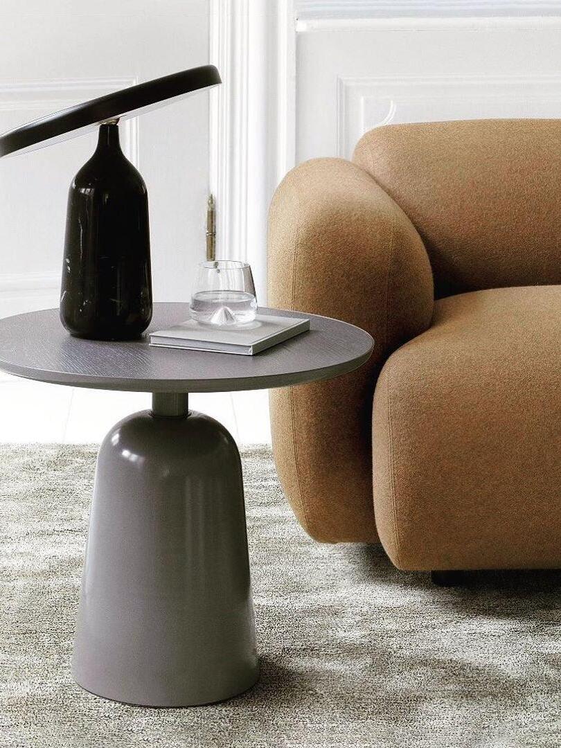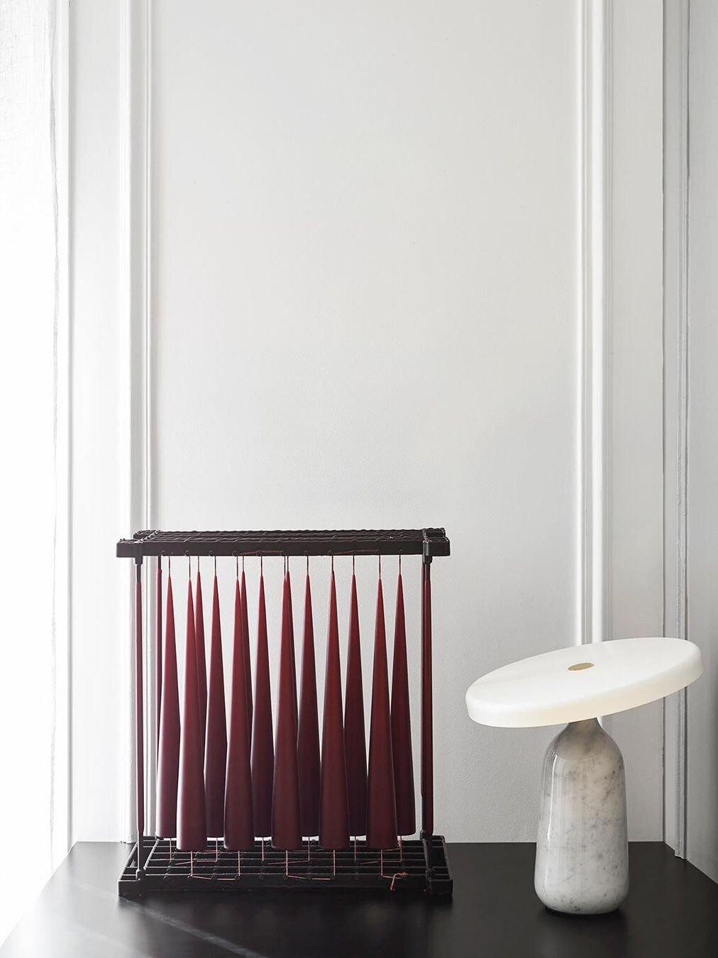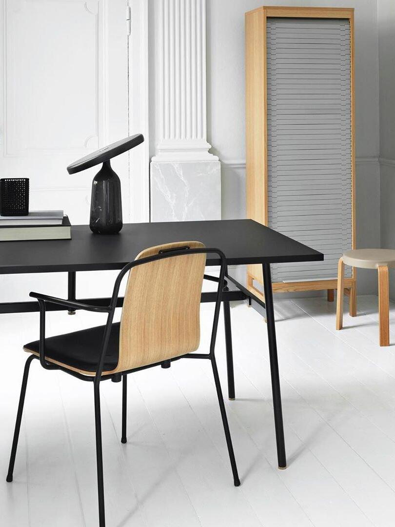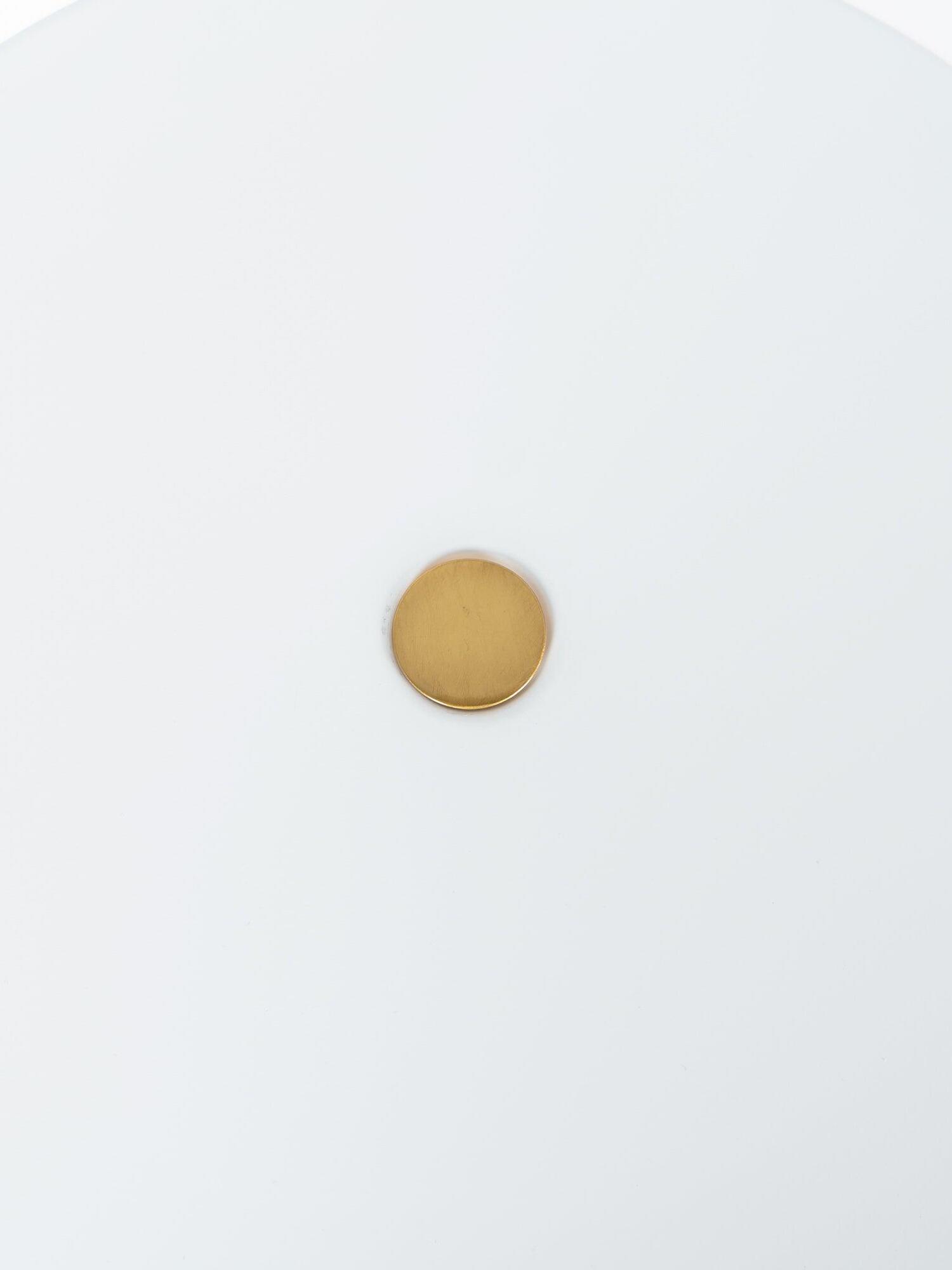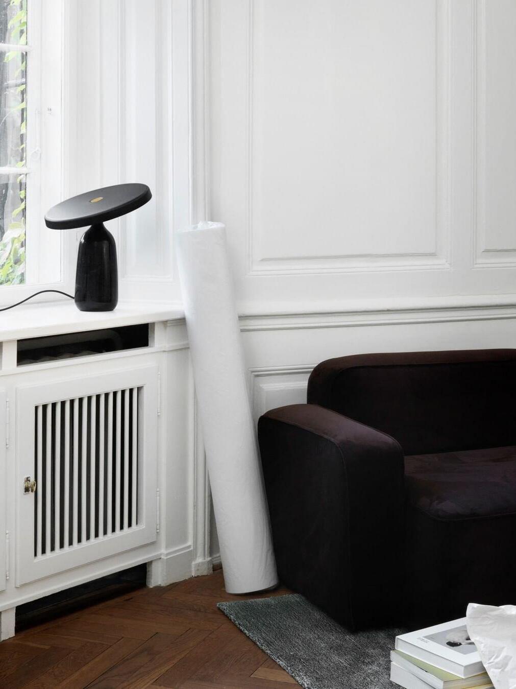 The table lamp consists of a steel screen with an integrated LED light source and a lamp base made of hand-turned to marble. Lampshade and base meet in a rotation point: a metal ball, which the shade can be tipped around to control the direction of the light. Brass dimmer on top of the lampshade. Textile-covered cord.