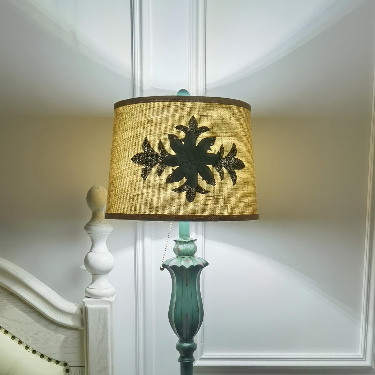 - The frame of the floor lamp is gray-green, green from age. The shade is a cotton and linen textured brown, unlike most white shades, this one is vintage in color and charming.