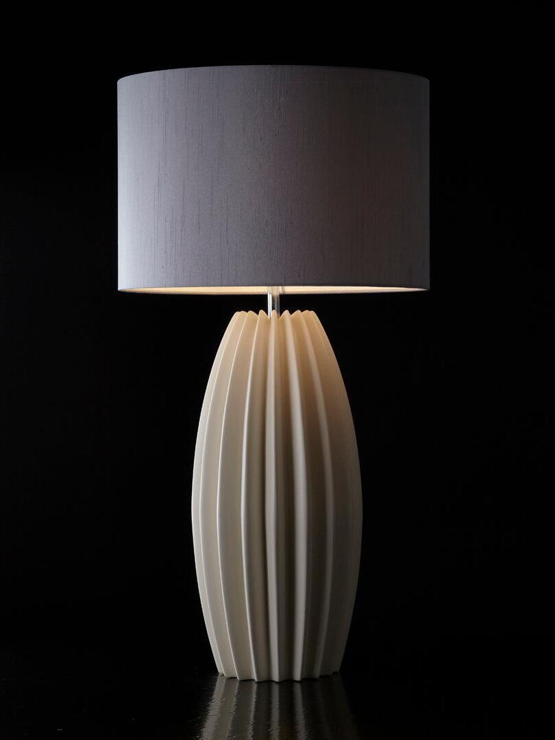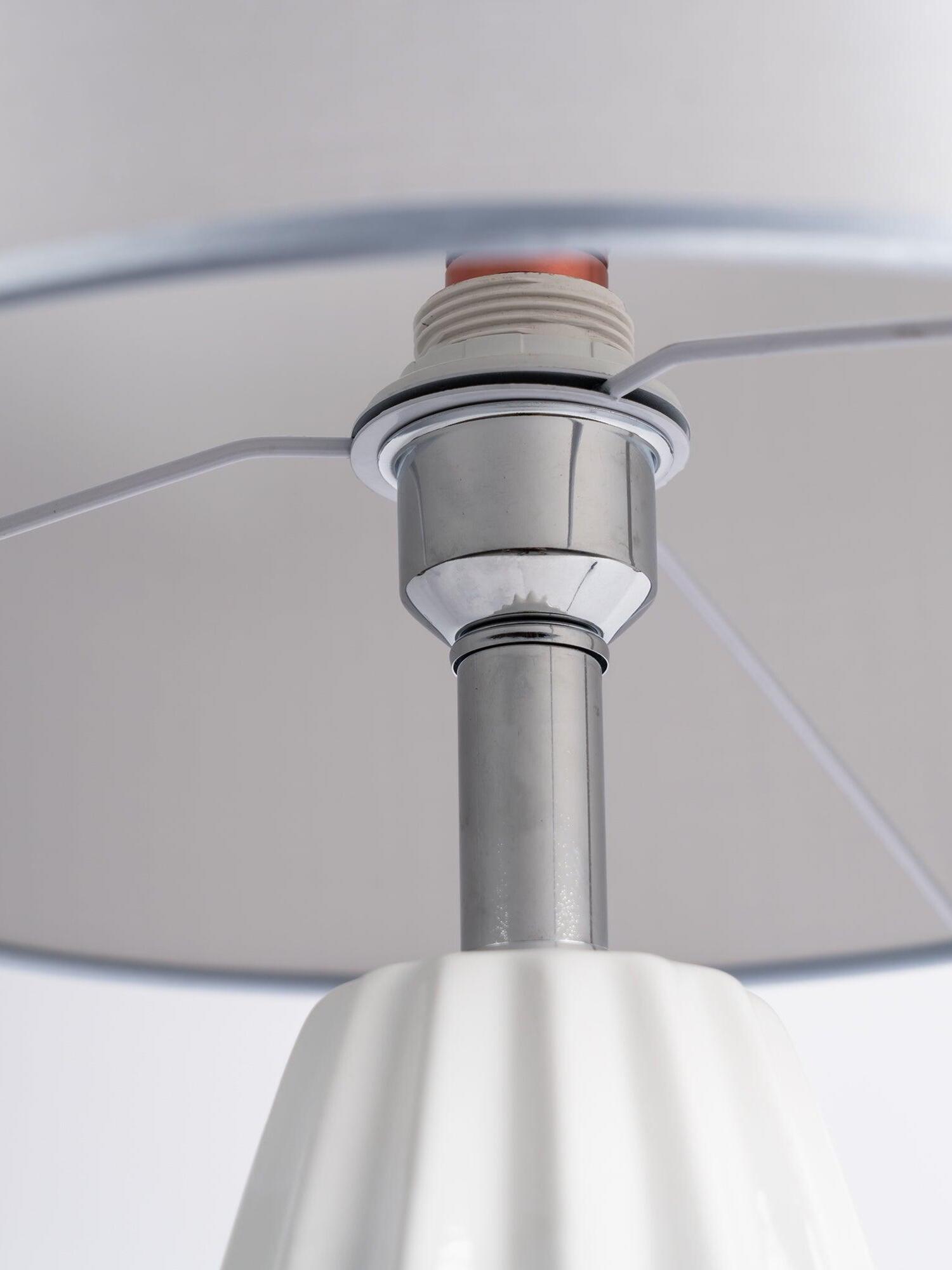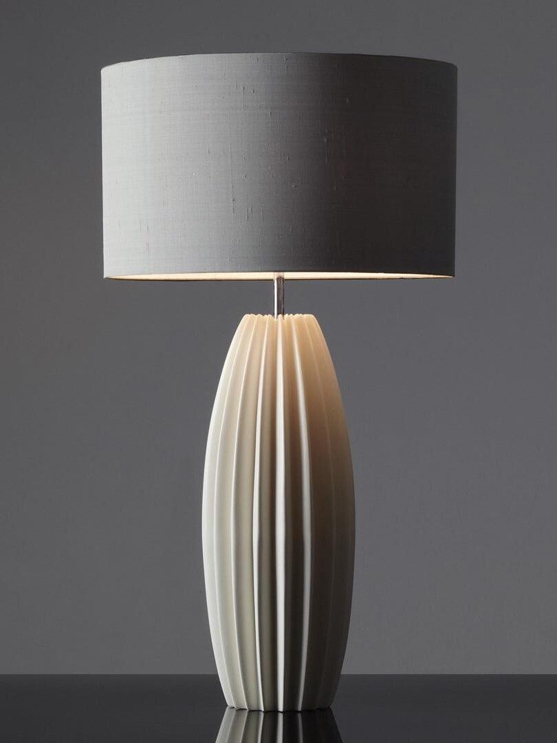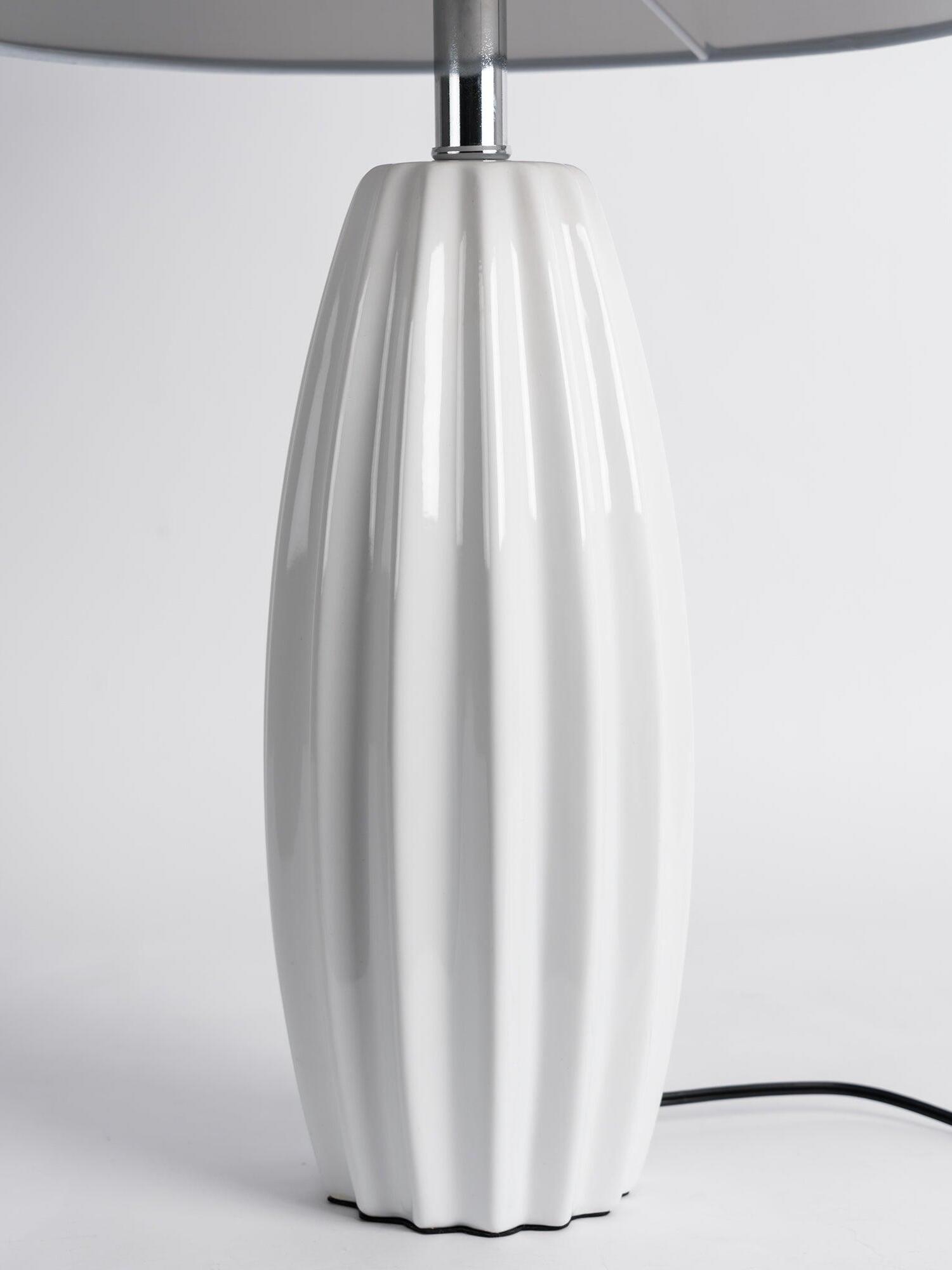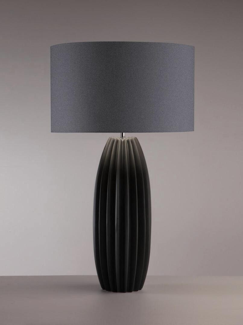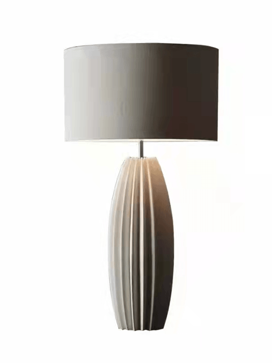 Add the finishing touch to any room in your home with this lovely fluted ceramic table lamp. Atop a brushed brass base, a solid coating of gray glaze gives this ribbed shape a high-gloss finish. Topped with a linen hardback drum shade and paired with brass fittings, the style extends all the way to the plus with a silk-wrapped cord.