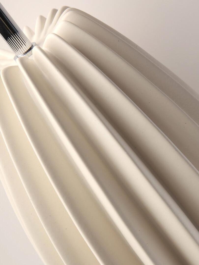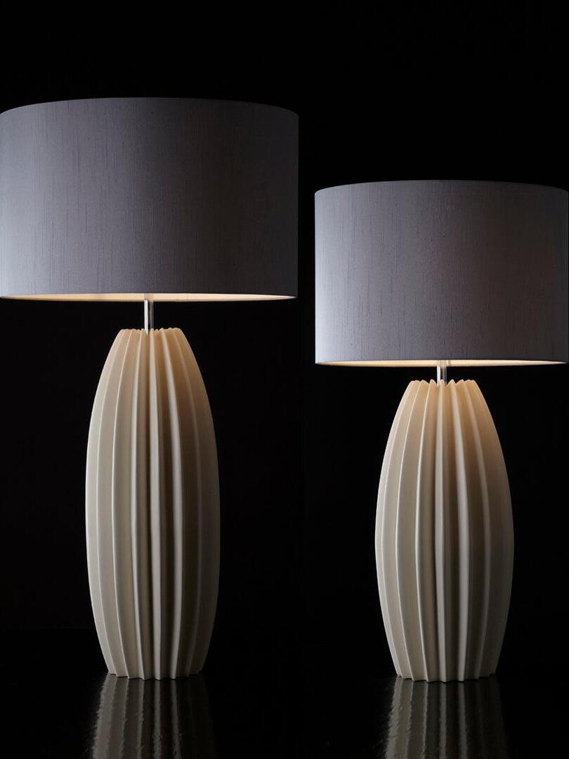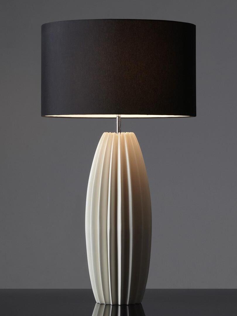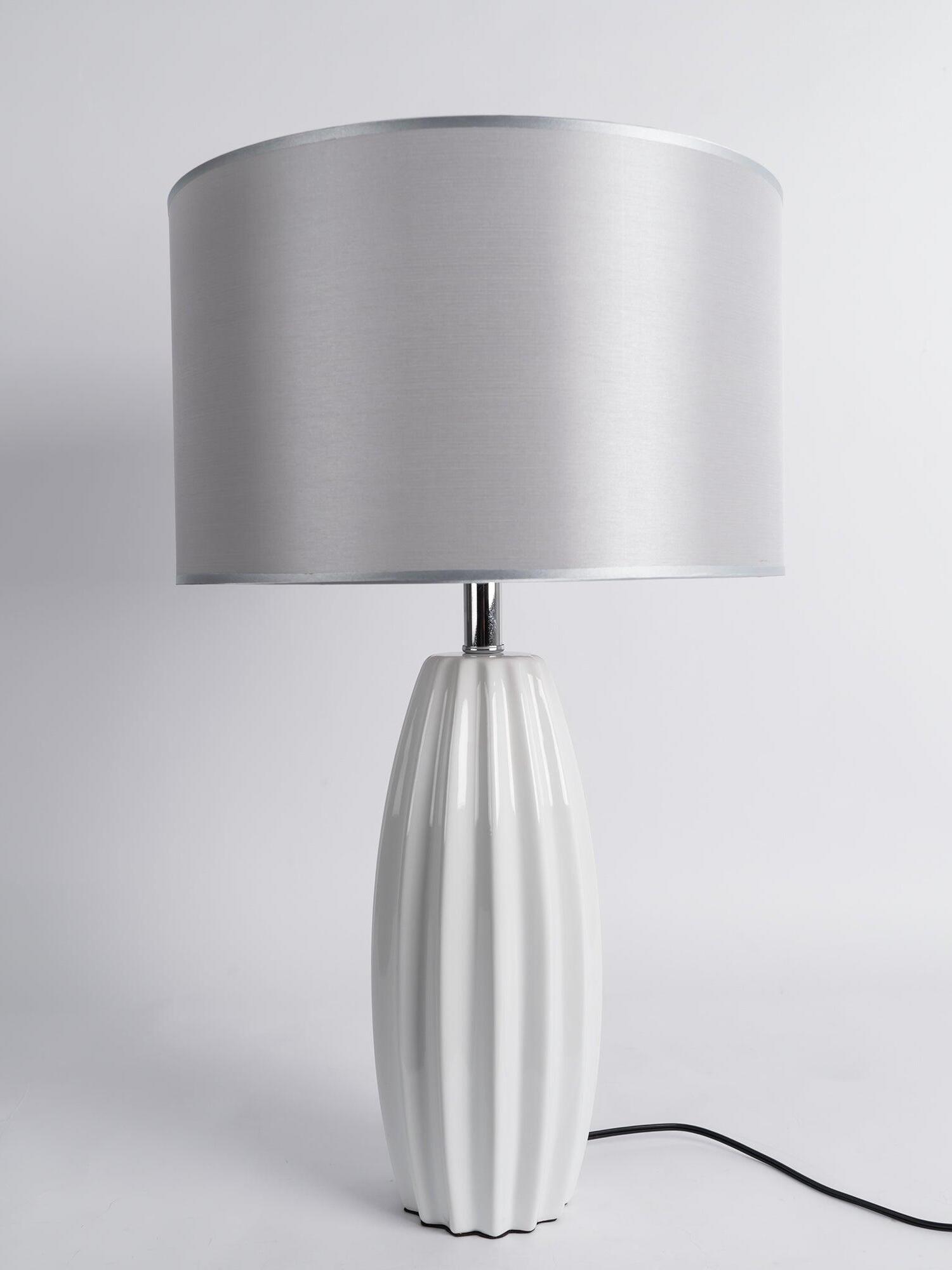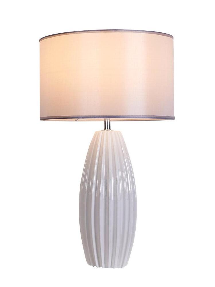 Add the finishing touch to any room in your home with this lovely fluted ceramic table lamp. Atop a brushed brass base, a solid coating of gray glaze gives this ribbed shape a high-gloss finish. Topped with a linen hardback drum shade and paired with brass fittings, the style extends all the way to the plus with a silk-wrapped cord.