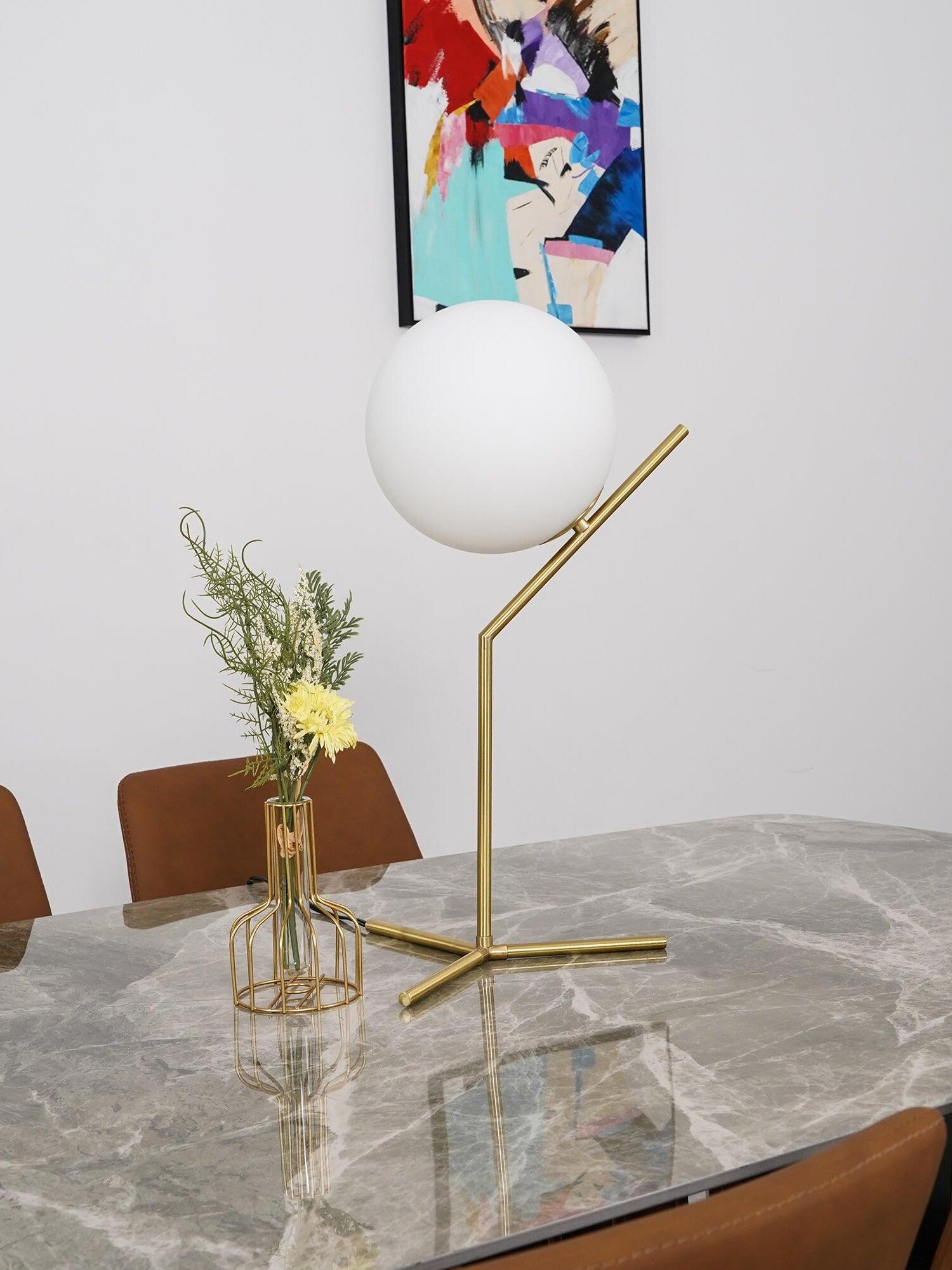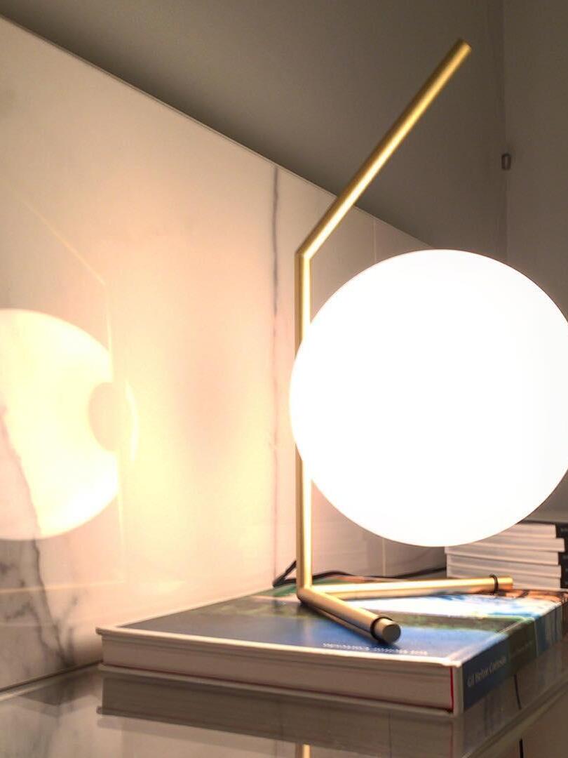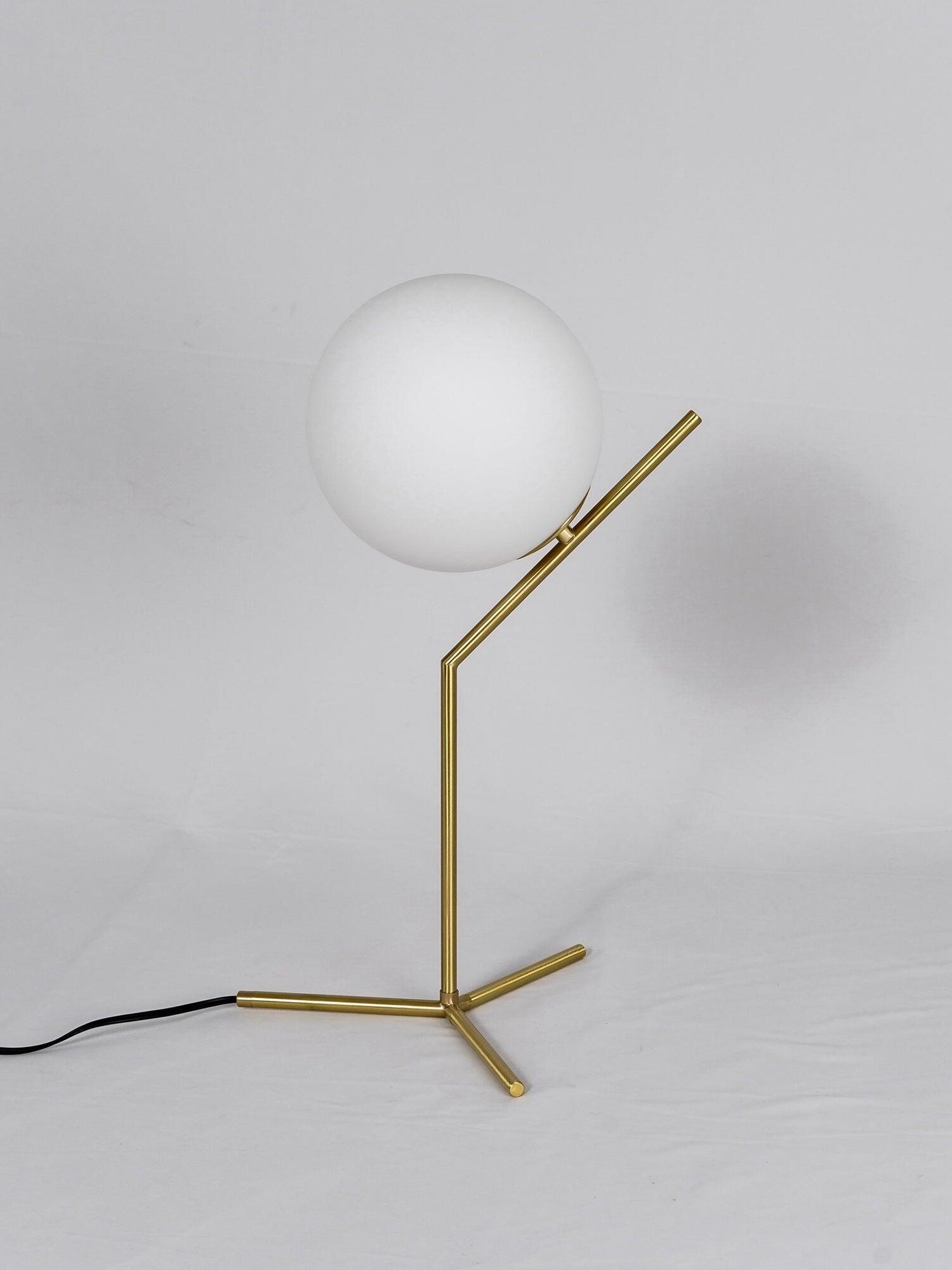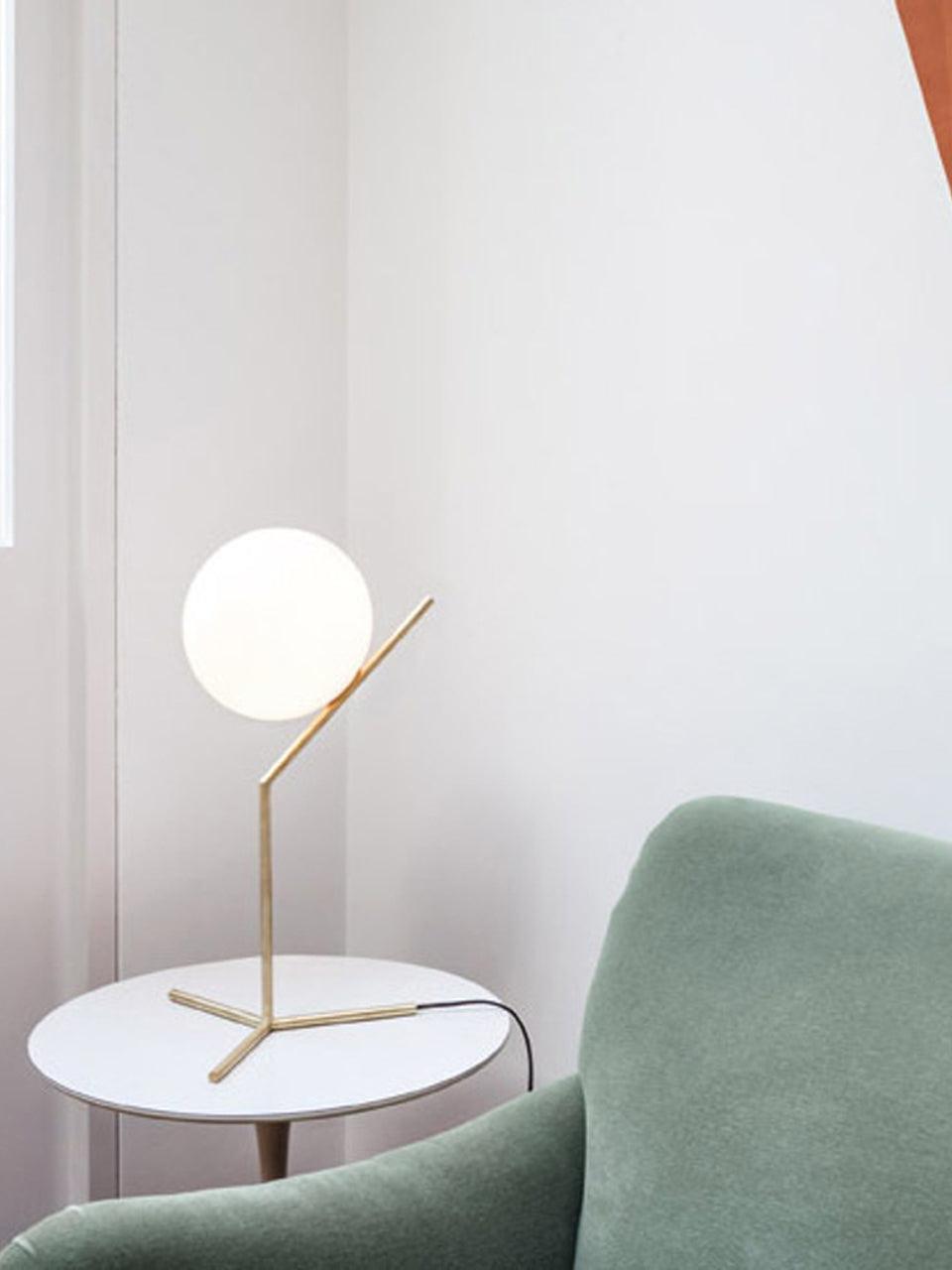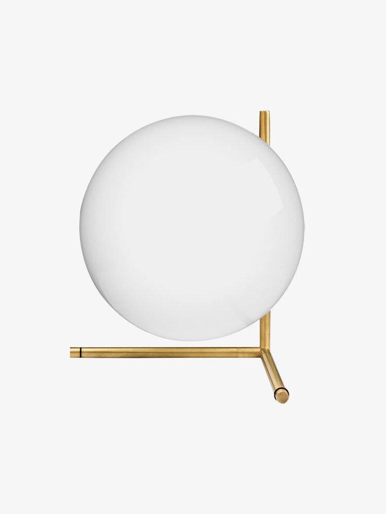 IC Lights Table by renowned designer consists of a brass base that twists and bends at an angle. From there, a blown-glass white orb delicately balances. The table lamp, which casts diffused light, can be adjusted by a dimmer on the power chord. IC Lights T is now available in a brand-new Brass finish that adds dimension to the stunning collection of deceptively simple designs.