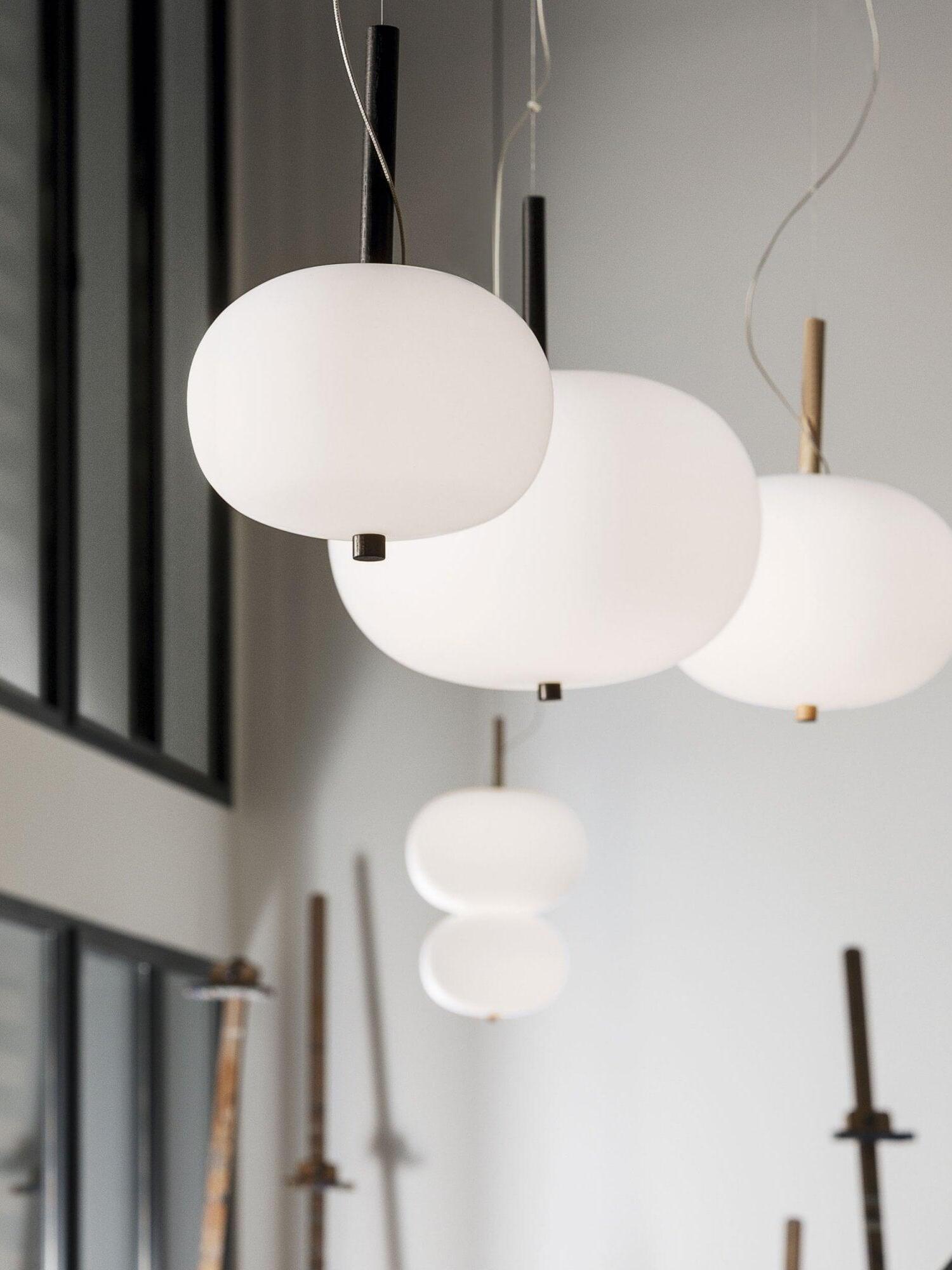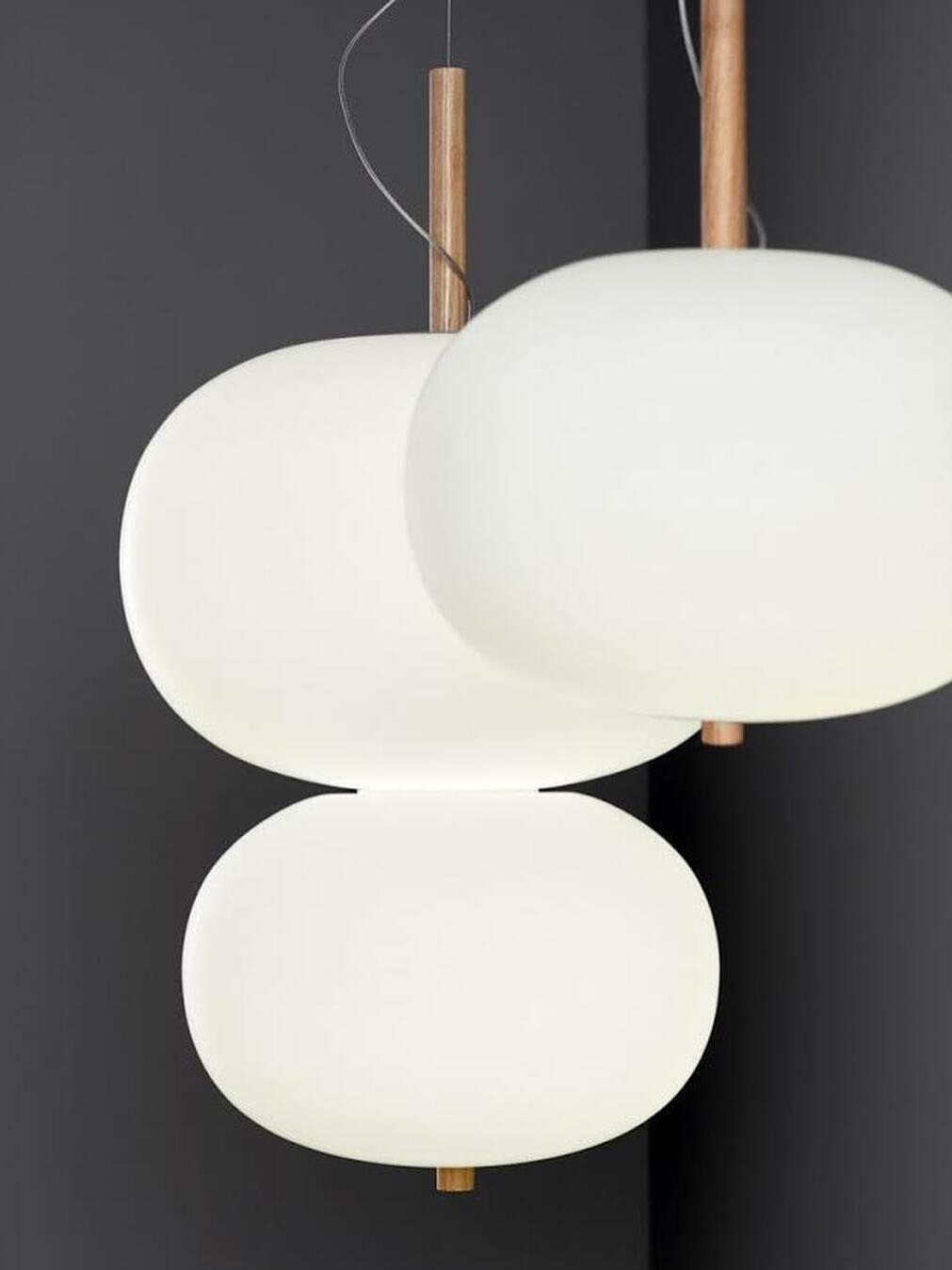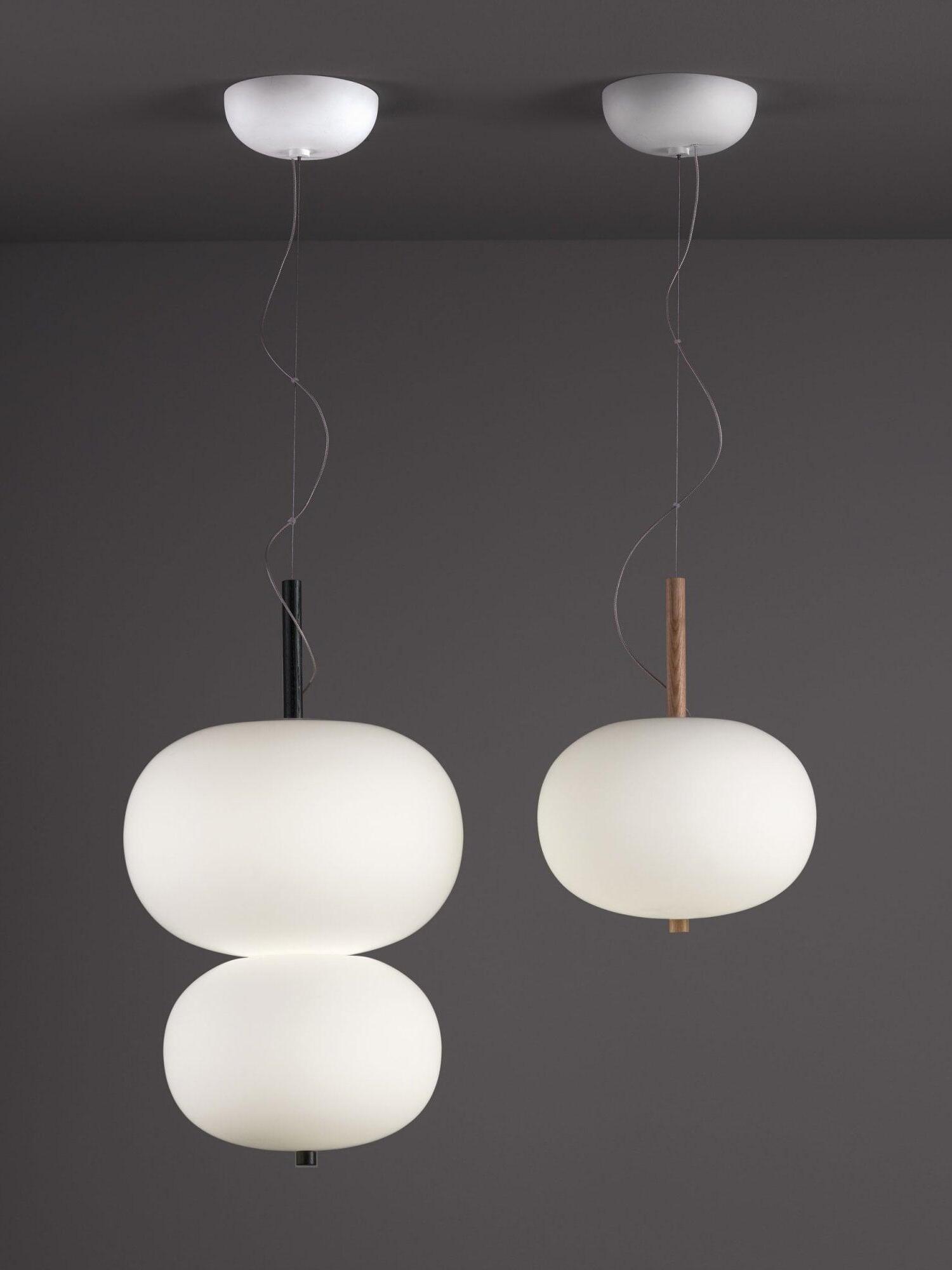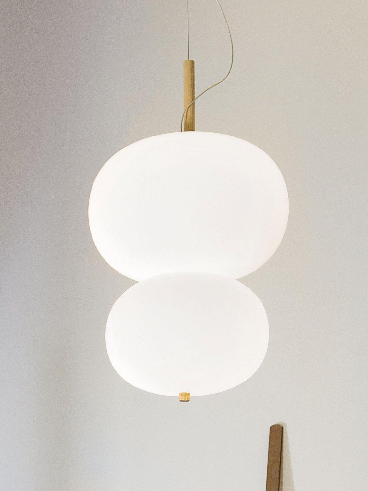 Ilargi lamp takes shape in a subtle and minimalist piece where a wooden wand sits between traditionally hand-blown glass spheres.Its warm, timeless design provides soft, pleasant light that adapts to professional and domestic settings, creating comfortable, natural spaces.