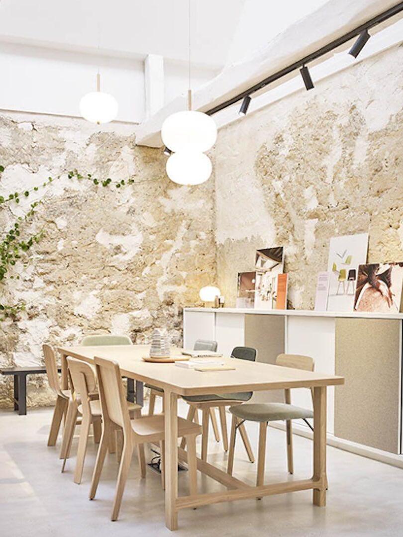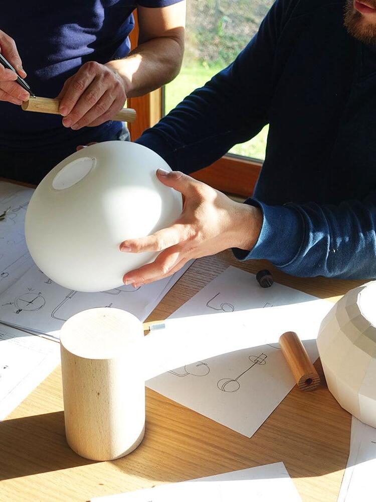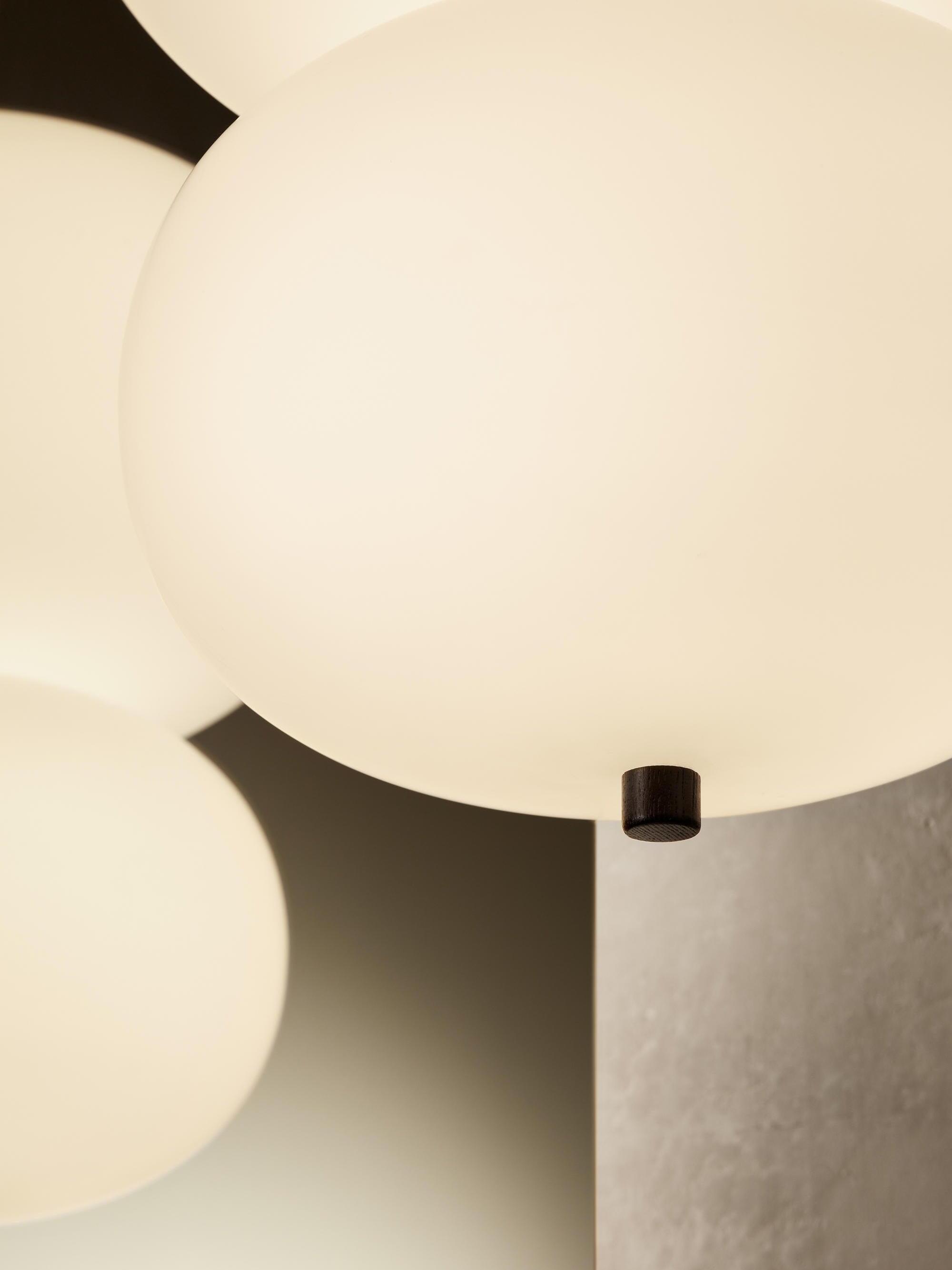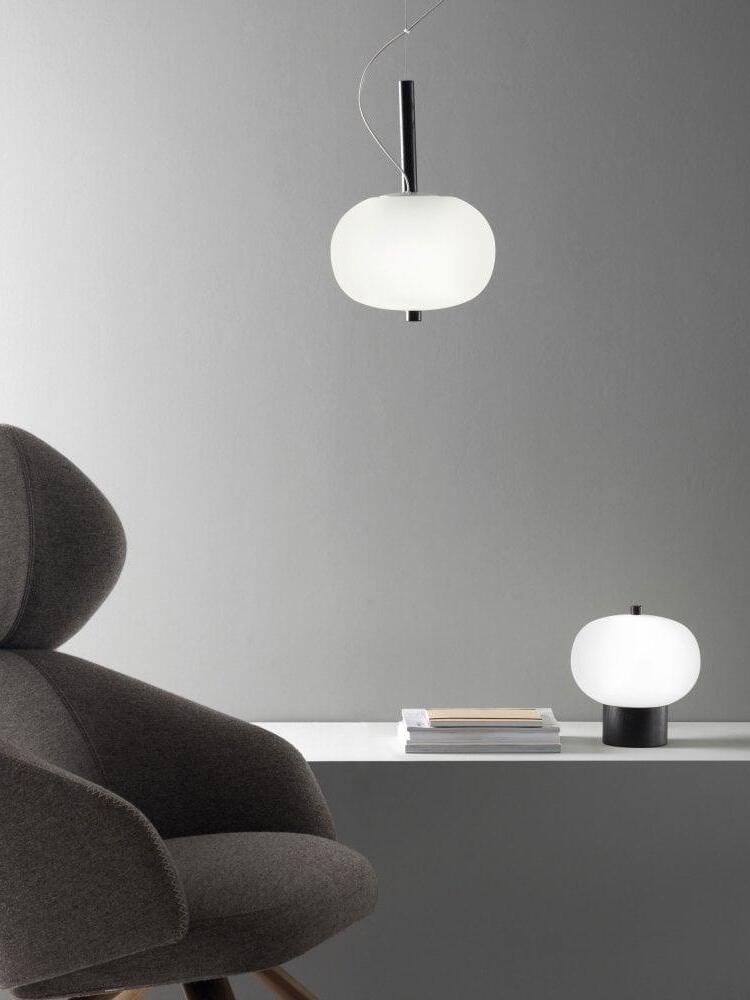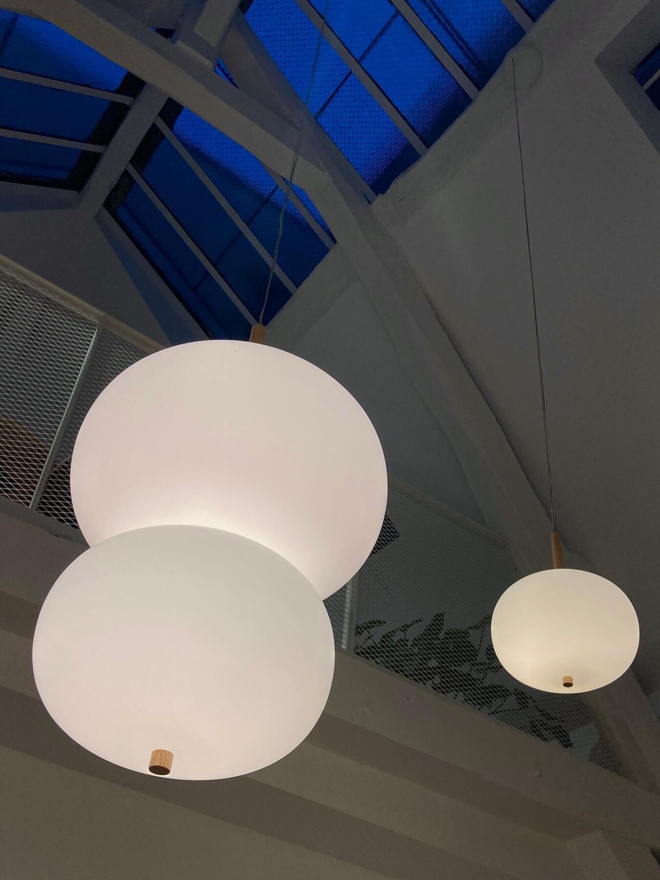 Ilargi lamp takes shape in a subtle and minimalist piece where a wooden wand sits between traditionally hand-blown glass spheres.Its warm, timeless design provides soft, pleasant light that adapts to professional and domestic settings, creating comfortable, natural spaces.