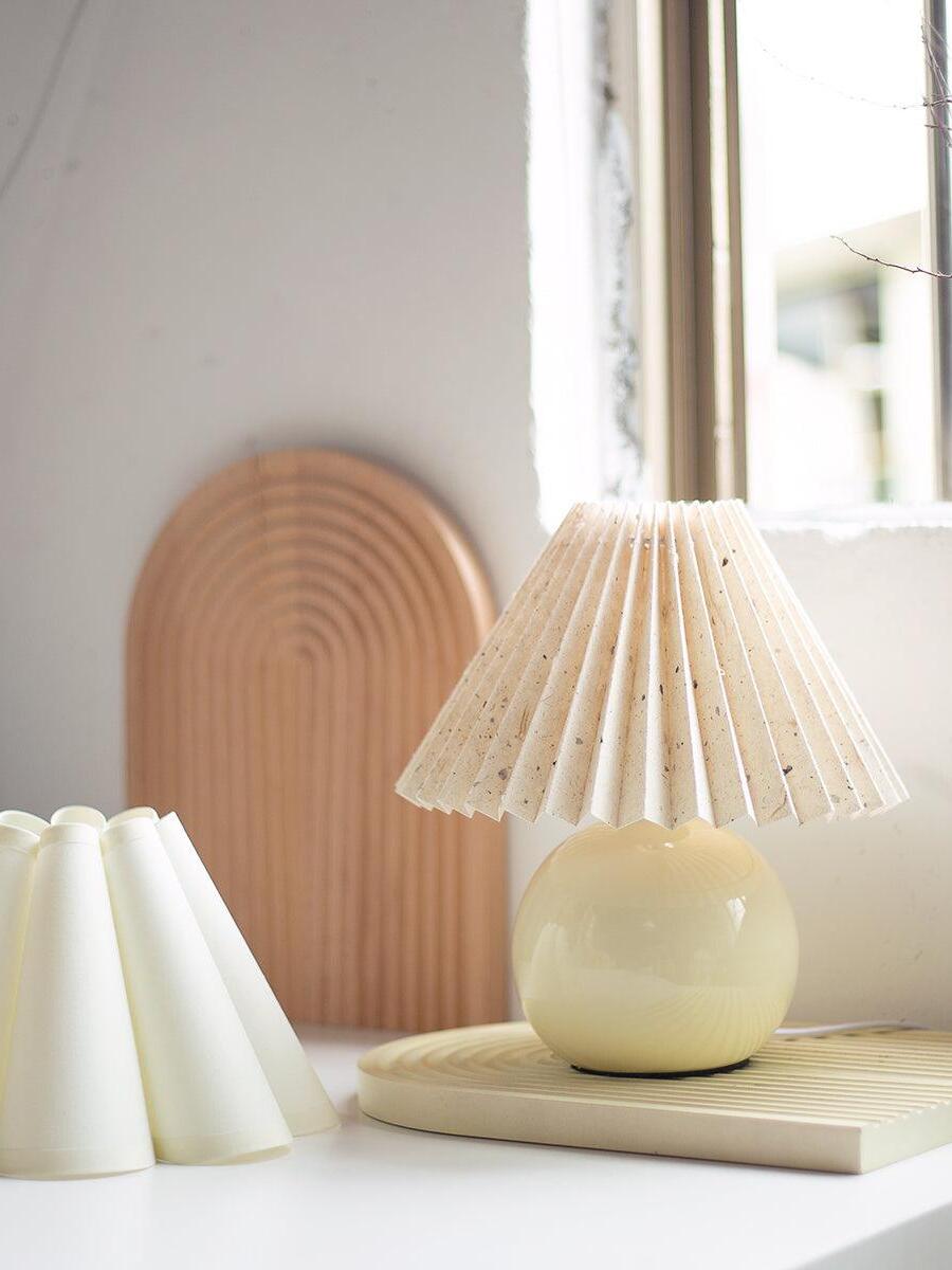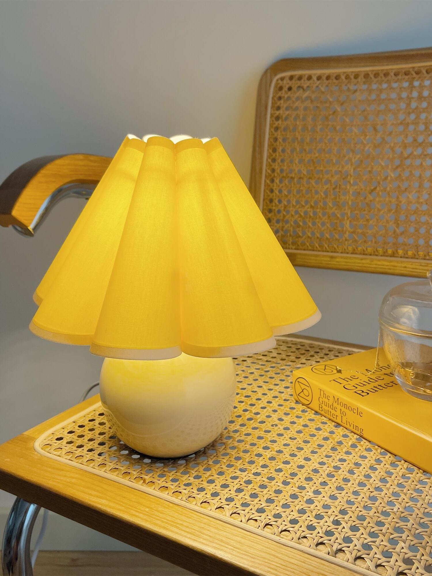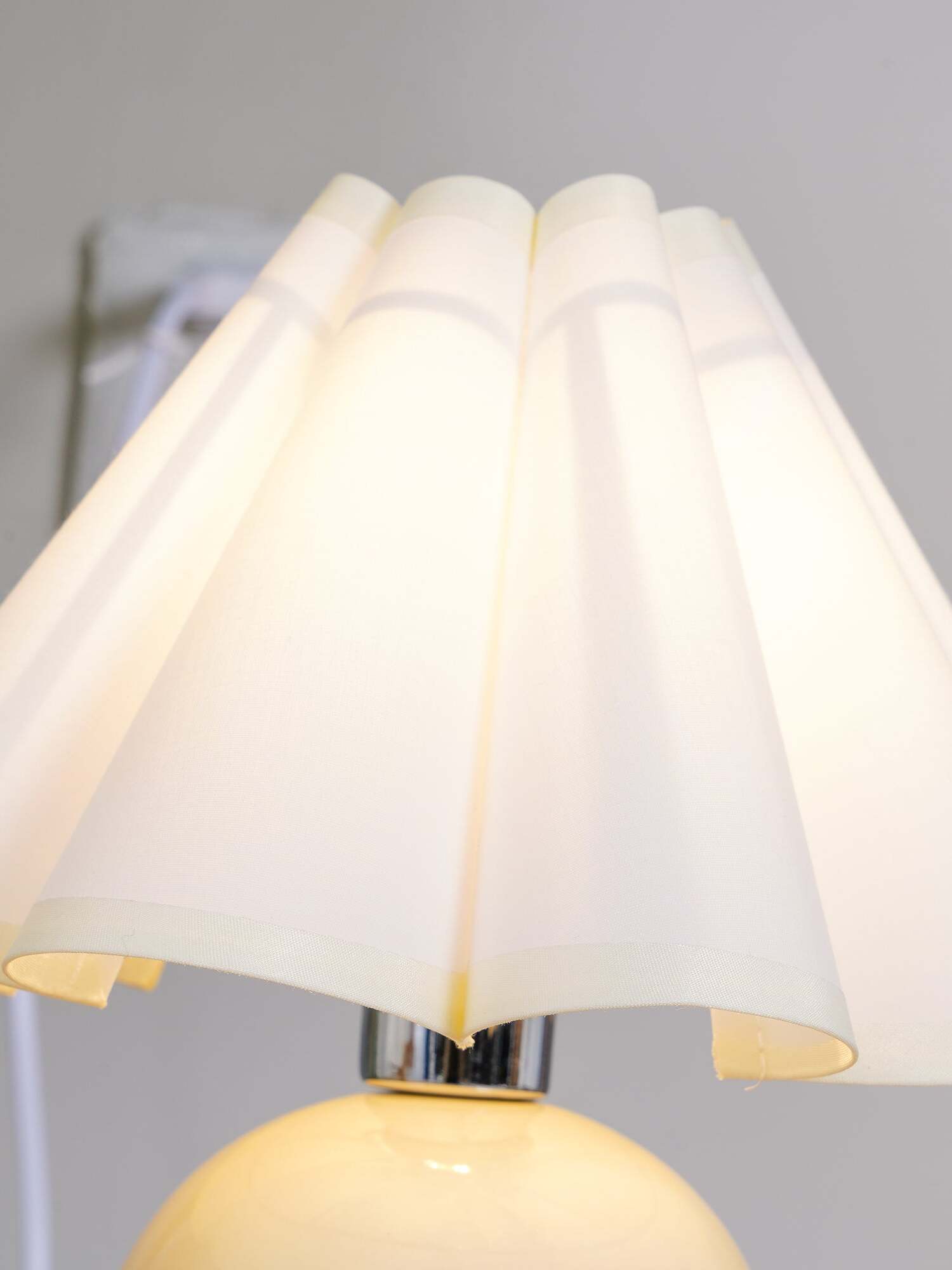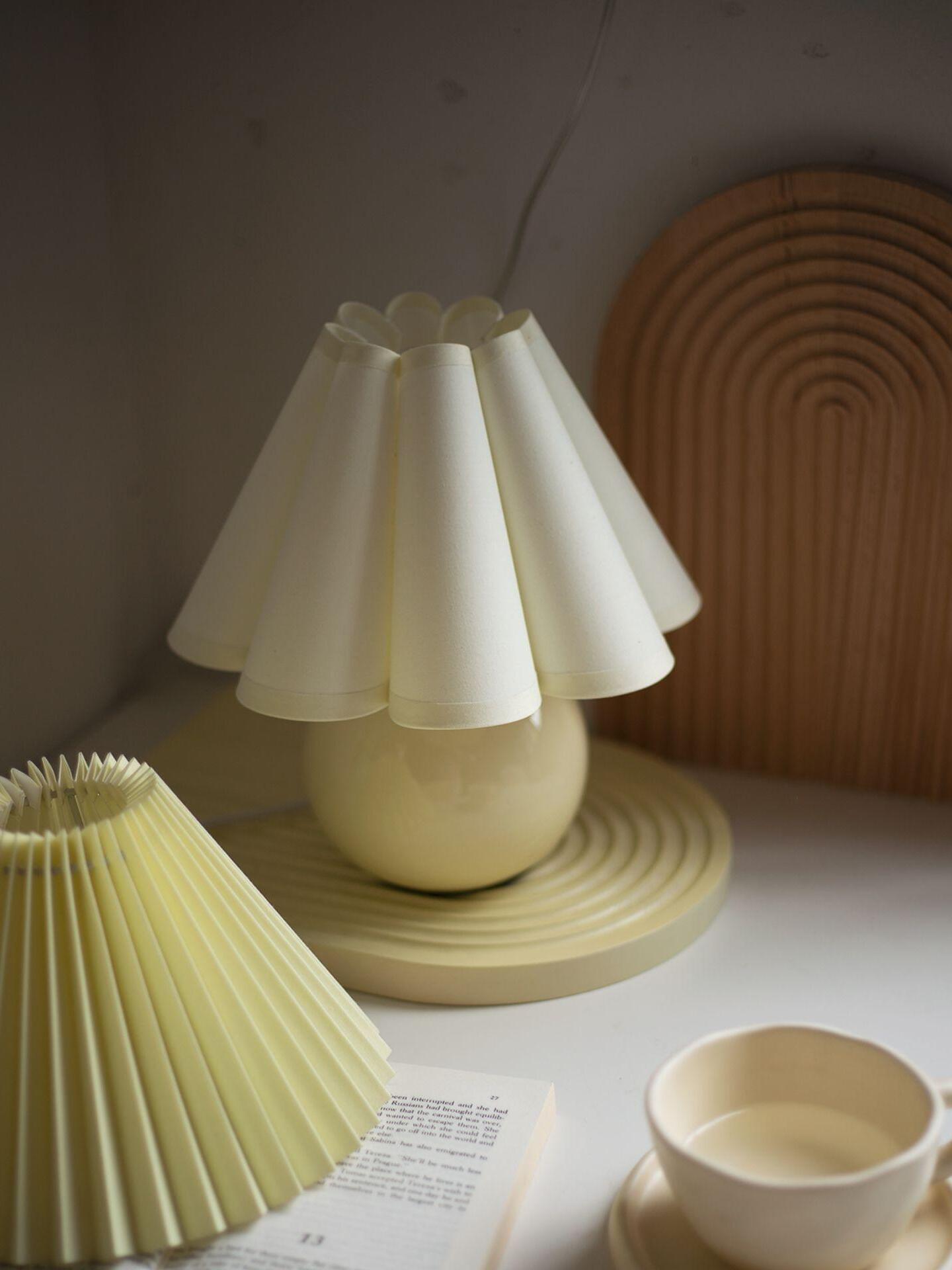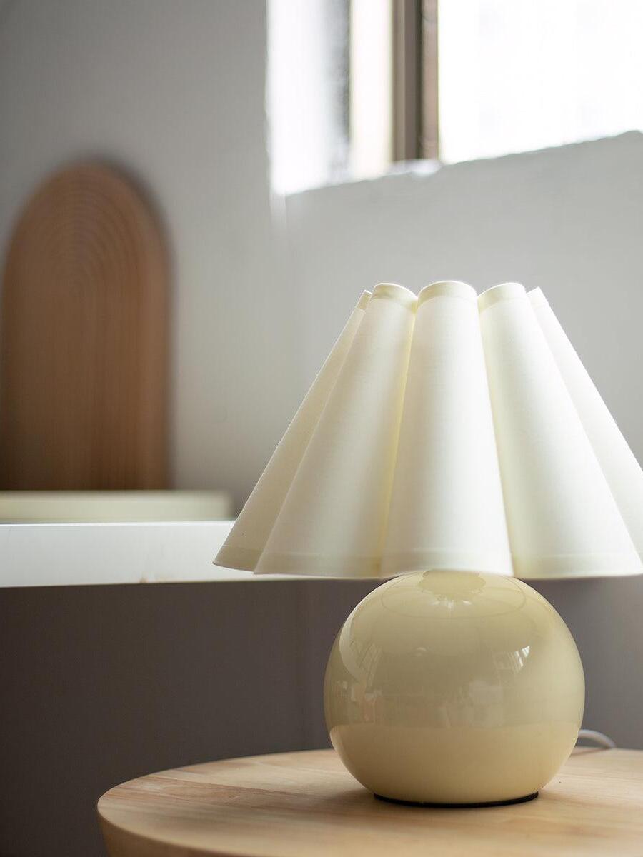 Kicsi '(pronounced "Kitchi", meaning 'mini' in Hungarian). Our white Kicsi Pleated Table Lamp features a vintage style linen pleated shade, and white ceramic body. This mushroom pleated hardback shade in creme has a traditional look. The fold over trim adds a soft touch to the pleated shade.