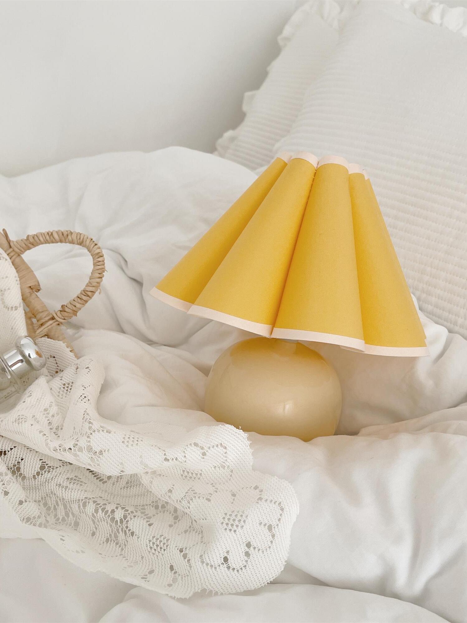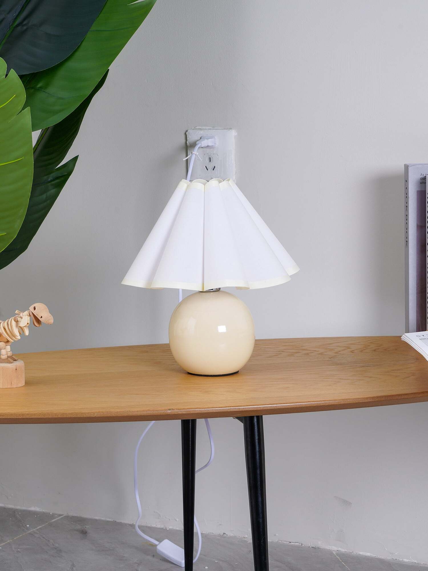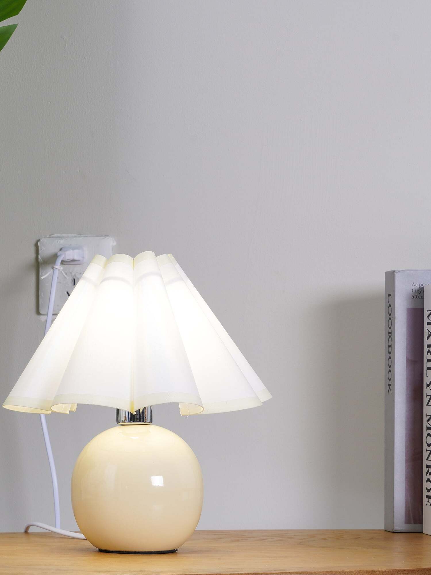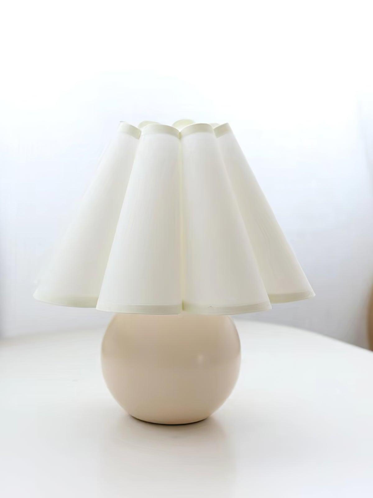 Kicsi '(pronounced "Kitchi", meaning 'mini' in Hungarian). Our white Kicsi Pleated Table Lamp features a vintage style linen pleated shade, and white ceramic body. This mushroom pleated hardback shade in creme has a traditional look. The fold over trim adds a soft touch to the pleated shade.